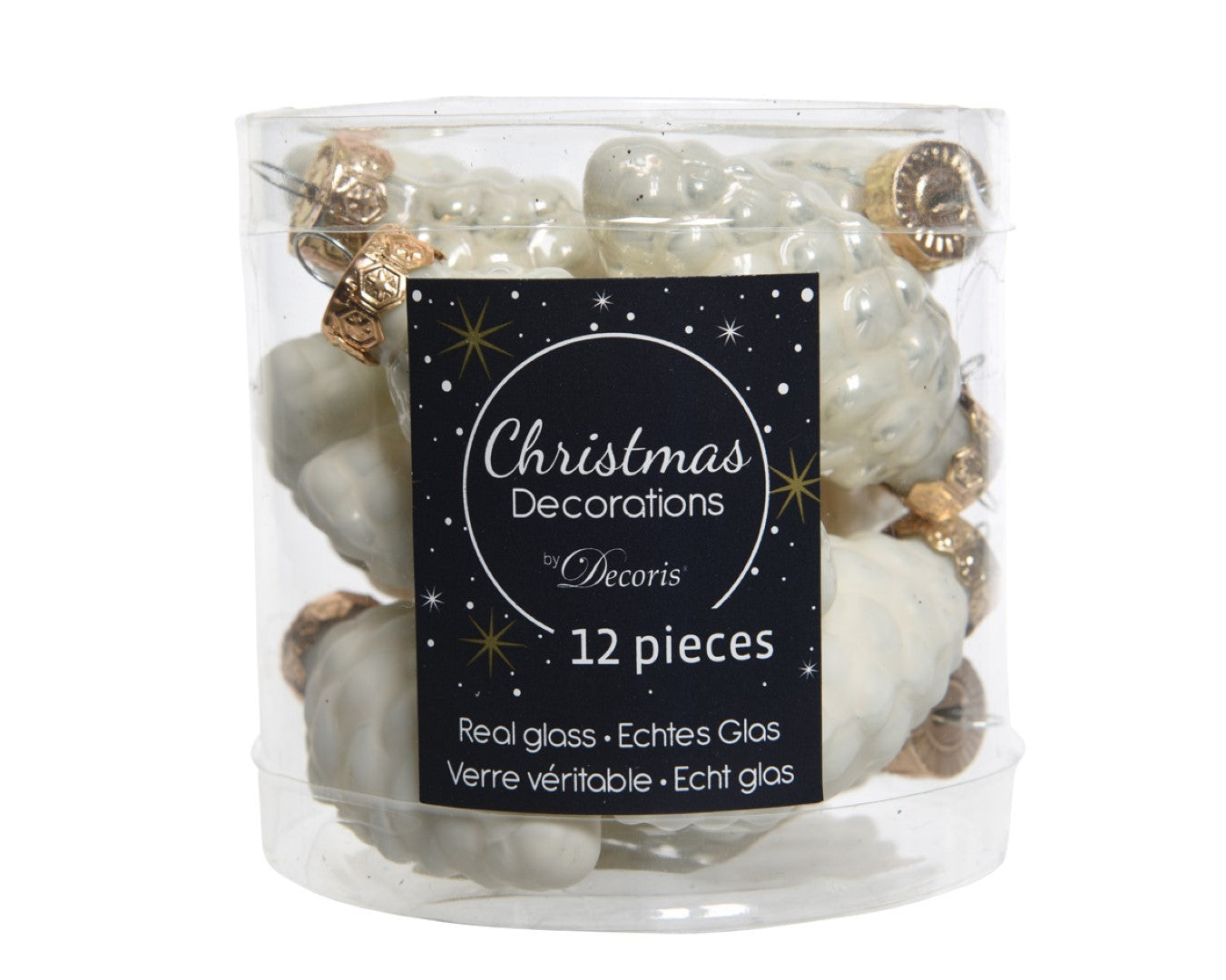 Decoris 2 stuks 12 Glazen dennenappels 40 mm wol wit