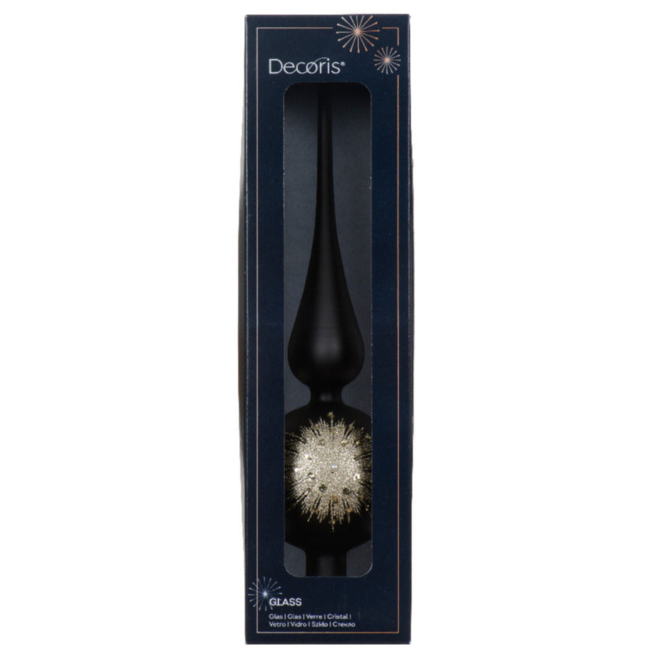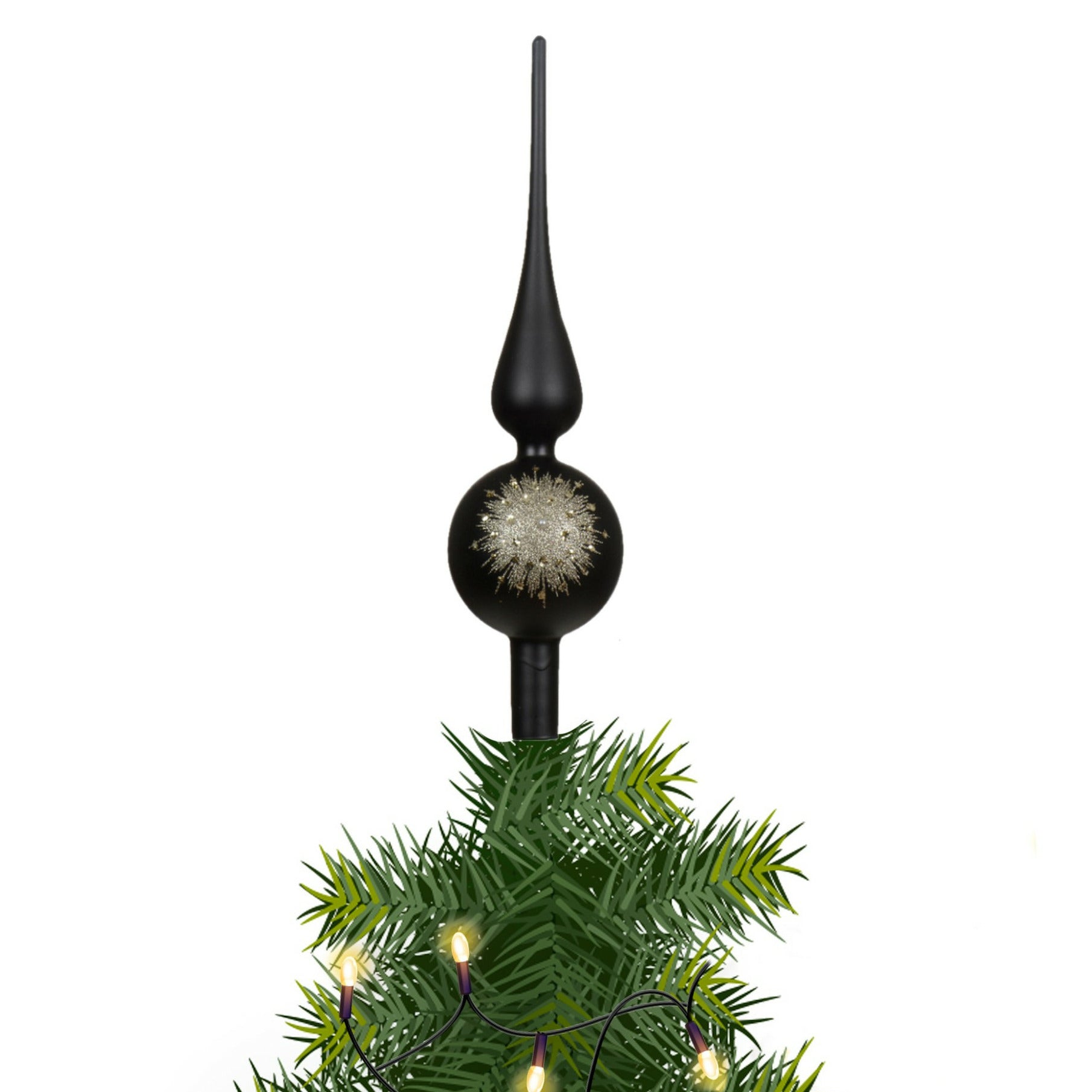 Glazen kerstboompiek in de kleur zwart met een luxe afwerking. Breng een vleugje zachtheid en elegantie in je kerstversiering met deze prachtige gedecoreerde kerst piek. Met zijn betoverende kleur en verfijnde zwarten details is deze piek een perfecte keuze om je kerstboom te laten stralen tijdens de feestdagen. De kleur van het glas zorgt voor een warme en uitnodigende uitstraling, waardoor je kerstboom een charmant en verfijnd accent krijgt. Met een diameter van 8 cm en een hoogte van 31 cm is deze piek perfect geschikt voor de meeste kerstbomen.