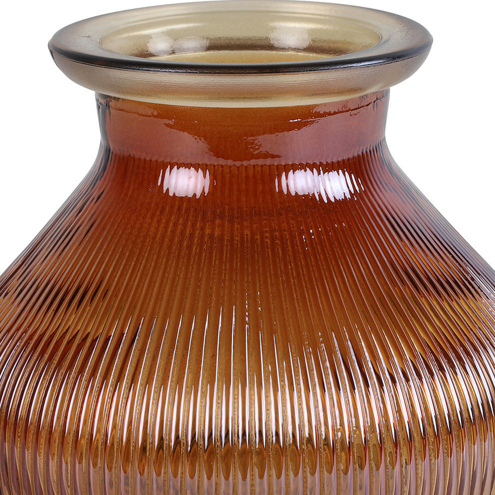 Bloemenvaas gemaakt van kastanje bruin/transparant glas. Laag tafel model voor kleine bloemen/takken/boeketten. Afmetingen: H12 cm en D15 cm onderzijde. Voor binnen gebruik. De vaas heeft een stijlvolle lengte streep ribbel motief.