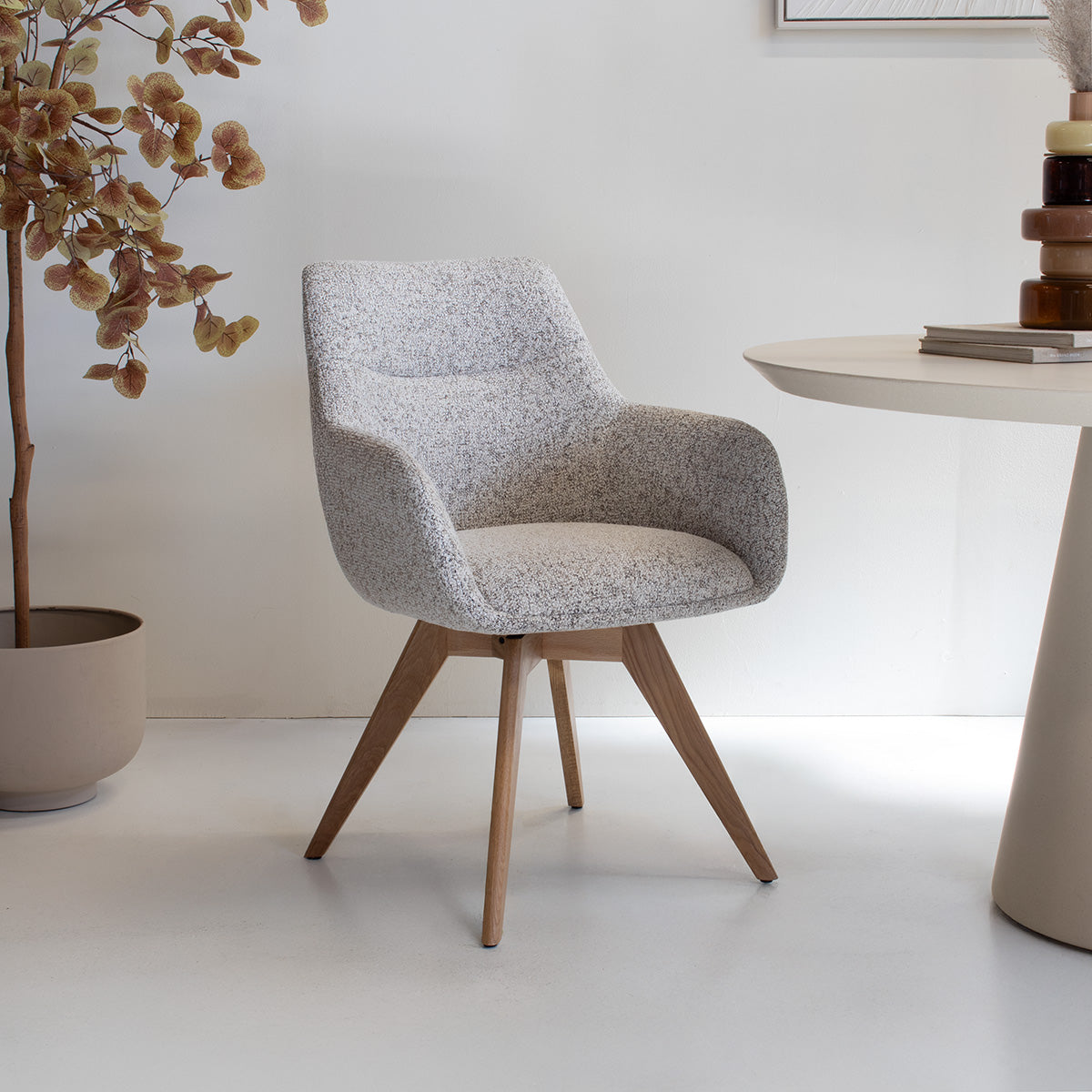 Maak kennis met de DÉJA Eetkamerstoel Noé in een prachtige beige kleur, een perfecte aanvulling op je Scandinavische interieur. Deze stoel combineert de natuurlijke charme van eikenhout met de zachte elegantie van stof, waardoor het een stijlvolle en comfortabele keuze is voor je eetkamer. De draaibare functie voegt een speelse en praktische touch toe, terwijl de hoogwaardige materialen zorgen voor duurzaamheid en langdurig gebruik. Met zijn tijdloze ontwerp en neutrale kleur past deze stoel moeiteloos in elke ruimte.