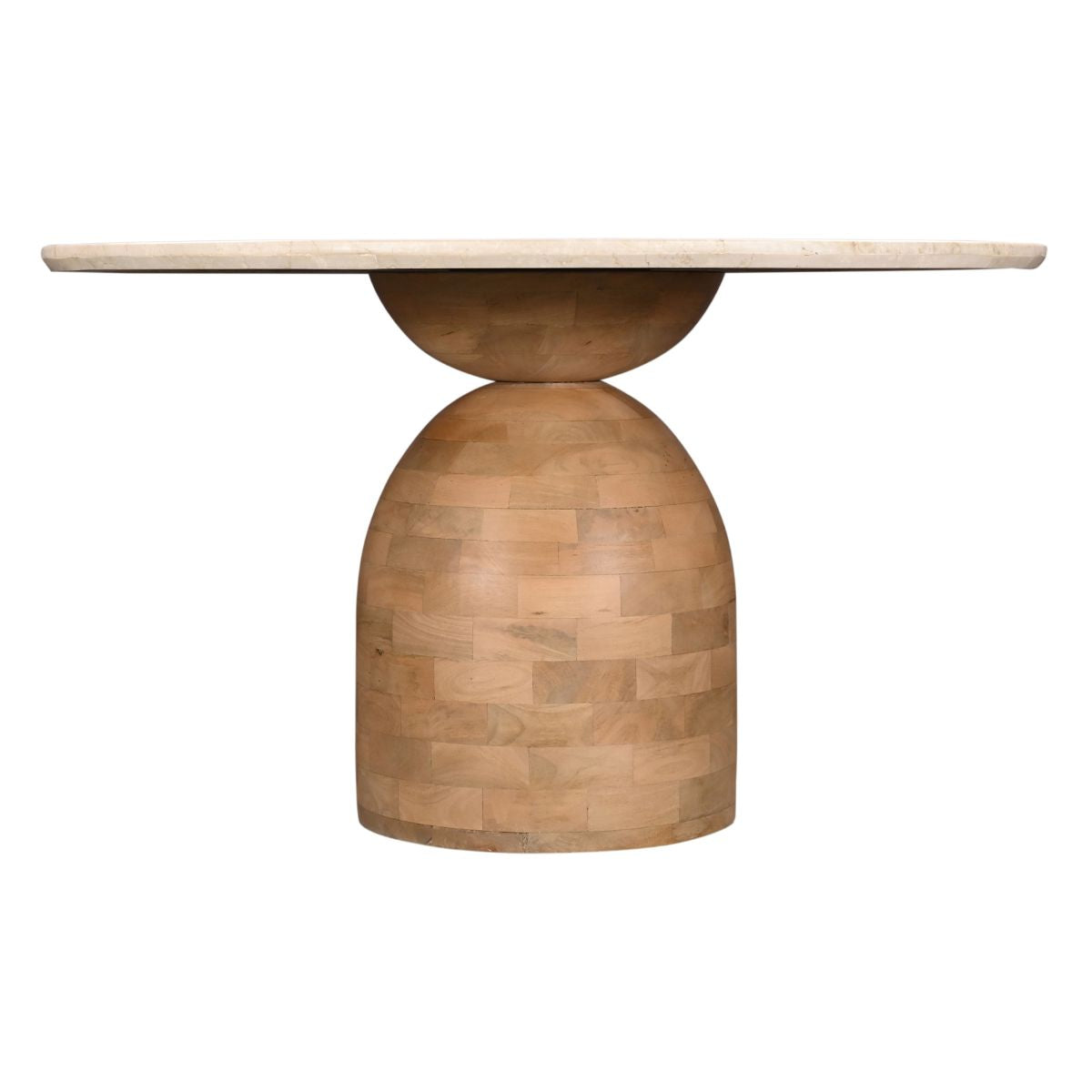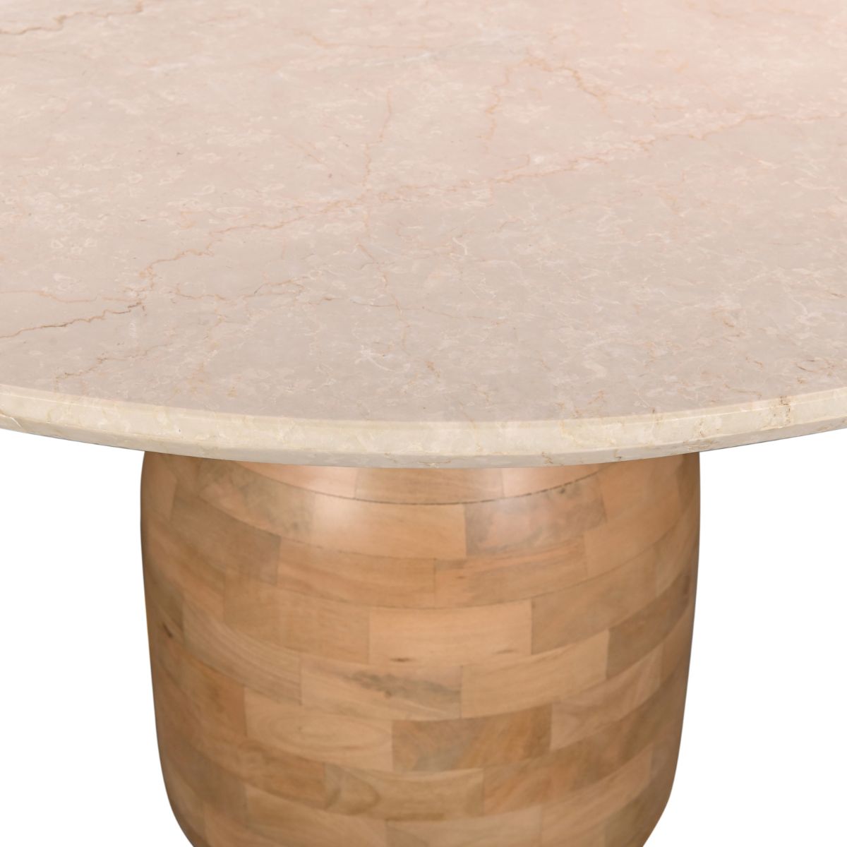Materiaal: Het tafelblad van de Miro eettafel is vervaardigd uit hoogwaardig marmer, wat zorgt voor een luxe uitstraling en duurzaamheid. Het onderstel is gemaakt van mangohout, wat bekend staat om zijn stevigheid en duurzaamheid. Deze combinatie van materialen maakt de tafel zowel stijlvol als robuust.