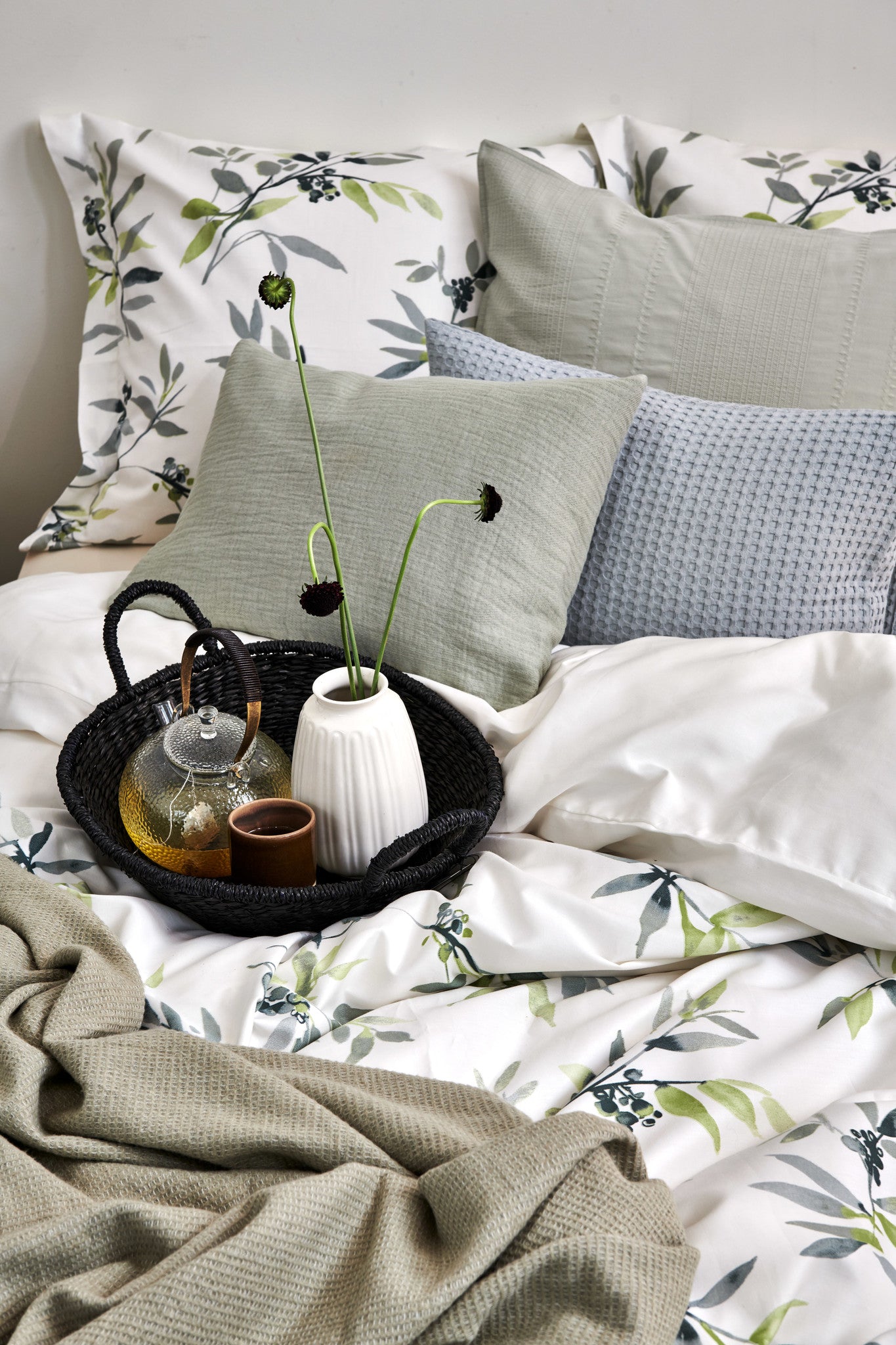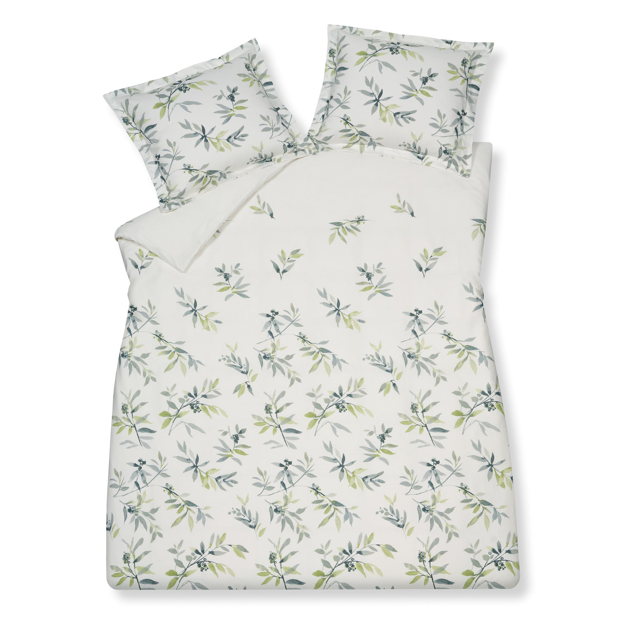 Dekbedovertrek met een speelse print van kleine bladertakjes en besjes. Frisse combi van offwhite met lichtgroen en grijsblauwe kleuren. De print is aan de bovenzijde en aan de onderzijde hetzelfde. Maat 240 x 200/220 cm (lits jumeaux dekbedovertrek met 2 kussenslopen) Kleur Pearl Blue-190 Kwaliteit 100% satijnkatoen Kussensloop voorzien van Oxford rand Print Bovenzijde: Print Happy Onderzijde: Print Happy Instopstrook Ja (ruime flessenhals) Wasvoorschriften Machine wasbaar op 40 graden (donkere kleuren) of 60 graden (lichte kleuren) Drogen op lage temperatuur Heet strijken