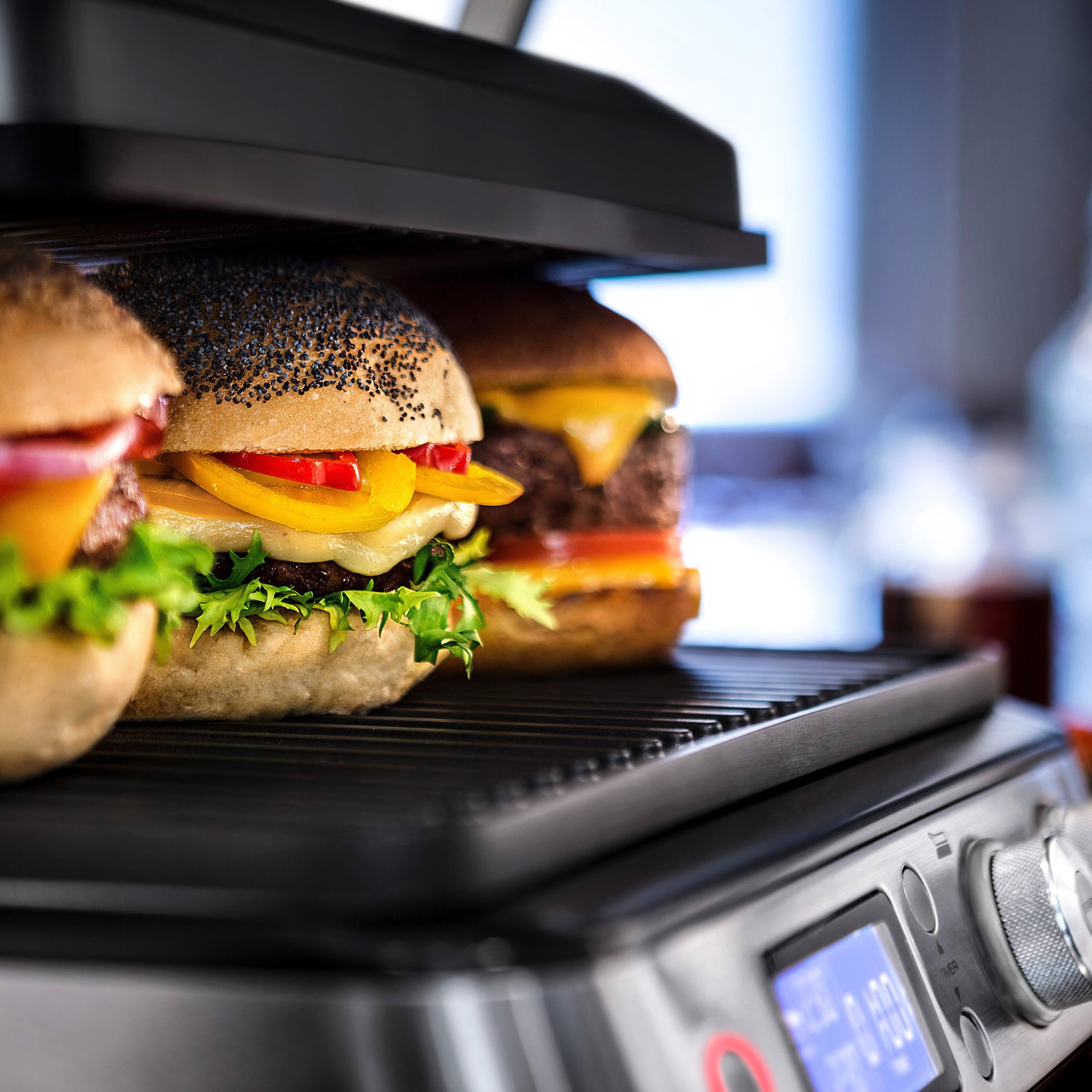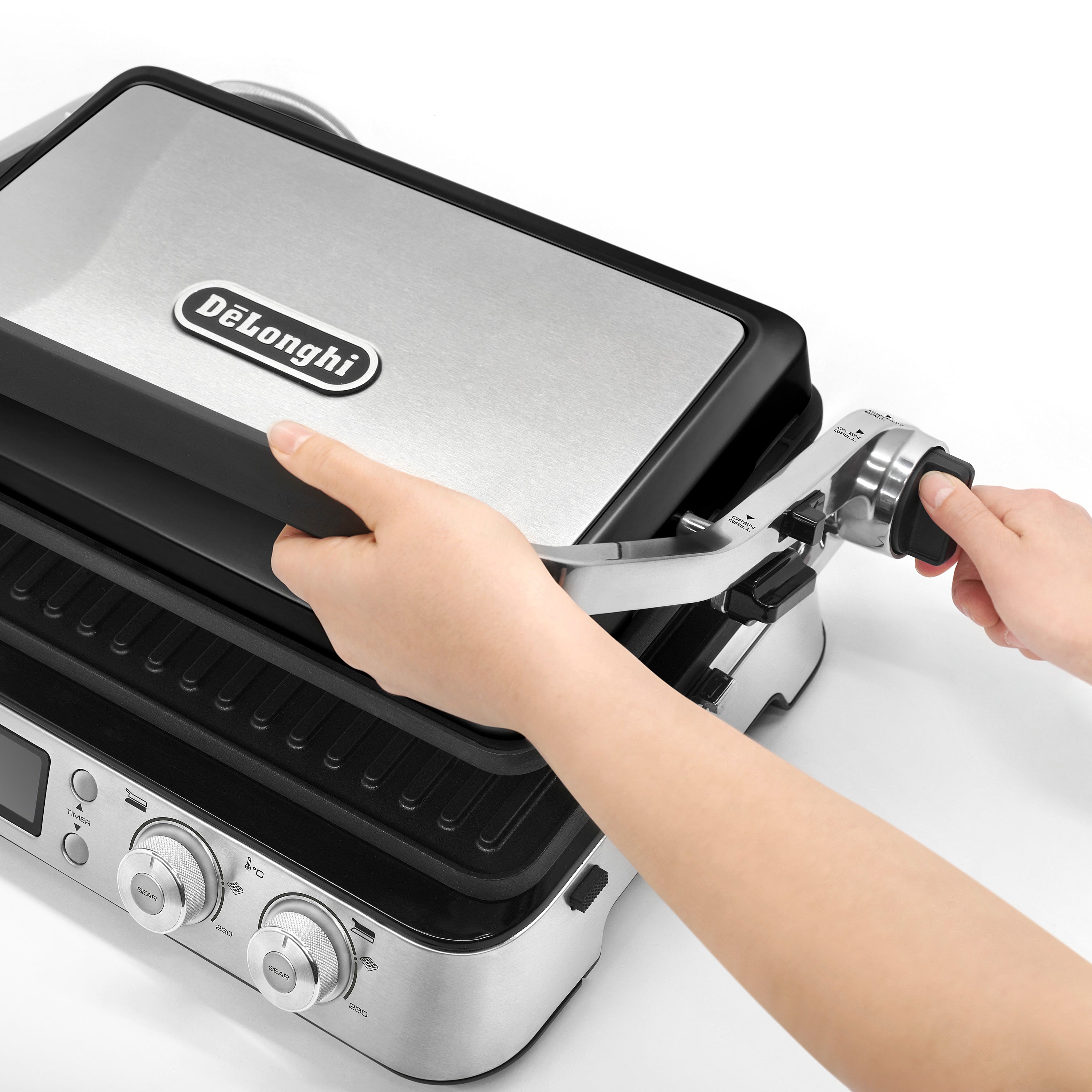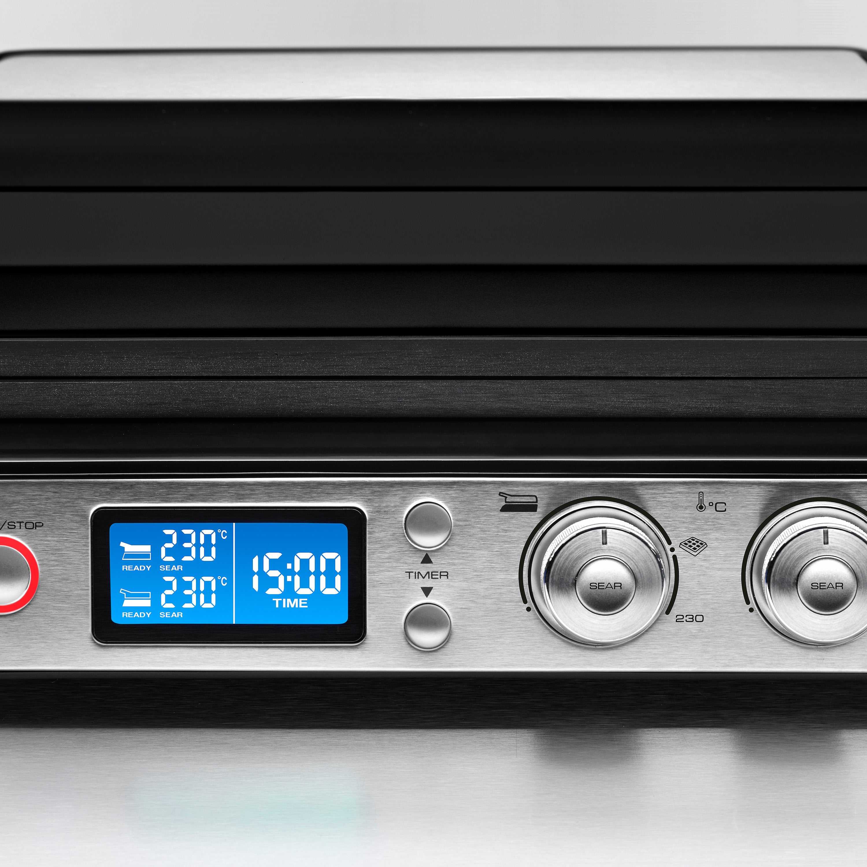 Eenvoudig in gebruik Dankzij het digitale LED display kun je de temperatuur nauwkeurig instellen. De elektrische temperatuurregeling zorgt voor een zeer precieze en constante warmteverdeling over het hele oppervlak. De twee thermostaten regelen de temperatuur van de bovenste en onderste grillplaten onafhankelijk van elkaar. Met de geïntegreerde timer kun je de bereidingstijd tot op de minuut instellen. Als de tijd verstreken is, wordt de grill automatisch uitgeschakeld.