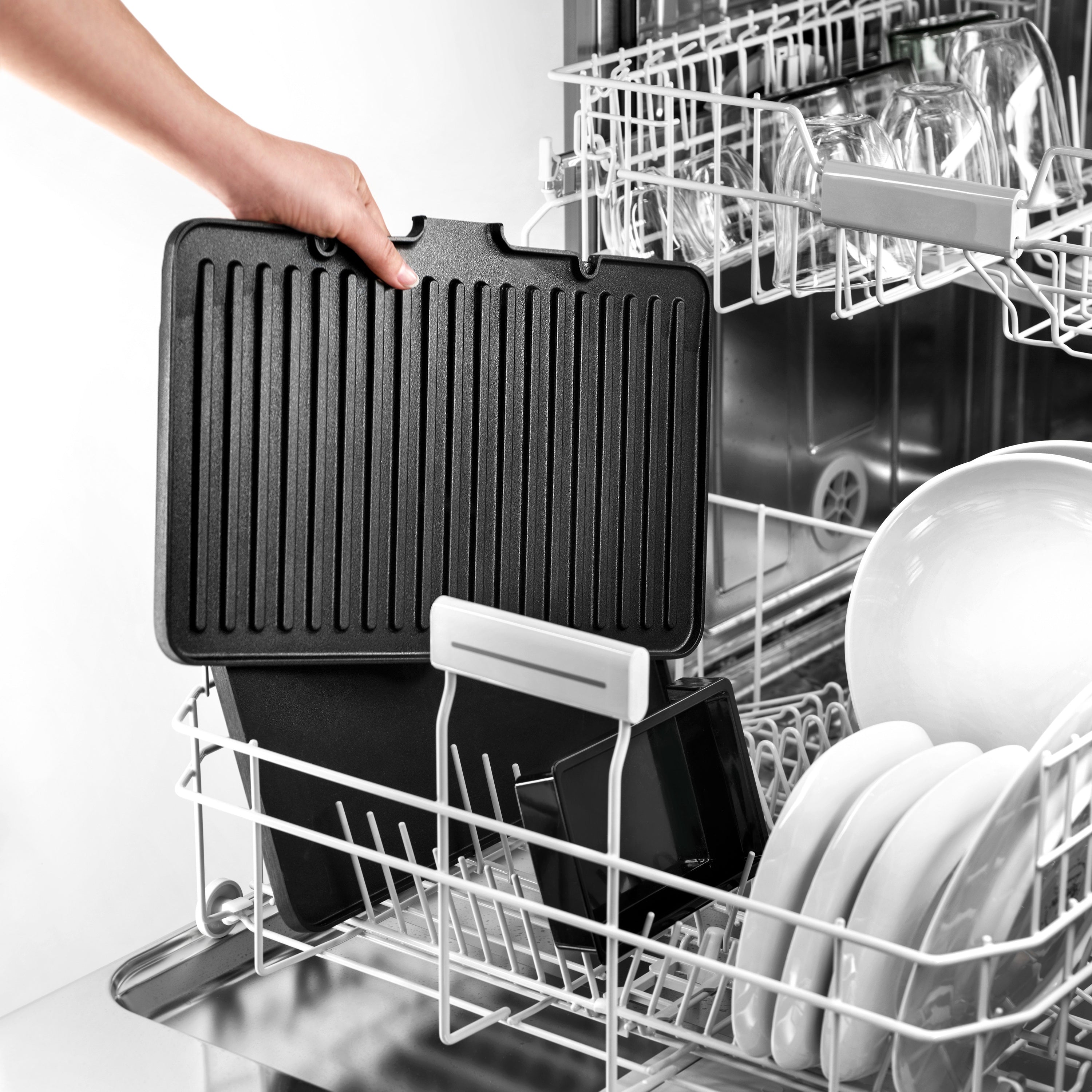 Nooit meer schrobben De gegoten grillplaten zijn afneembaar en vaatwasserbestendig voor een eenvoudige reiniging. Je hoeft dus nooit meer de platen schoon te schrobben! Ook de geïntegreerde vetopvangbak kun je gewoon in de vaatwasser zetten.