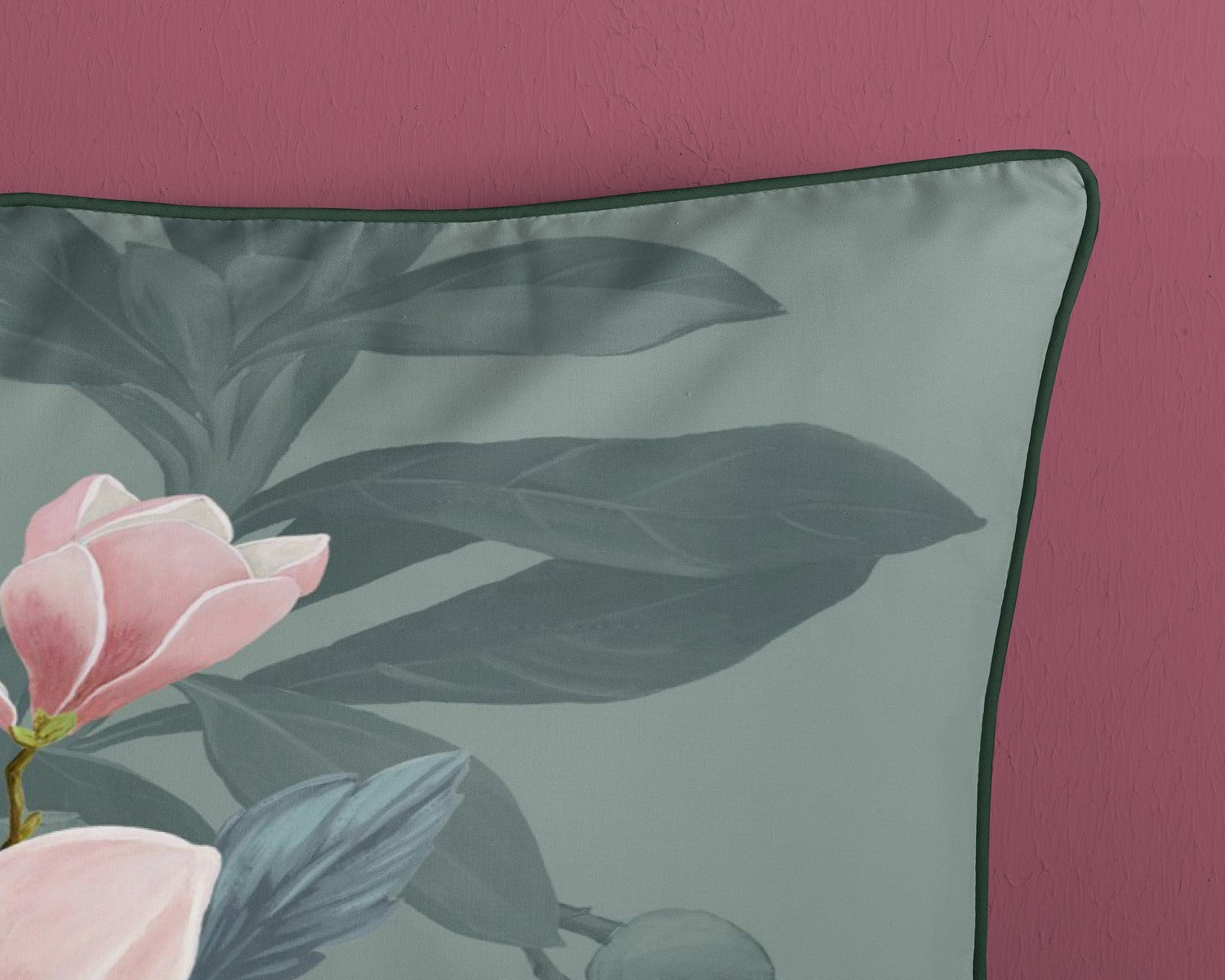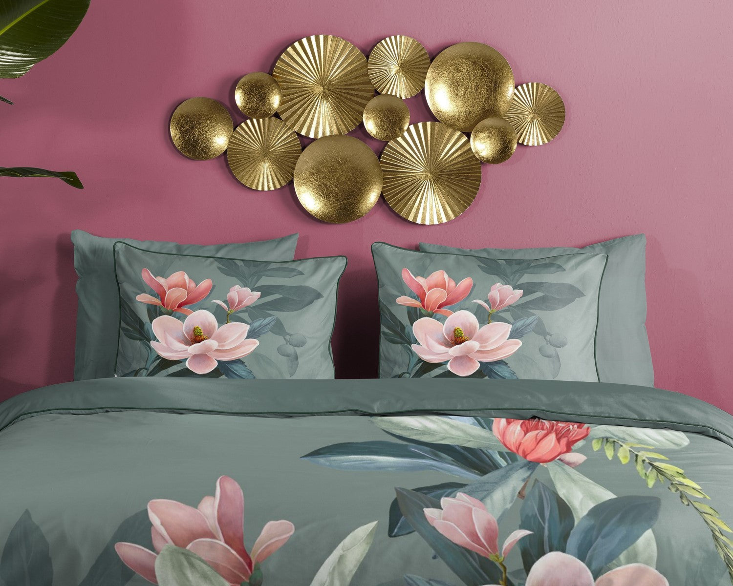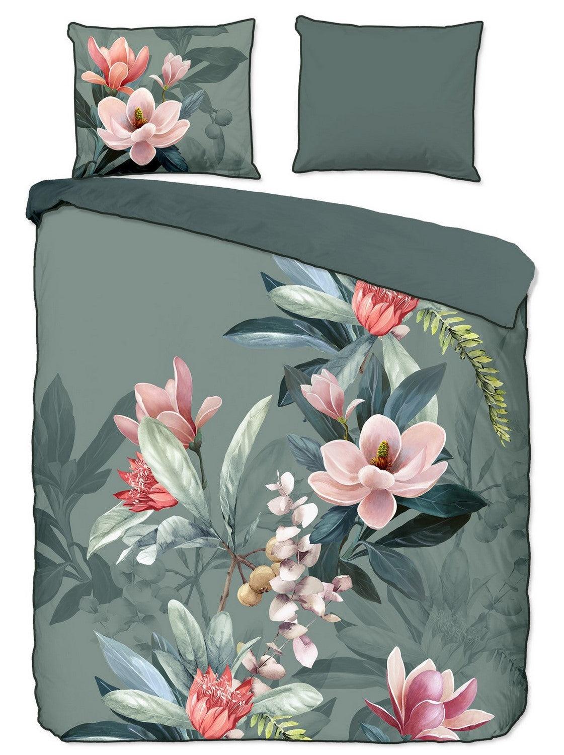 Dekbedovertrek Parler van Descanso: Een zacht ontwerp met prachtige bloemen op een groene achtergrond Descanso's dekbedovertrek Parler is een betoverend stuk beddengoed dat jouw slaapkamer een serene uitstraling geeft. Het ontwerp toont een reeks zachte roze bloemen op een prachtig groene achtergrond, wat resulteert in een subtiele en verfijnde uitstraling. De andere kant van het dekbedovertrek is effen donkerder groen, wat een alternatieve optie biedt voor variatie.