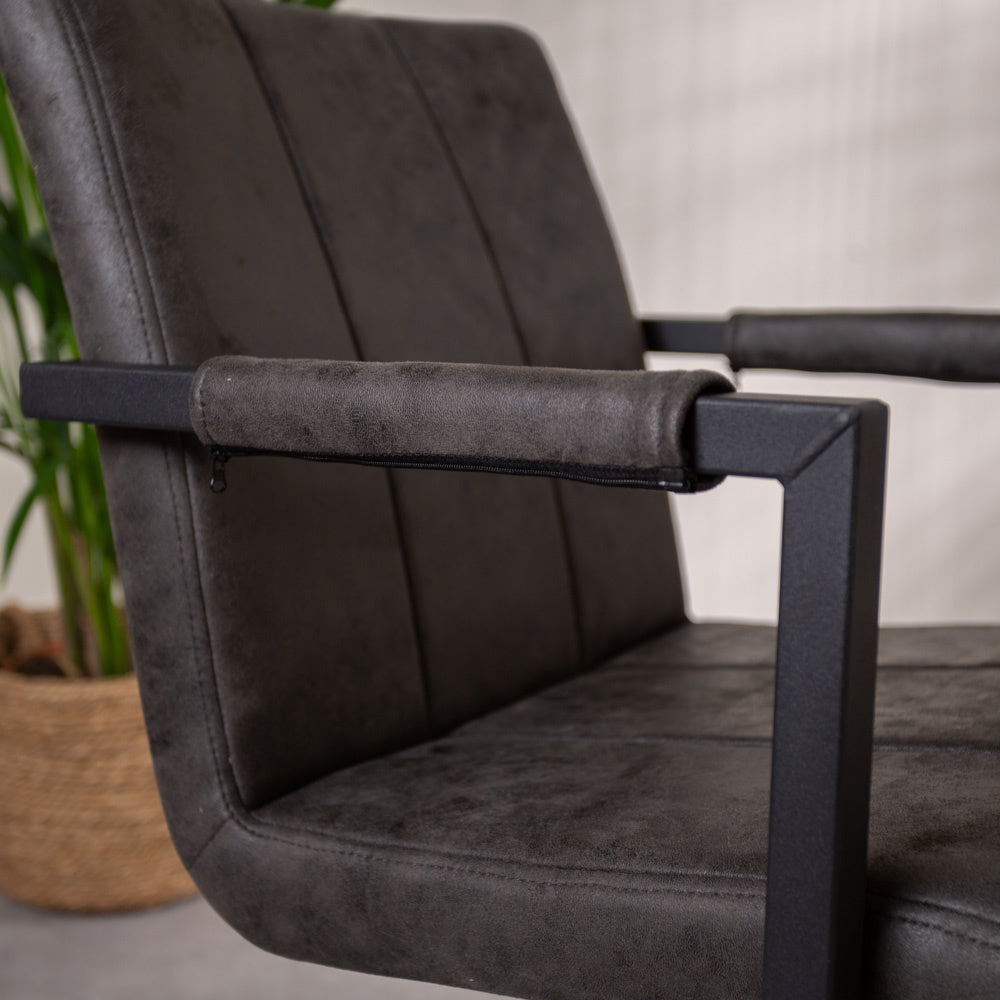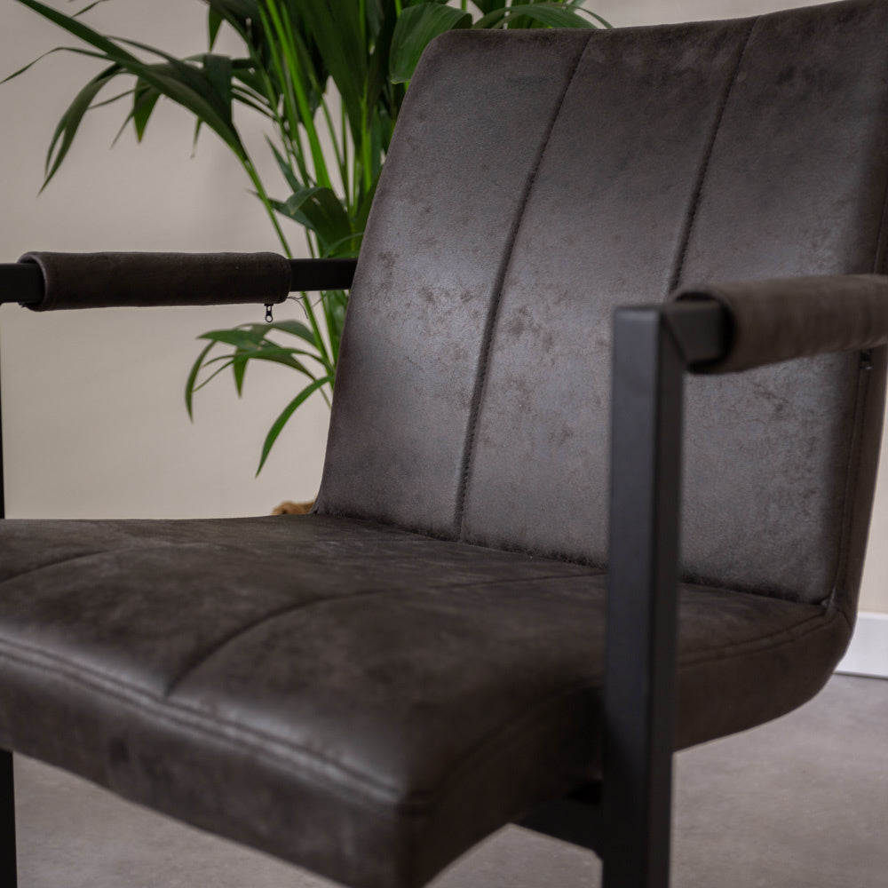 Op zoek naar een comfortabele eetkamerstoel industrieel met armleuning voor urenlang tafelen? Industriële eetkamerstoel Jackson is zo'n stoel! De verticale stiksels geven een bijzonder detail aan de industriële stoel.