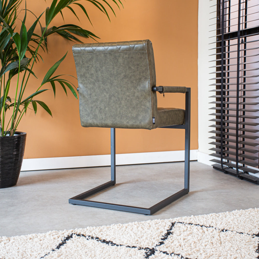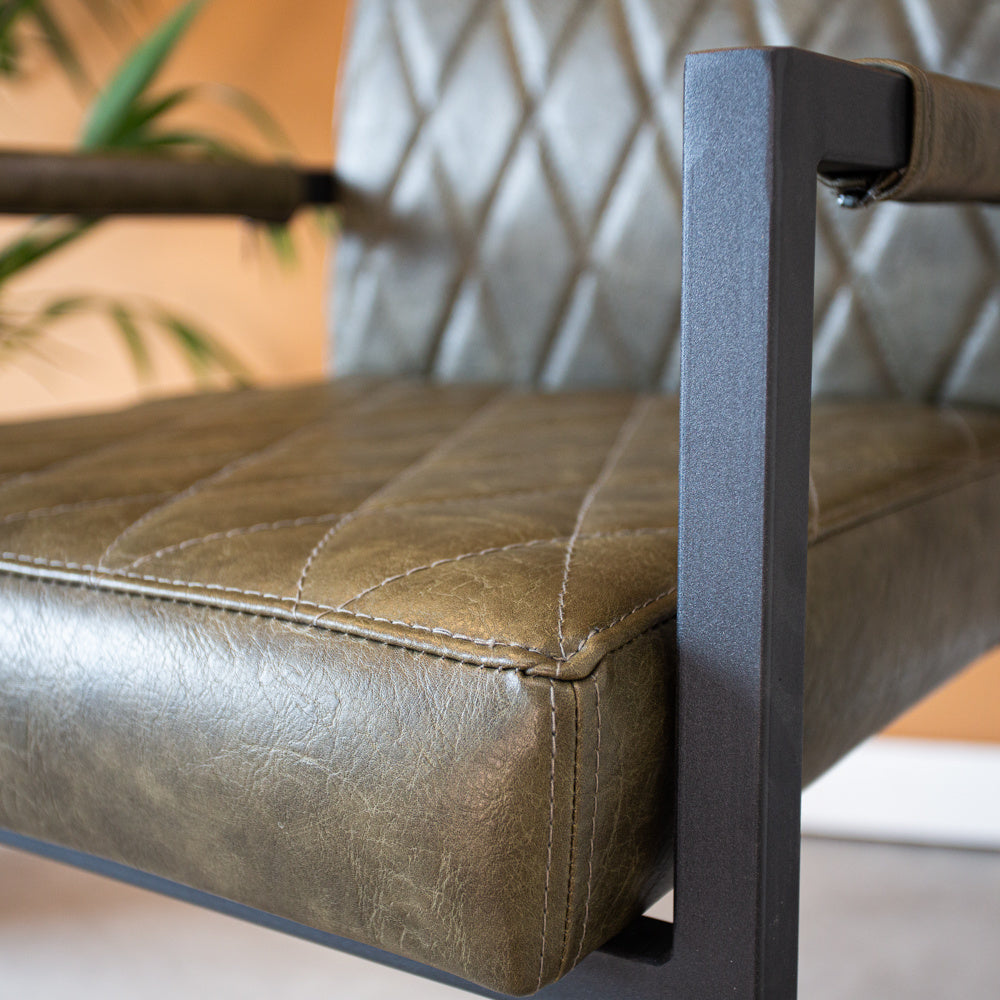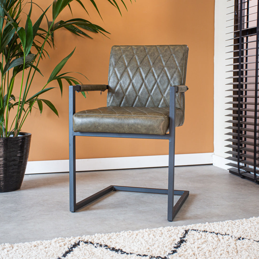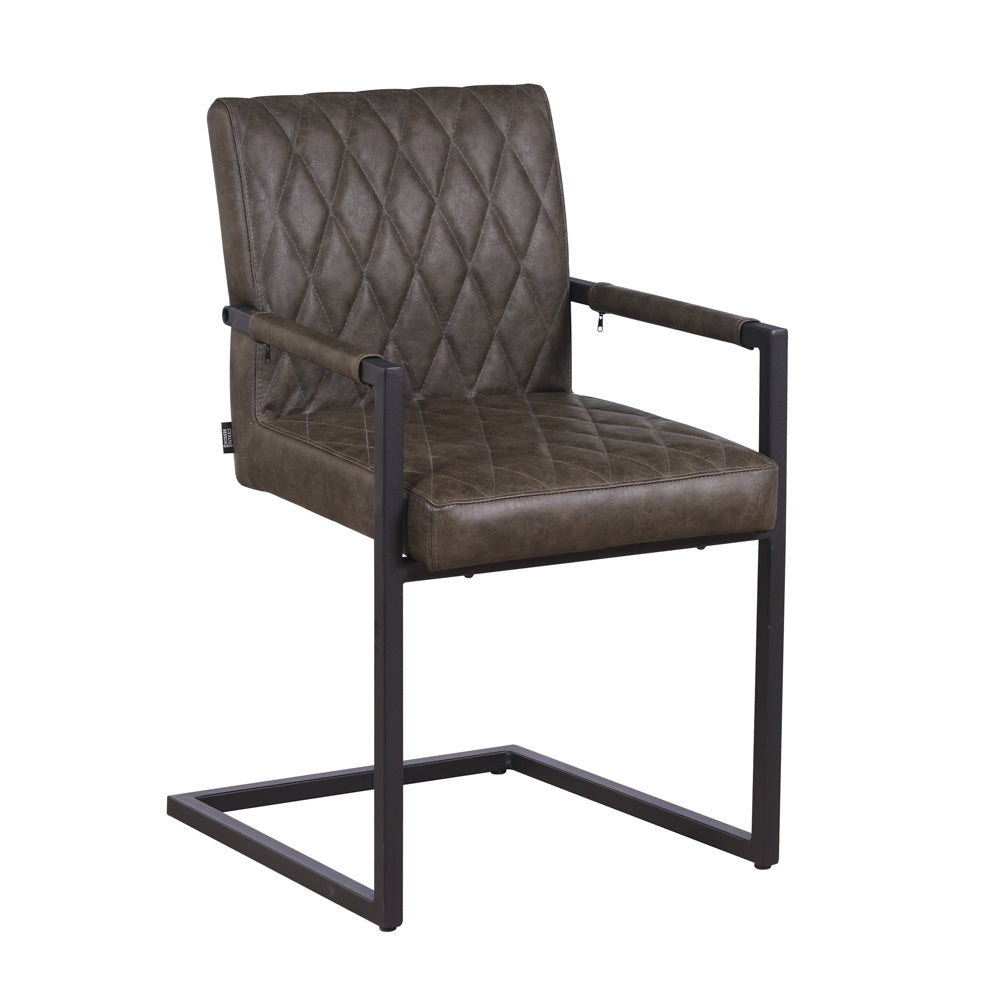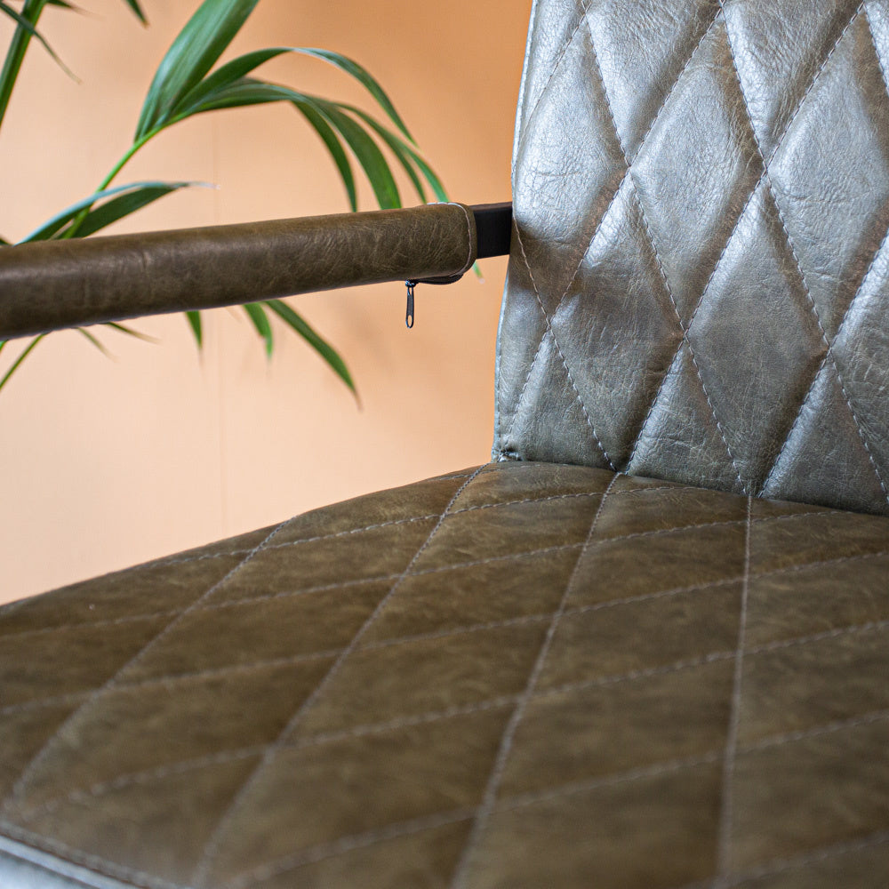 De industriële eetkamerstoel Mick is een statige eetkamerstoel gemaakt van ecoleer en bevat een chic ruitpatroon.