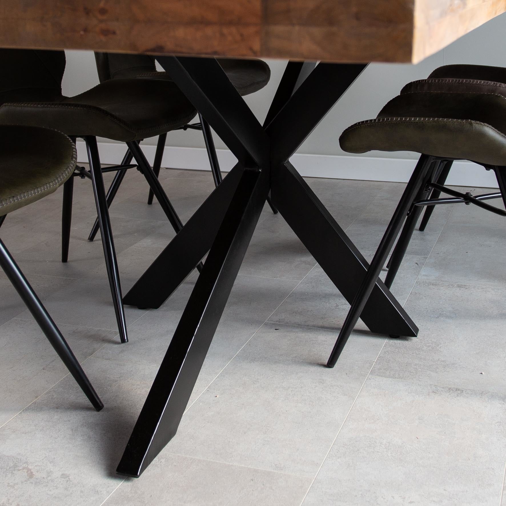 Materiaal frame Eettafel York bevat een gepoedercoat, metalen spinpoot als onderstel. Het zwarte metaal geeft het product een robuust en industrieel karakter.