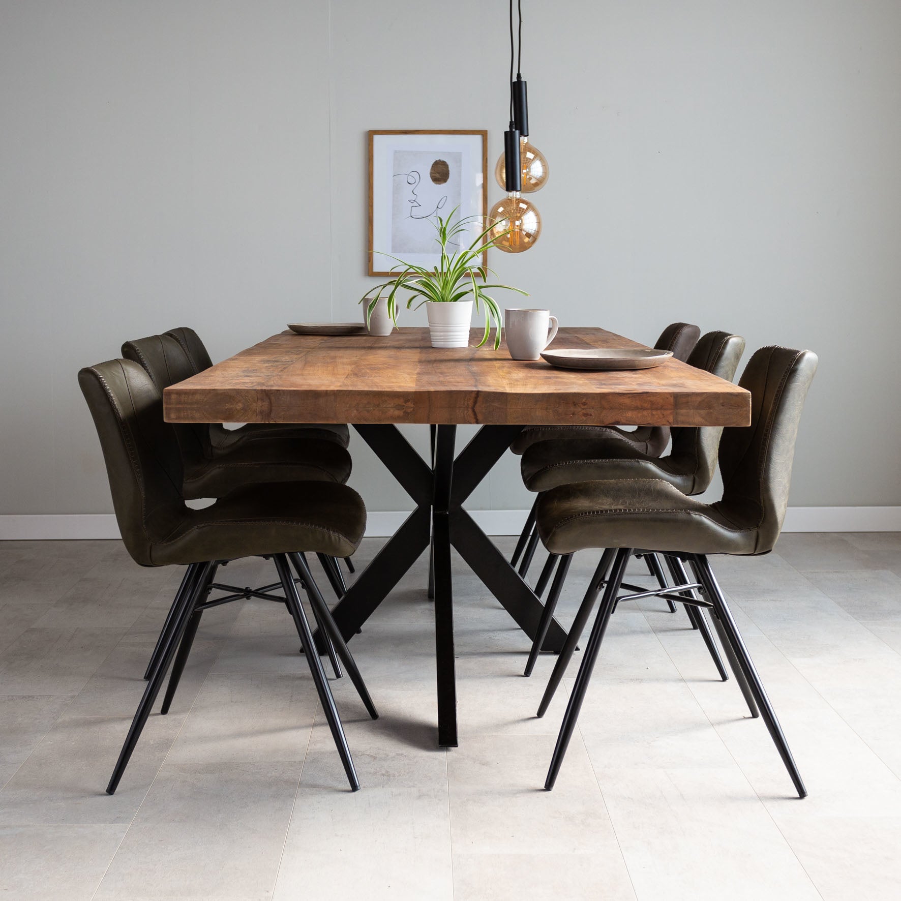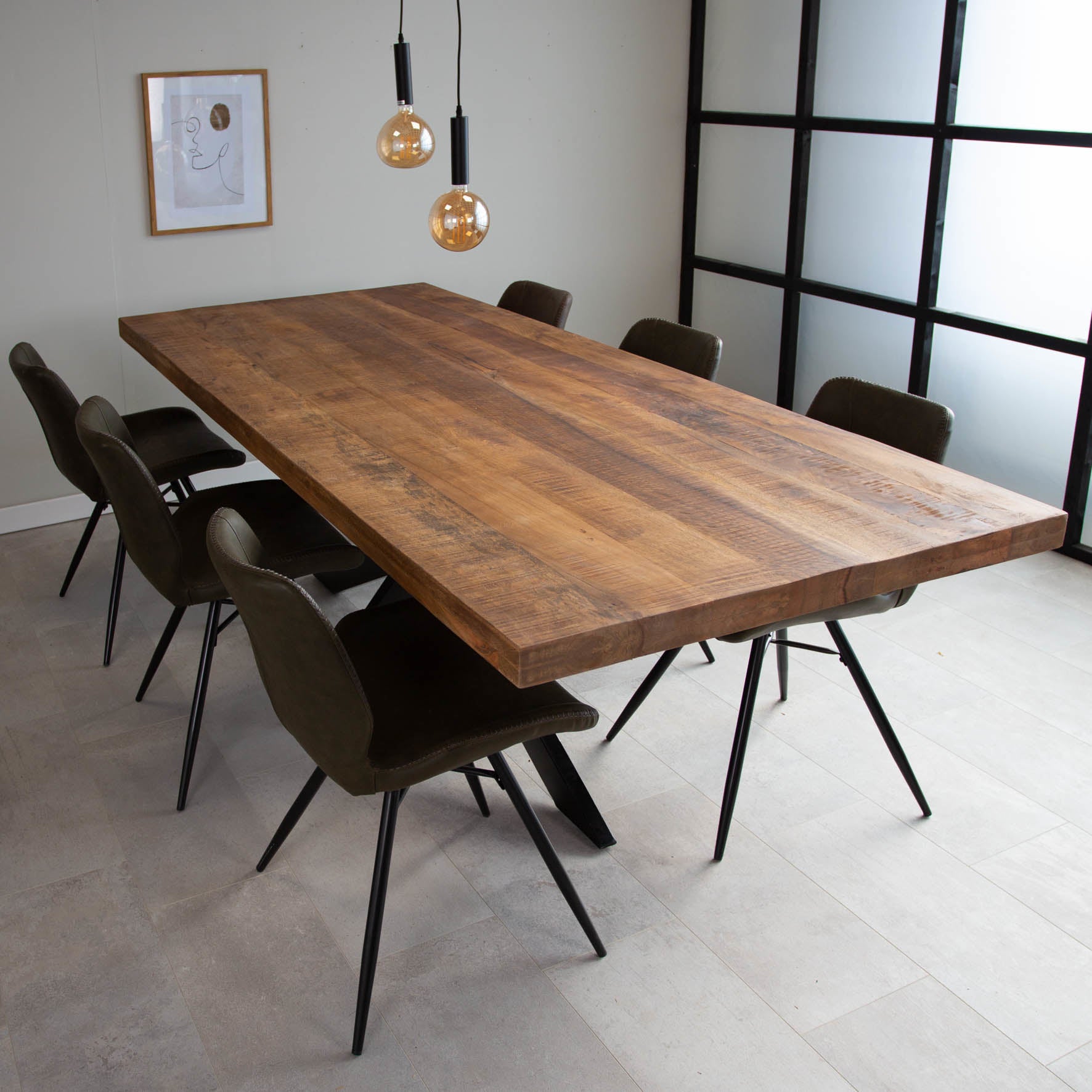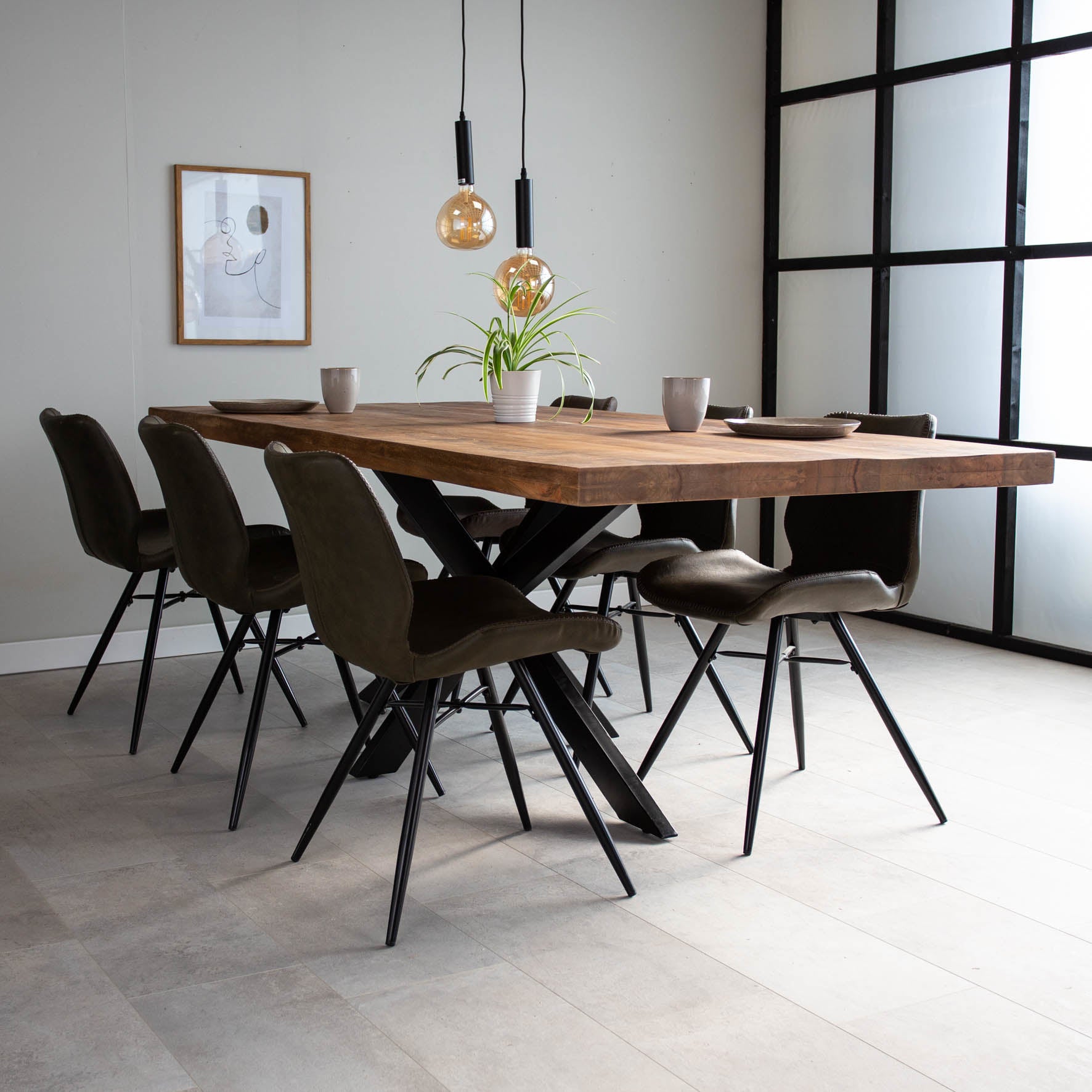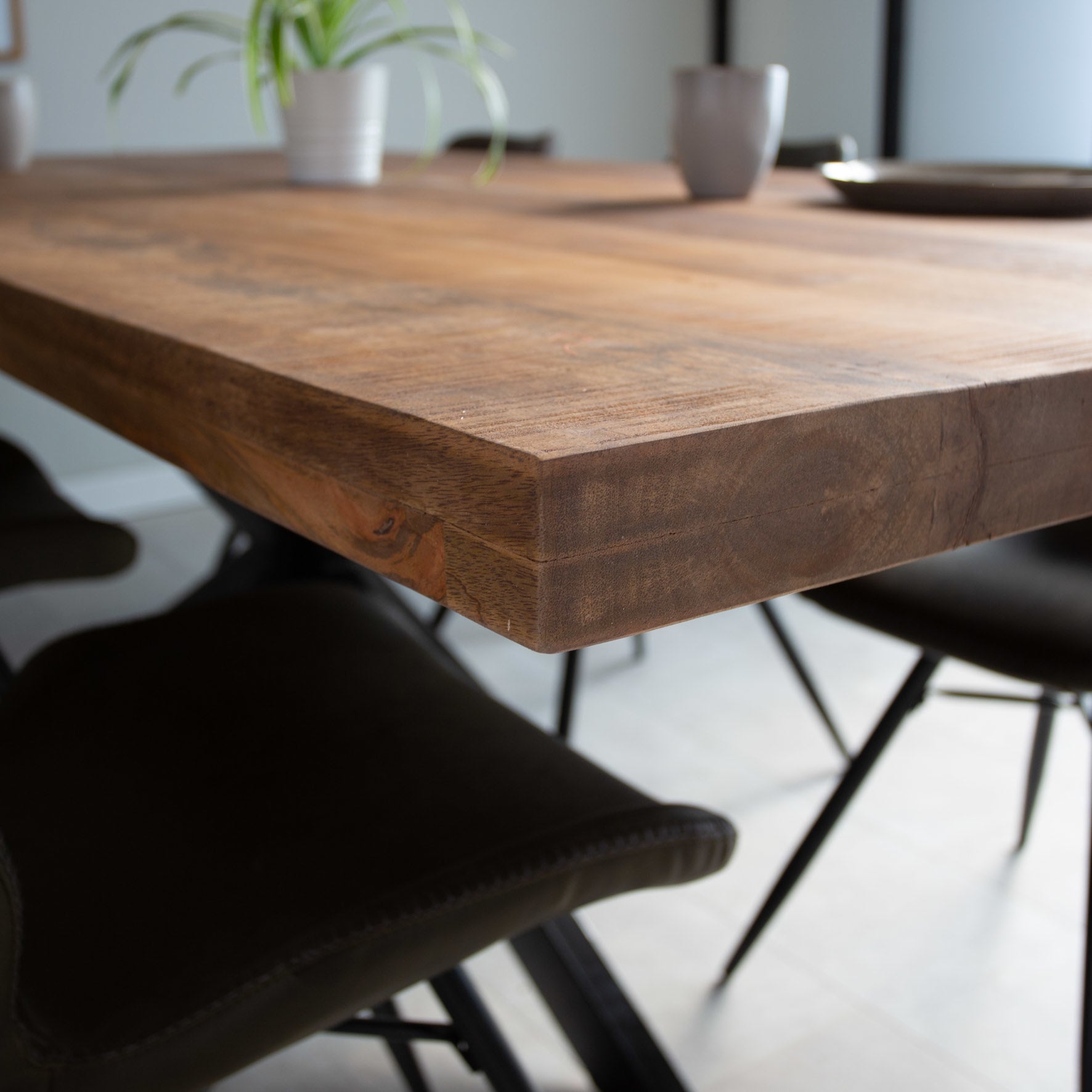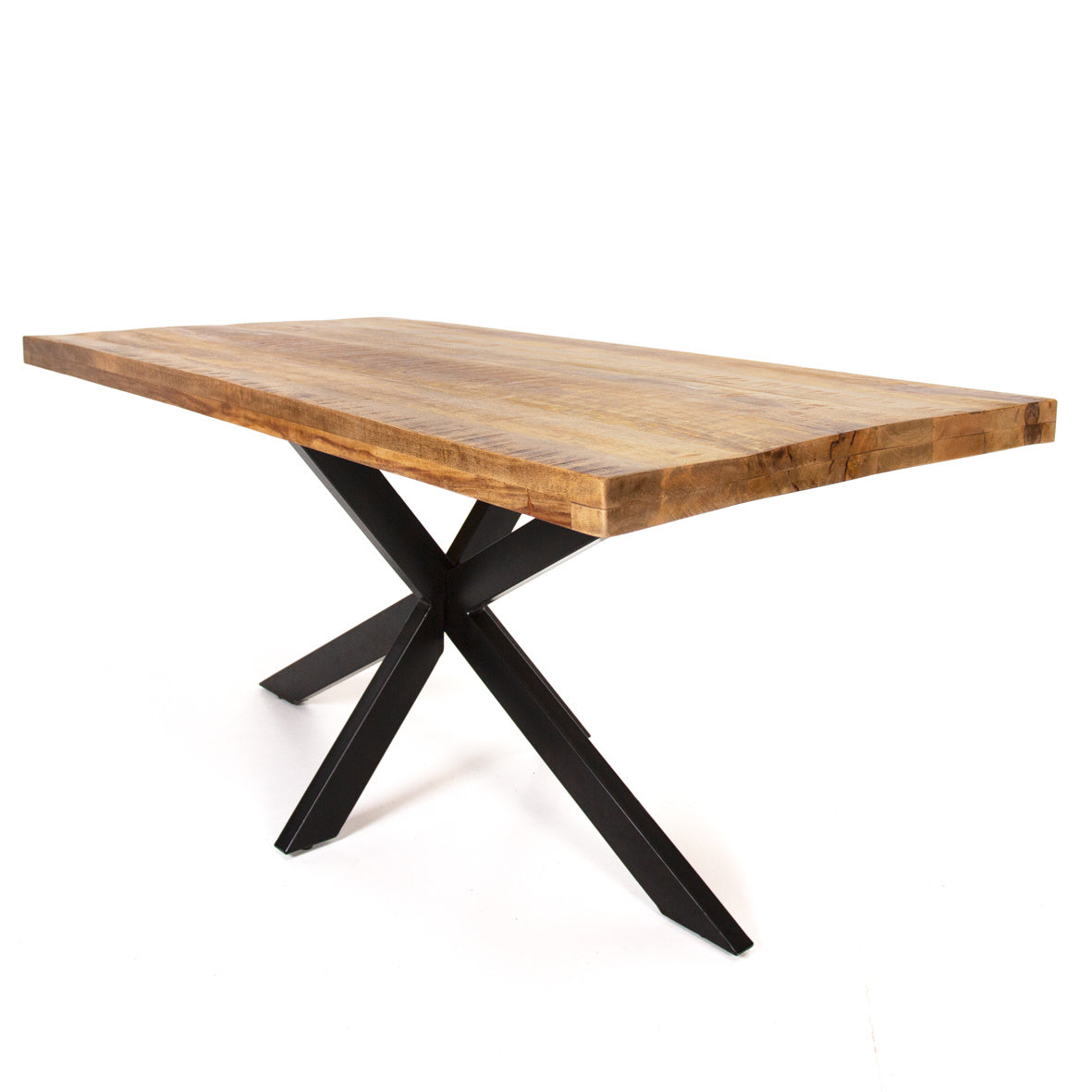 Eettafel York is een robuuste eettafel. Het massieve mangohouten blad heeft een natuurlijke en stoere look. De spinvormige, metalen poten geven de tafel veel stabiliteit en dragen bij aan de industriële stijl.