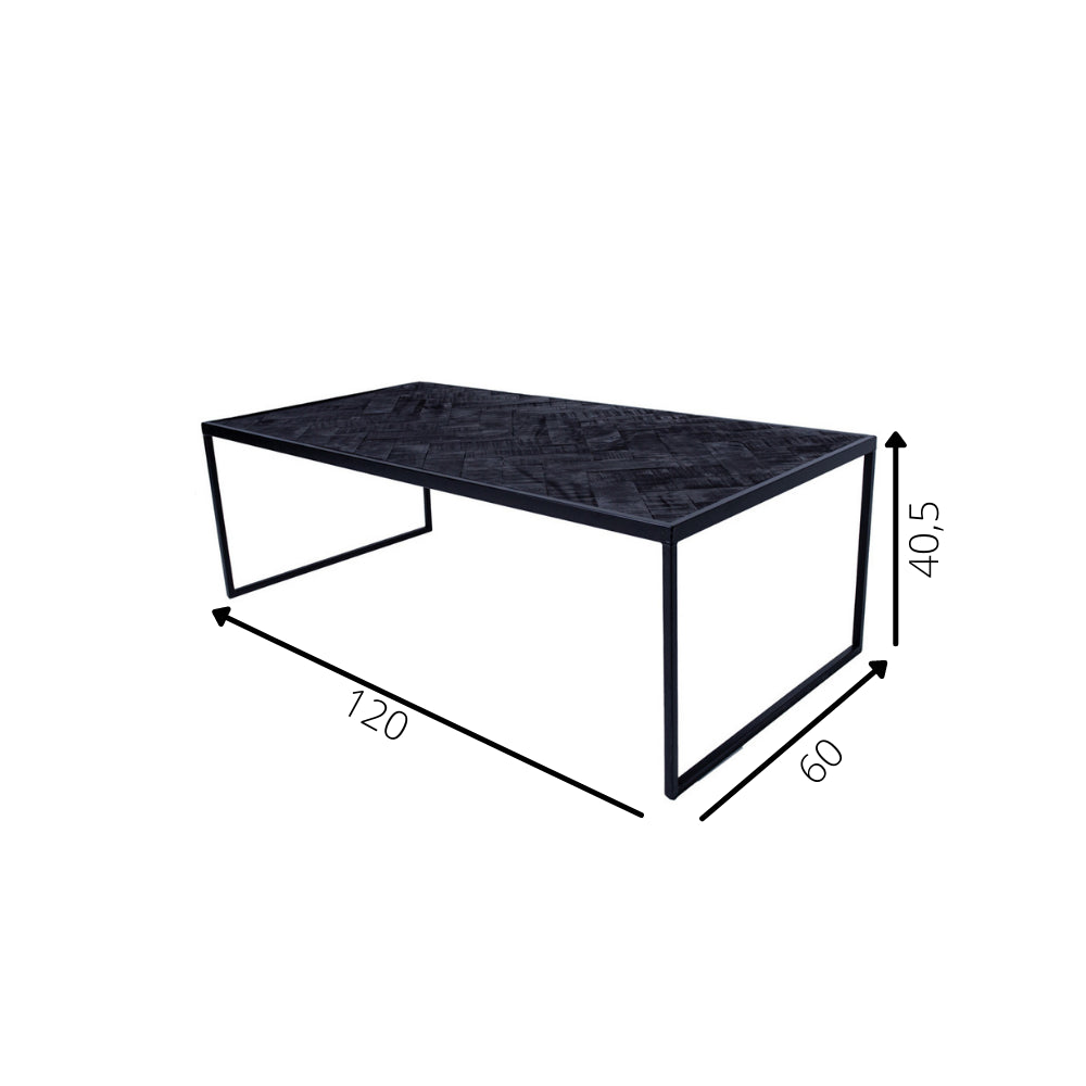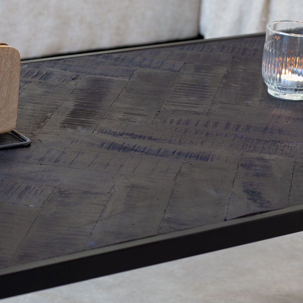 Materiaal blad Het blad van salontafel Dulce bestaat uit zwart gespoten teakhout. Meubels van teak staan bekend om hun goede staat, zelfs na jarenlang gebruik. Het is een duurzame houtsoort die vrij weinig na werkt. Het blad is binnen het frame weggewerkt en ligt daarom op horizontaal niveau met de bovenkant van het zwart metalen frame. Het blad is middels visgraat structuur opgebouwd. Over het teakblad zijn groeven geslepen die er voor zorgen dat deze tafel een mooie vintage look krijgt. Deze groeven zijn licht vergrijsd. Het blad bevat dus een vintage look waardoor het blad niet geheel gaaf lijkt.