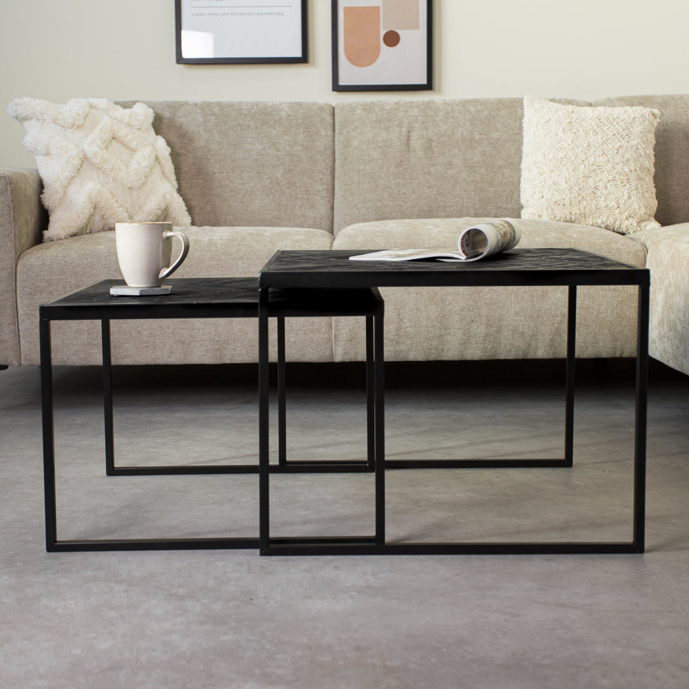 Materiaal blad Het blad van salontafel set Dulce bestaat uit zwart gespoten teakhout. Meubels van teak staan bekend om hun goede staat, zelfs na jarenlang gebruik. Het is een duurzame houtsoort die vrij weinig na werkt. Het blad is binnen het frame weggewerkt en ligt daarom op horizontaal niveau met de bovenkant van het zwart metalen frame. Het blad is middels visgraat structuur opgebouwd. Over het teakblad zijn groeven geslepen die er voor zorgen dat deze salontafel set een mooie vintage look krijgt. Deze groeven zijn licht vergrijsd. Het blad bevat dus een vintage look waardoor het blad niet geheel gaaf lijkt.