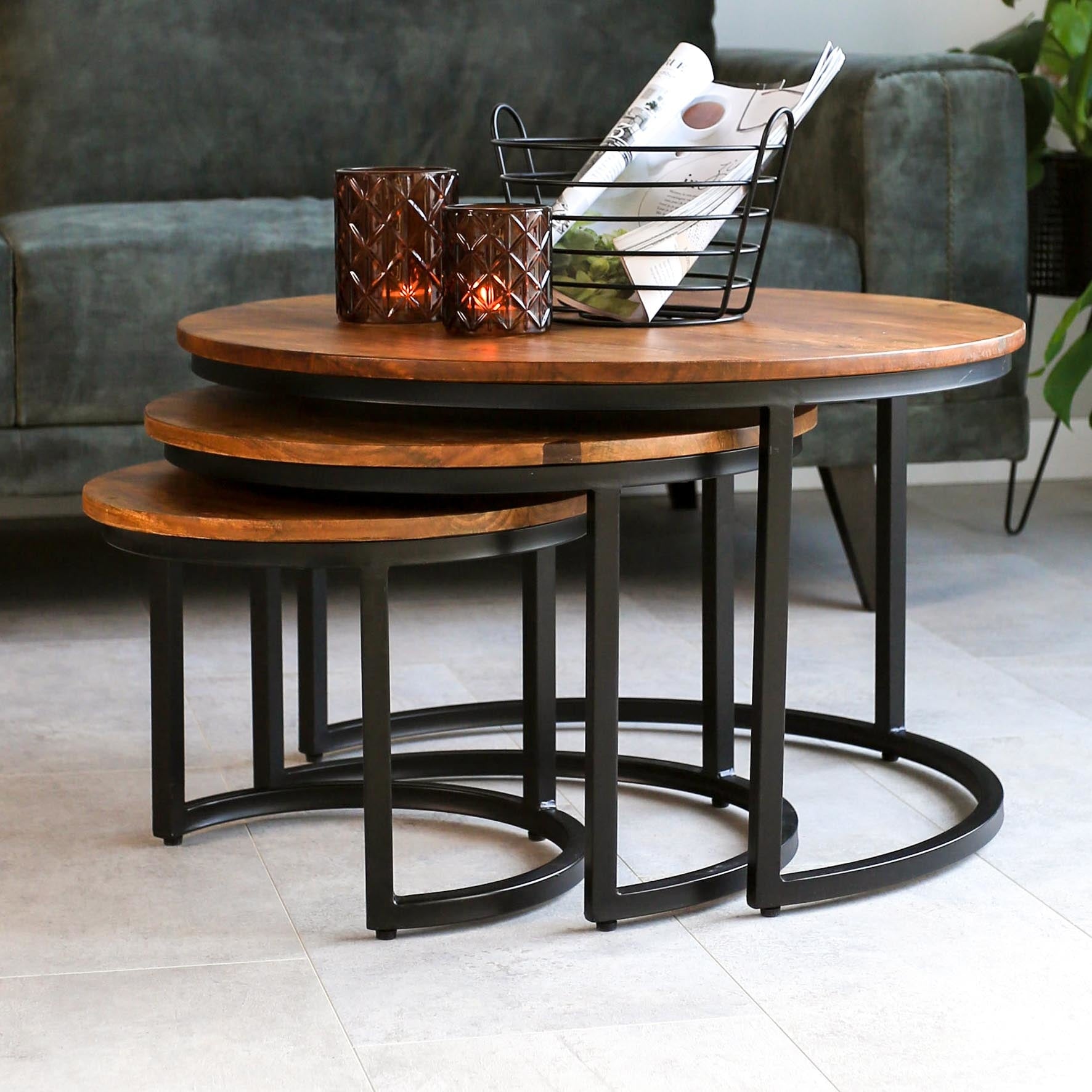 De Cedric is een stoere industriële salontafelset van massief mangohout met een zwart gepoedercoat metalen frame. Deze houten salontafelset bestaat uit maar liefst drie tafels! Een prachtige eyecatcher in elke industriële woonkamer!