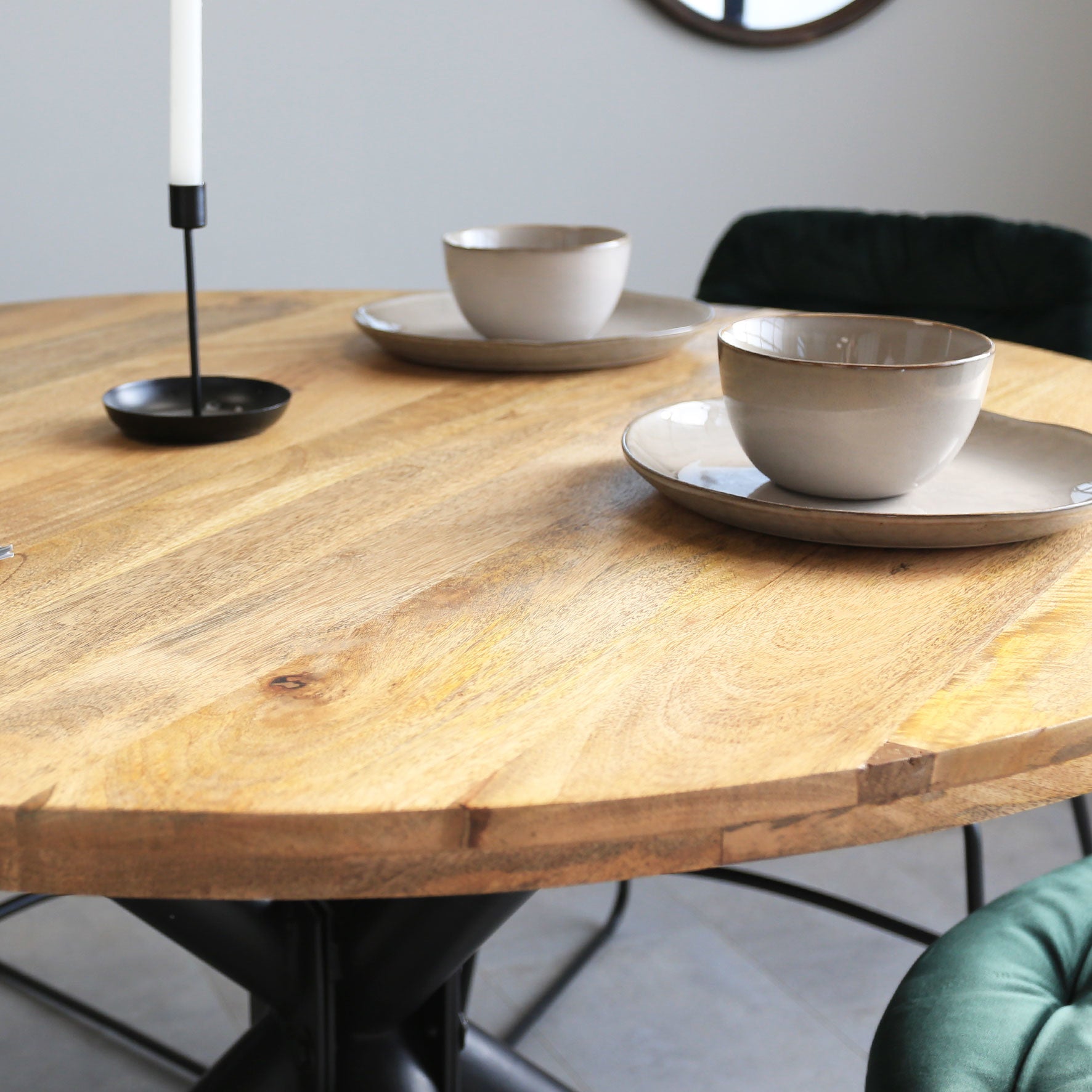 Eetkamertafel Denver is een stevige ronde eetkamertafel gemaakt van massief mangohout. Dit tafelblad wordt ondersteund door een zwart gepoedercoat frame wat de stoere industriële look helemaal afmaakt! Waar ga jij deze ronde eyecather plaatsen? Ook geschikt voor een vergaderruimte of ontvangstruimte.