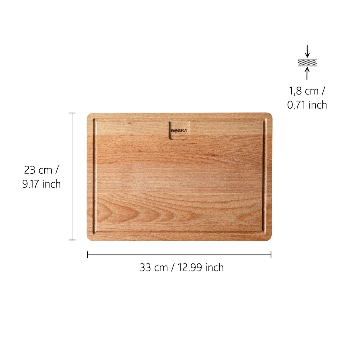 Je lunch, diner of borrelhapjes zien er nóg smaakvoller uit als je het serveert op het Dining Board Amigo M. Deze serveerplank is 33 cm breed en is gemaakt van 100% Europees beukenhout. Het hout bevat een handige opvanggeul, zodat je tafel altijd mooi schoon blijft. Europees beukenhouten dinerplank Je favoriete toetje, sandwich of andere maaltijd verdient een bijzondere presentatie. Dat heb je zo geregeld met deze dinerplank. De plank is gemaakt van een hoge kwaliteit Europees beukenhout. Op een voedselveilige manier geolied en gelijmd, zodat je zonder zorgen van je eten kunt genieten. Praktische opvanggeul Deze houten plank bevat een handige geul die kruimels en vocht opvangt. Hierdoor kun je ook zorgeloos van de meest sappige burger, kruimelige broodjes en vettige – maar oh zo smaakvolle – pizza pepperoni genieten. Stabiele en gebruiksvriendelijke serveerplank Aan de onderkant van deze houten dinerplank vind je twee inkepingen. Hierdoor heb je genoeg ruimte voor je vingers en een stabiele grip op de plank. De plank is 33 cm breed en 23 cm lang. Dit maakt de dinerplank geschikt voor smaakvolle gerechten, zoals lunch, desserts en borrelhapjes. Zo maak je een houten serveerplank goed schoon Met het juiste onderhoud heb je jarenlang plezier van het Dining Board Amigo M. Was de plank daarom na gebruik met de hand af en laat de plank niet in het water weken. Droog de serveerplank goed af en laat het vervolgens rechtop verder drogen. Bescherm de plank tegen vlekken, geurtjes en splijten door het hout regelmatig in de sprayen met BOSKA Plankolie (apart verkrijgbaar).