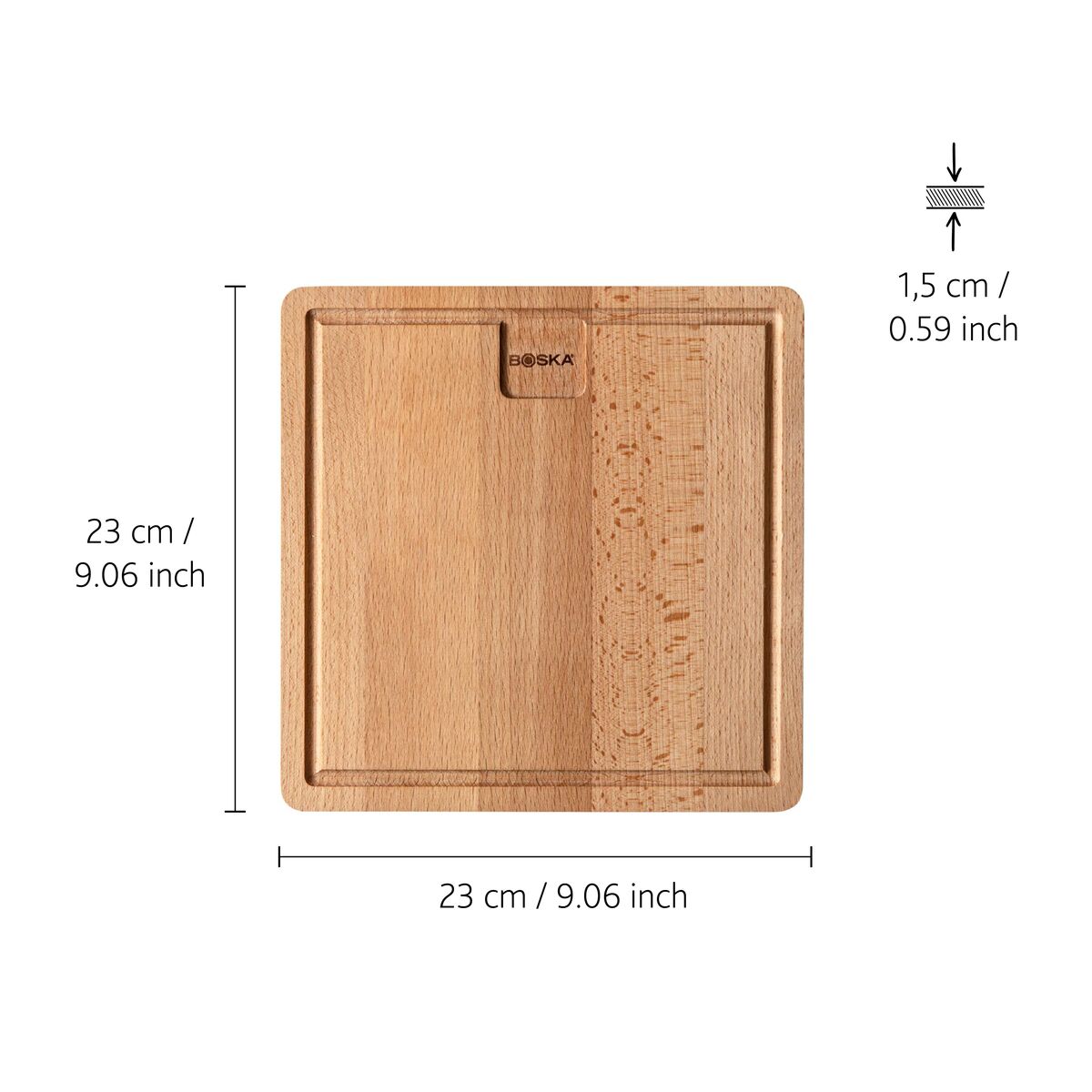 Serveer je ontbijt, lunch of borrelhapjes op het Dining Board Amigo S. Deze serveerplank is gemaakt van 100% Europees beukenhout. Met handige opvanggeul en 23 cm lang en breed. Perfect voor een stijlvolle presentatie van je favoriete eten. Dinerplank van Europees beukenhout Van een magnetronmaaltijd tot een luxe 3-gangen diner; op deze dinerplank ziet echt alles er smaakvol uit! De plank is gemaakt van een hoge kwaliteit Europees beukenhout. Op een voedselveilige manier geolied en gelijmd, zodat je zonder zorgen van je eten kunt genieten. Plank met handige opvanggeul Met deze plank blijft jouw tafel altijd netjes. Het hout bevat een praktische geul die kruimels en vocht opvangt. Hierdoor kun je ook zorgeloos van de meest sappige steaks, kruimelige broodjes en vettige – maar oh zo smaakvolle – pizza pepperoni genieten. Gedetailleerde en praktische afwerking Aan de onderkant van deze houten dinerplank bevinden zich twee inkepingen. Hierdoor heb je genoeg ruimte voor je vingers en een stabiele grip op de plank. De plank is 23 cm breed en lang. Dit maakt de dinerplank geschikt voor kleinere gerechten, zoals ontbijt, lunch en desserts. Onderhoud van de houten serveerplank Met het juiste onderhoud heb je jarenlang plezier van het Dining Board Amigo S. Was de plank daarom na gebruik met de hand af en laat de plank niet in het water weken. Droog de serveerplank goed af en laat het vervolgens rechtop verder drogen. Bescherm de plank tegen vlekken, geurtjes en splijten door het hout regelmatig in de sprayen met BOSKA Plankolie (apart verkrijgbaar).