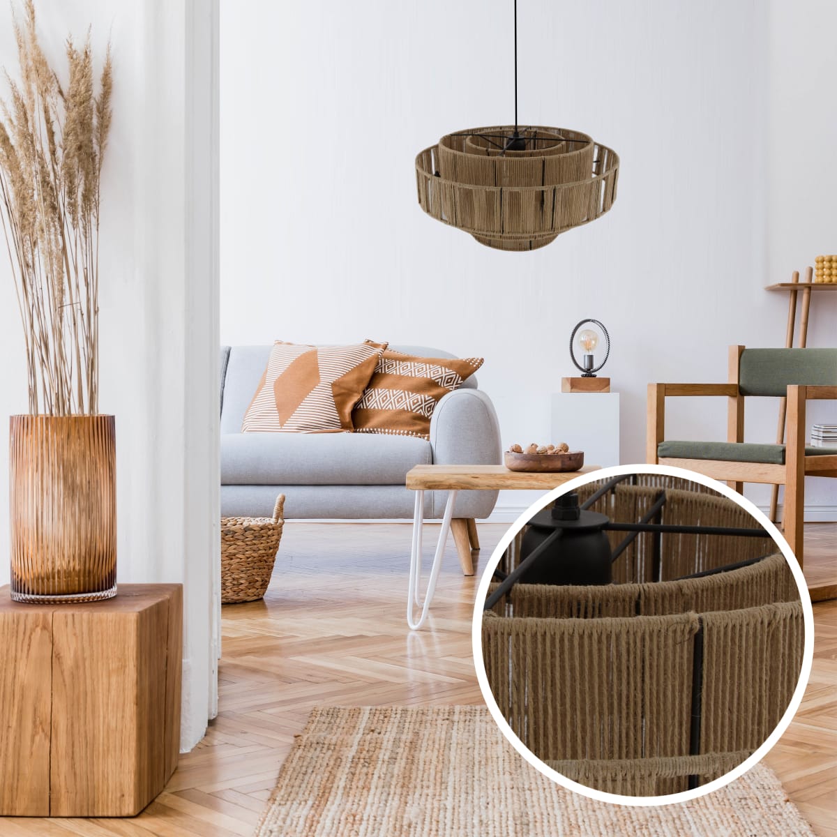 Afmetingen: Lengte: 50 cm Breedte: 50 cm Hoogte: 26 cm Maak je interieur compleet met deze prachtige hanglamp gemaakt van jute. Een jute hanglamp is de perfecte aanvulling op elke interieurstijl. Of je nu een modern, bohemian of landelijk interieur hebt, de natuurlijke uitstraling van een hanglamp van jute voegt warmte en sfeer toe aan elke kamer. De hanglamp is een ware eye catcher door het natuurlijke design waardoor ieder item een unieke uitstraling heeft. Door de open kap geven de lichtstralen een mooi effect op de muur. Hang hem boven je eettafel voor een warm en gezellig diner, of in de hoek van een kamer voor een subtiele sfeerverlichting.