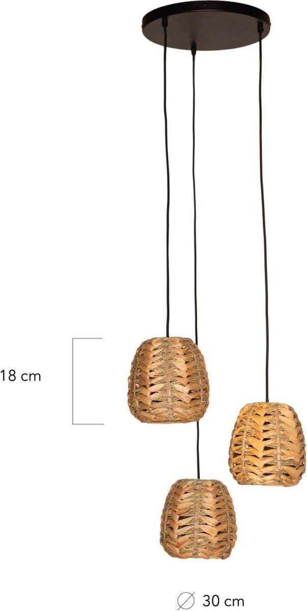 Afmetingen: Lengte: 30 cm Breedte: 30 cm Hoogte: 18 cm Upgrade je interieur met deze geweldige hanglamp gemaakt van waterhyacinth. Of je nu van modern, industrieel of klassiek houdt, deze hanglamp past perfect in elke ruimte. Onze hanglampen zijn niet alleen handig om licht te brengen, maar ook echte blikvangers in je huis. Ze zijn goed gemaakt en gaan lang mee, dus je investeert niet alleen in verlichting maar ook in een blijvend mooie toevoeging aan je kamer. Hang de lamp boven je eettafel voor een warm en gezellig diner, of in de hoek van een kamer voor een subtiele sfeerverlichting.