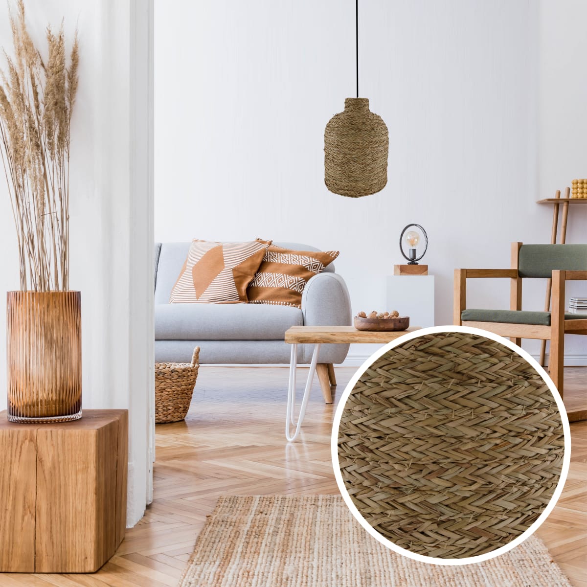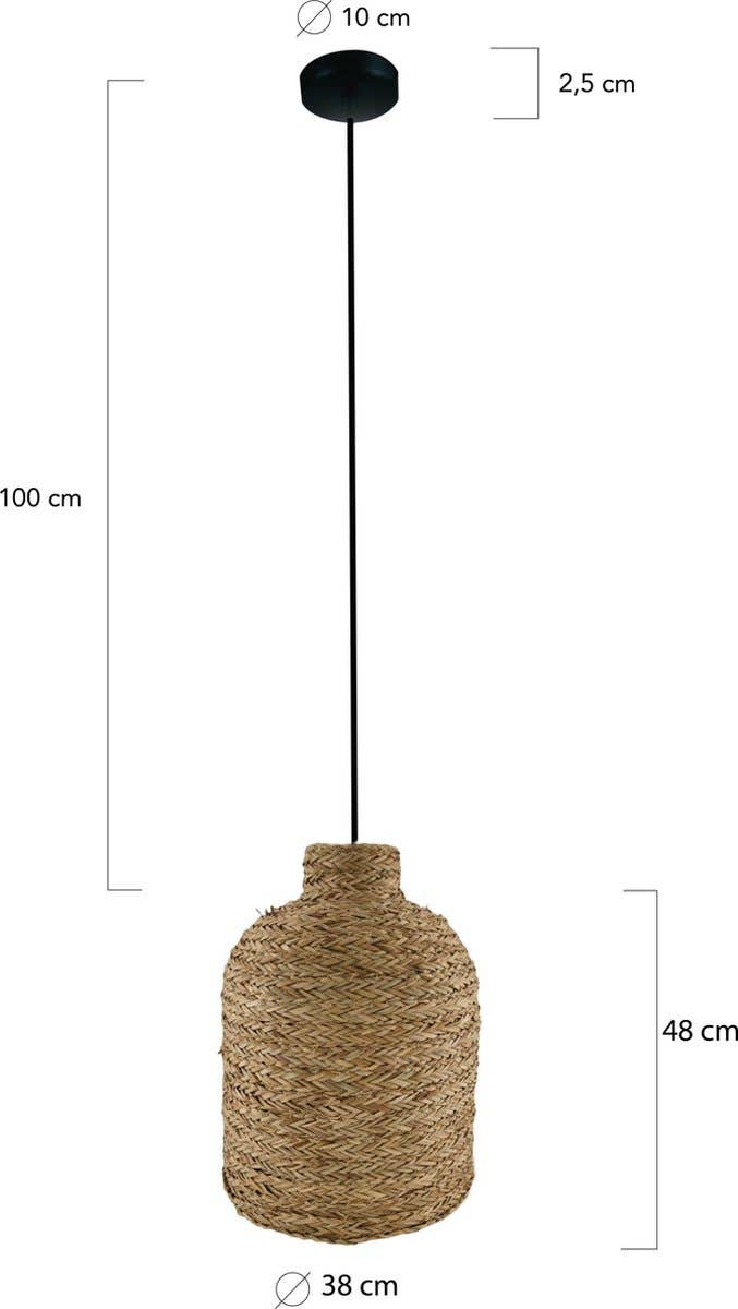 Afmetingen: Lengte: 38 cm Breedte: 38 cm Hoogte: 48 cm Maak je interieur compleet met deze prachtige hanglamp gemaakt van zeegras. Een zeegras hanglamp is de perfecte aanvulling op elke interieurstijl. Of je nu een modern, bohemian of landelijk interieur hebt, de natuurlijke uitstraling van een hanglamp van zeegras voegt warmte en sfeer toe aan elke kamer. Zeegras is een duurzaam en veerkrachtig materiaal. Het is licht van gewicht en heeft een natuurlijke uitstraling. De hanglamp is een ware eye catcher door het natuurlijke design waardoor ieder item een unieke uitstraling heeft. Hang hem boven je eettafel voor een warm en gezellig diner, of in de hoek van een kamer voor een subtiele sfeerverlichting.