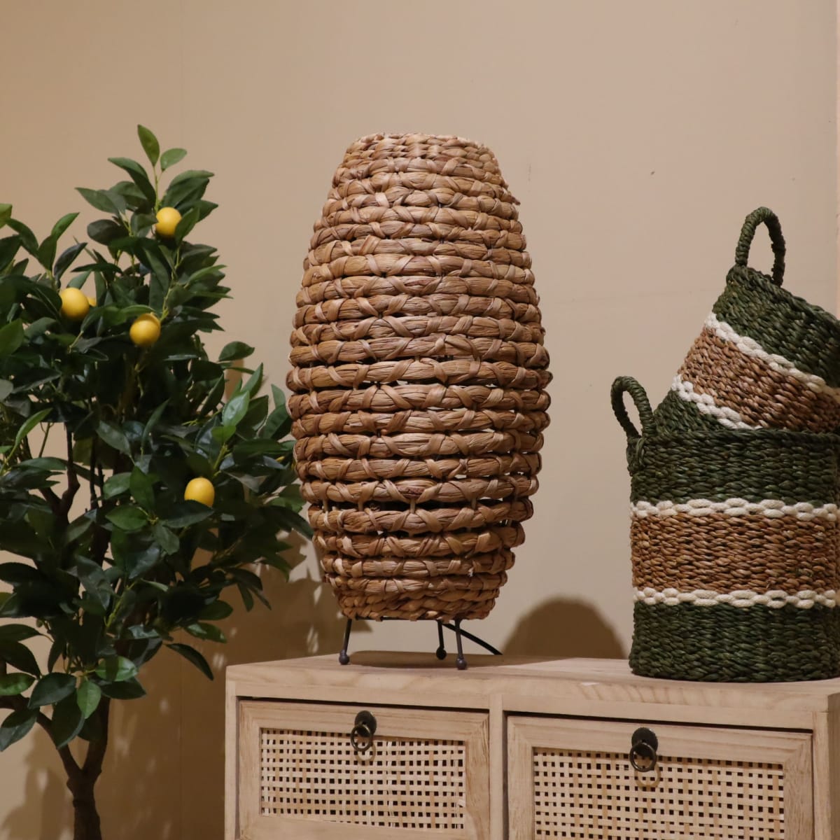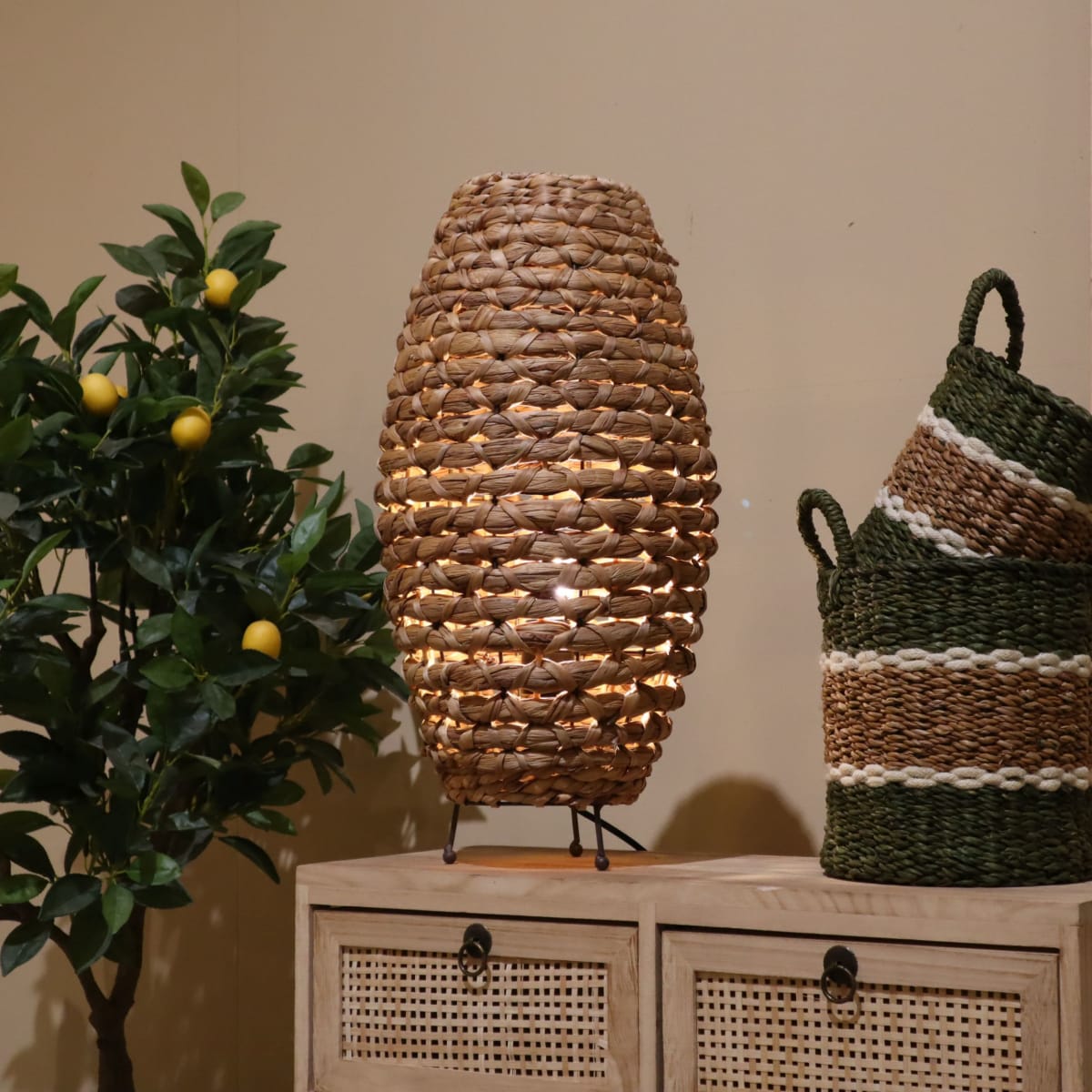 Afmetingen: Lengte: 28 cm Breedte: 28 cm Hoogte: 58 cm Staande lampen zijn de perfecte verlichting voor elk interieur. Met de juiste staande lamp kun je een kamer een geheel nieuwe uitstraling geven en sfeer creëren. Onze staande lamp gemaakt van waterhyacint is een uniek en stijlvol stuk verlichting dat niet alleen verlicht, maar ook een toevoeging is voor je huis. Of je nu een minimalistische of een landelijke woonstijl hebt, deze staande lamp past altijd perfect in je interieur. De lamp heeft een slanke en elegante vorm, waardoor hij niet alleen functioneel is, maar ook prachtig oogt. Waterhyacint is een milieuvriendelijk materiaal. Het is sterk, duurzaam en ook nog eens licht van gewicht, wat betekent dat het gemakkelijk te verplaatsen is. Bovendien heeft waterhyacint een prachtige natuurlijke uitstraling, die elke kamer een warme en gezellige sfeer geeft. Door de open kap geven de lichtstralen een mooi effect op de muur.