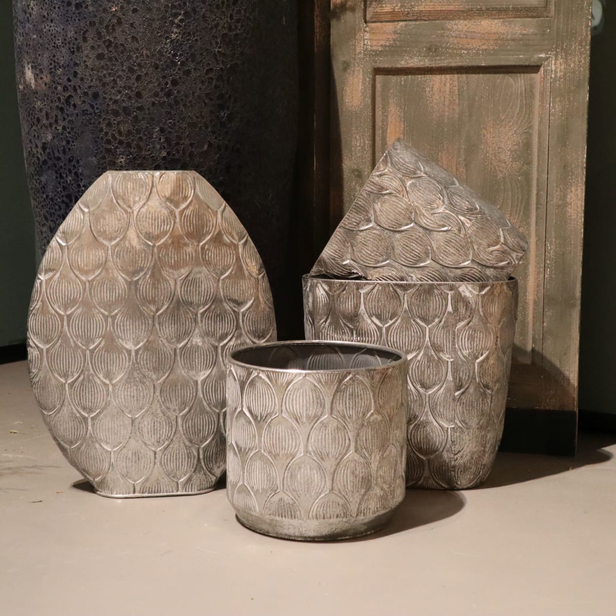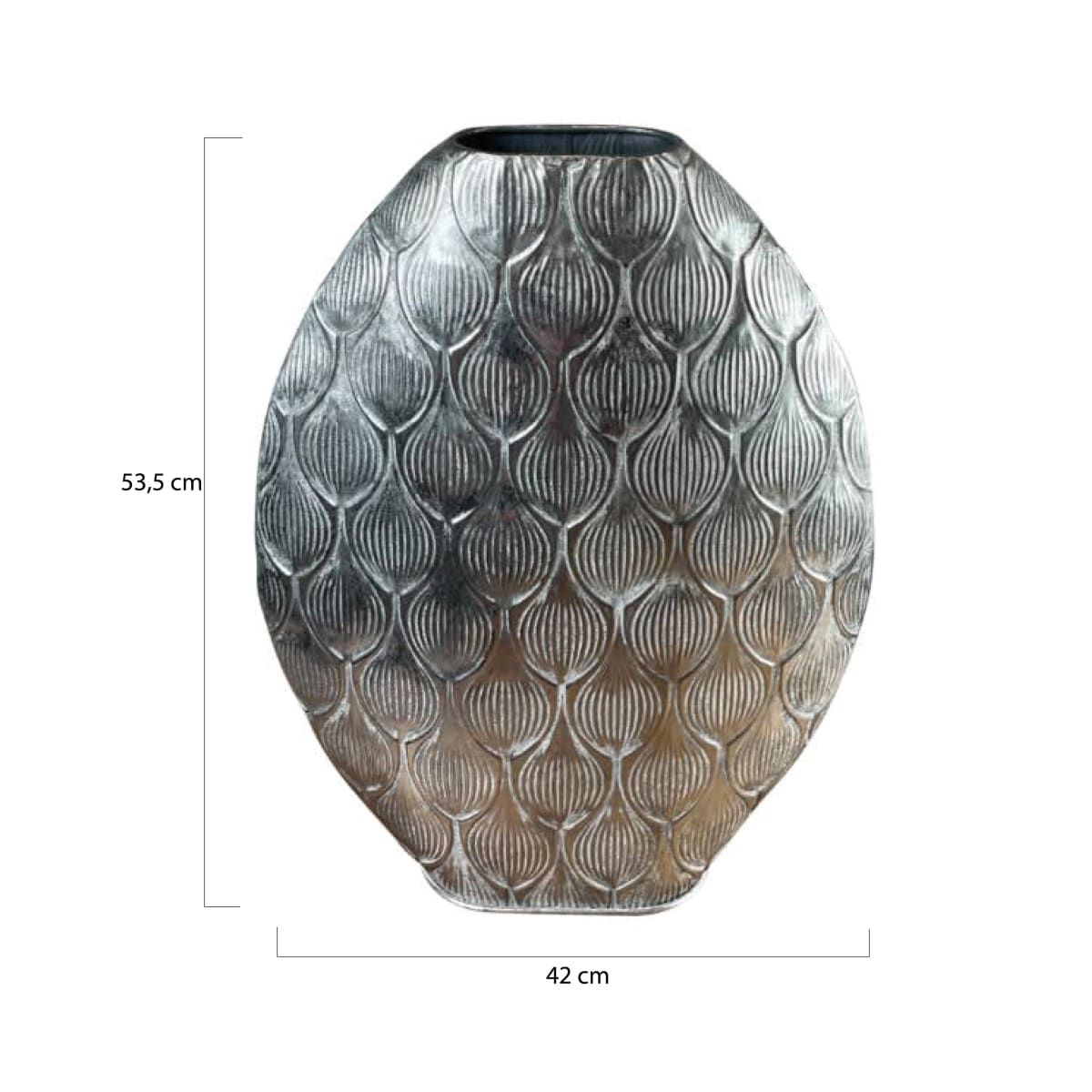 Laat uw interieur stralen met deze zilveren metalen vaas. Het tijdloze ontwerp en de hoogwaardige afwerking maken deze vaas een unieke toevoeging aan uw decor. Plaats het op een prominente plaats en vul het met verse bloemen om een warme en uitnodigende sfeer te creëren. Deze vaas zal zeker de aandacht trekken en een gespreksonderwerp zijn voor uw gasten. Voeg vandaag nog deze prachtige vaas toe aan uw collectie.