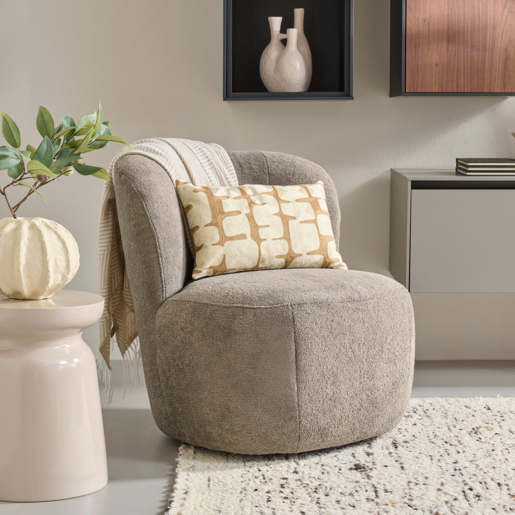 Draaifauteuil Rush is een echte blikvanger. Deze fauteuil is een moderne interpretatie van de cocktailfauteuil uit de jaren '50. Kenmerkend zijn de minimalistische vorm zonder armleuningen en de zachte rondingen. Een stijl die perfect aansluit bij de woontrend van dit moment met organische en ronde vormen. Handig is de draaifunctie, waardoor Rush soepel met je meebeweegt, waar je aandacht ook naar uitgaat. Zitcomfort: Fauteuil Rush biedt een prettig medium zitcomfort. De soepele zit wordt gerealiseerd door de koudschuimvulling. Dit type schuim is goed vormvast en daardoor duurzaam in gebruik. De fauteuil is 360° draaibaar. Stoffering: De draaifauteuil is bekleed met bouclé, een stof met een rijke textuur. De stof voelt aangenaam zacht aan en nodigt uit tot zitten. De taupe kleur heeft een warme bruine tint met een vleugje grijs, waardoor het gemakkelijk te combineren is. Goed om te weten: Fauteuil Rush is 73 cm breed, 80 cm diep en 76 cm hoog. De zithoogte is 43 cm en de zitdiepte is 64 cm.
