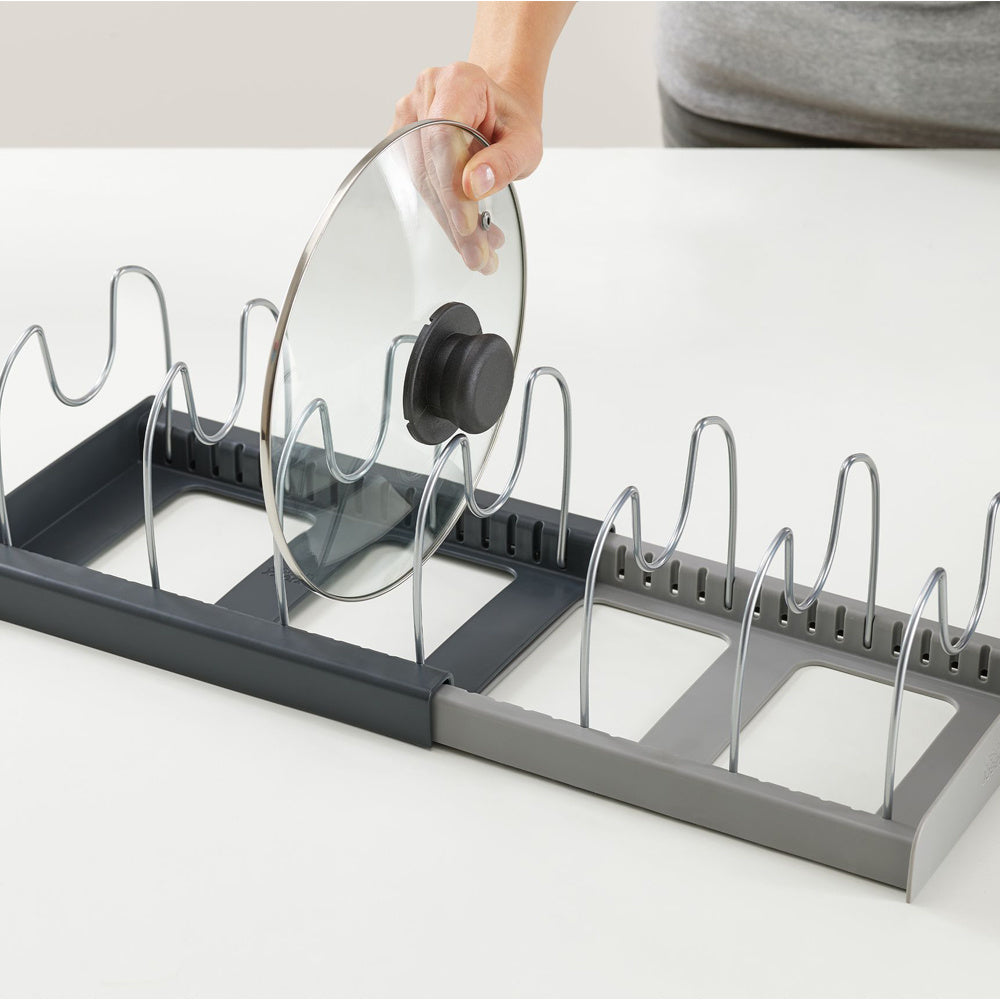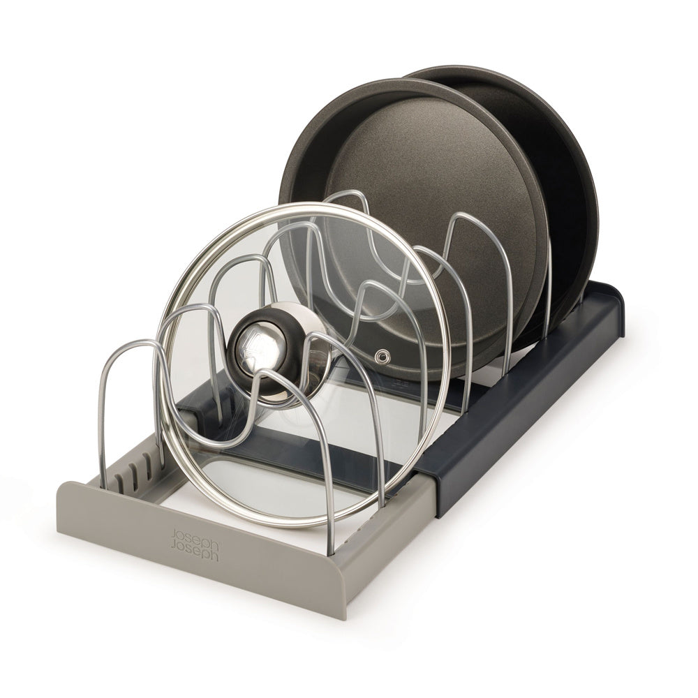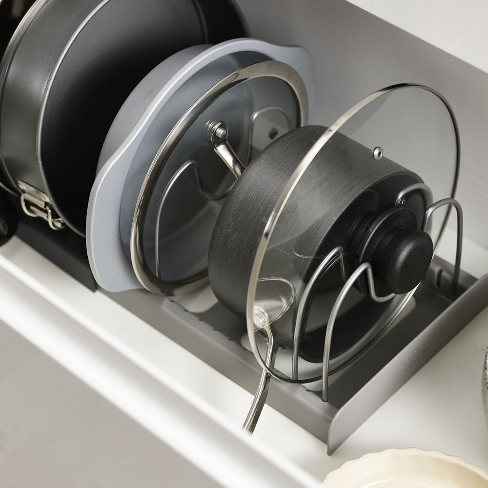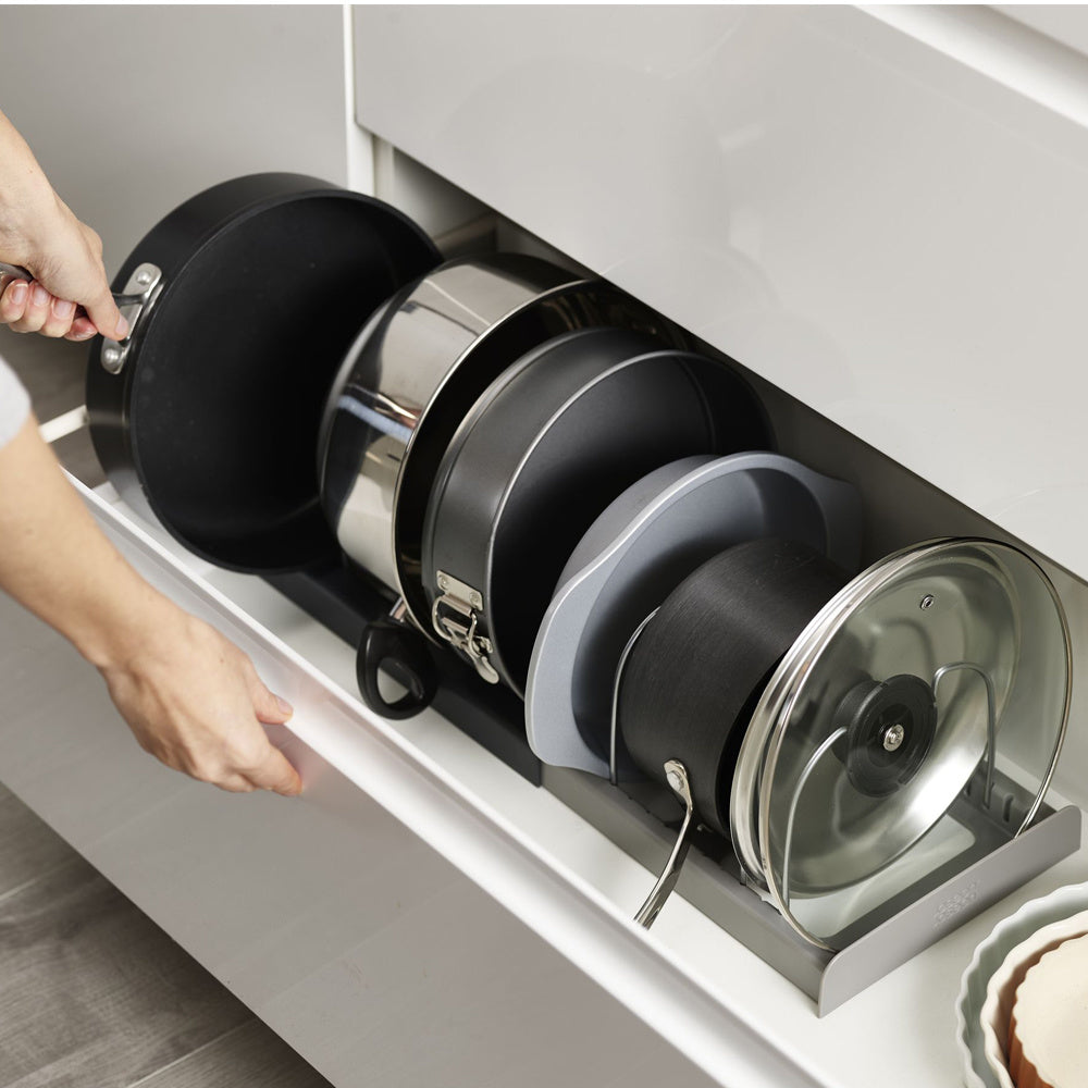 Zoek je een overzichtelijke manier om al je potten en pannen op te bergen? Dan is deze DrawerStore uitschuifbare kookgerei organiser echt iets voor jou! Hij is namelijk perfect voor het opbergen van pannen, deksels, bakplaten en bakblikken. Dankzij het uitschuifbare design is de organiser aan te passen aan het formaat van de lade of kast. De 7 verdelers zijn verstelbaar, krasvrij en hebben handige sleuven waar de handgreep van deksels gemakkelijk in passen. Dankzij de antislip voetjes blijft de organiser stevig op zijn plek staan. Hij is daarnaast eventueel schoon te maken in de vaatwasser.