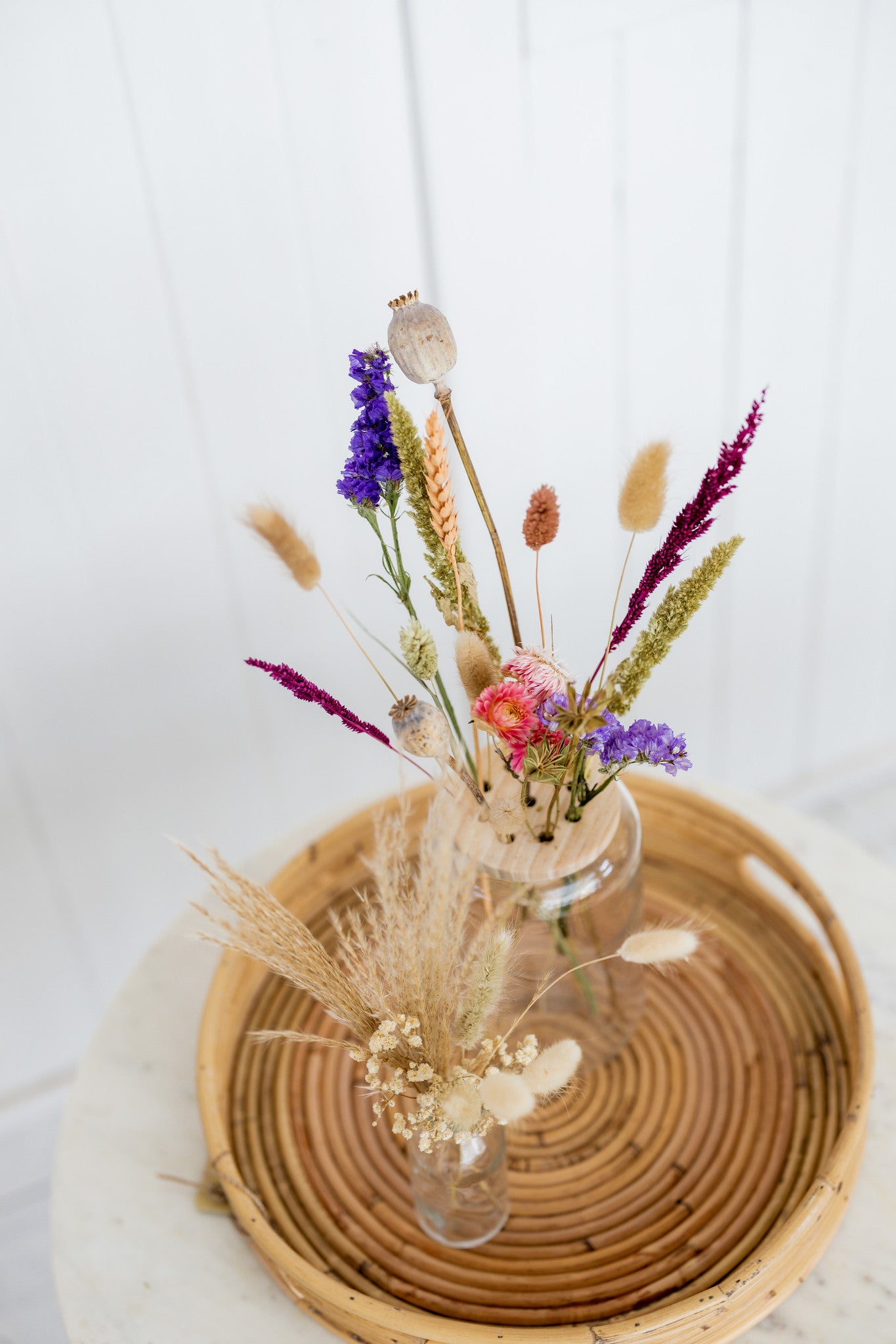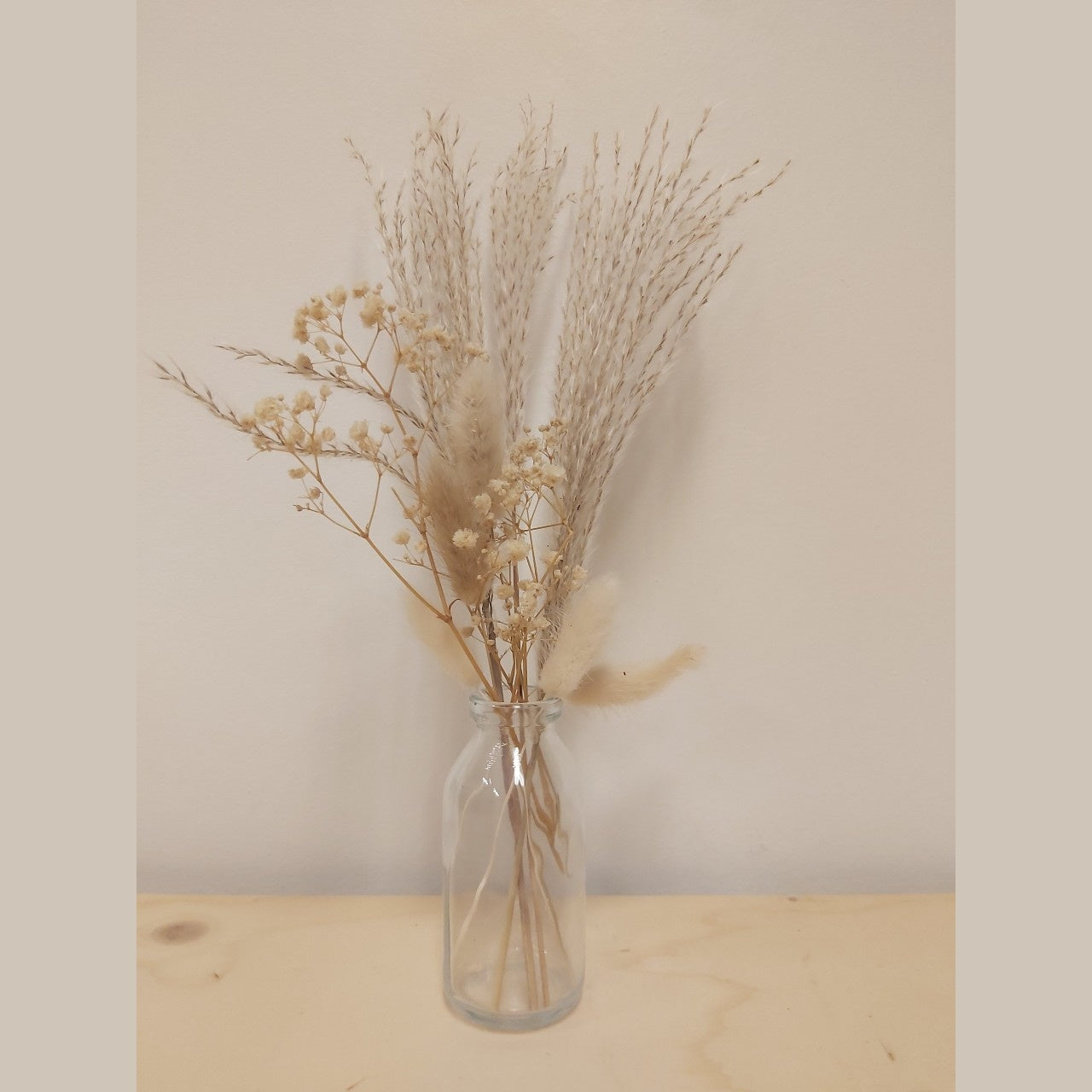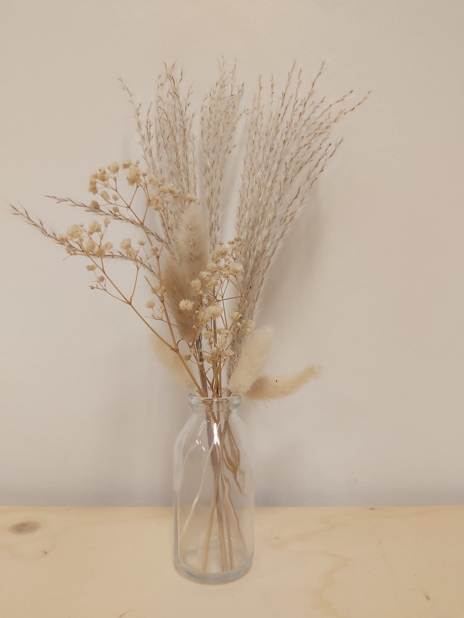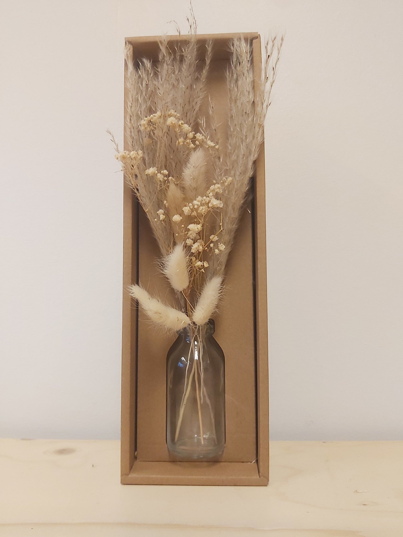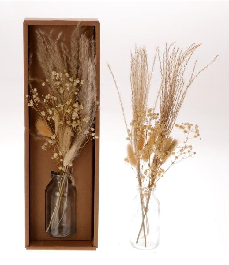 Vaasje droogbloemen set naturel wordt geleverd met een schattig boeketje en bijbehorend vaasje. Het vaasje is ongeveer 10 centimeter hoog waarbij de droogbloemen ongeveer 20 centimeter hierboven uitsteken.