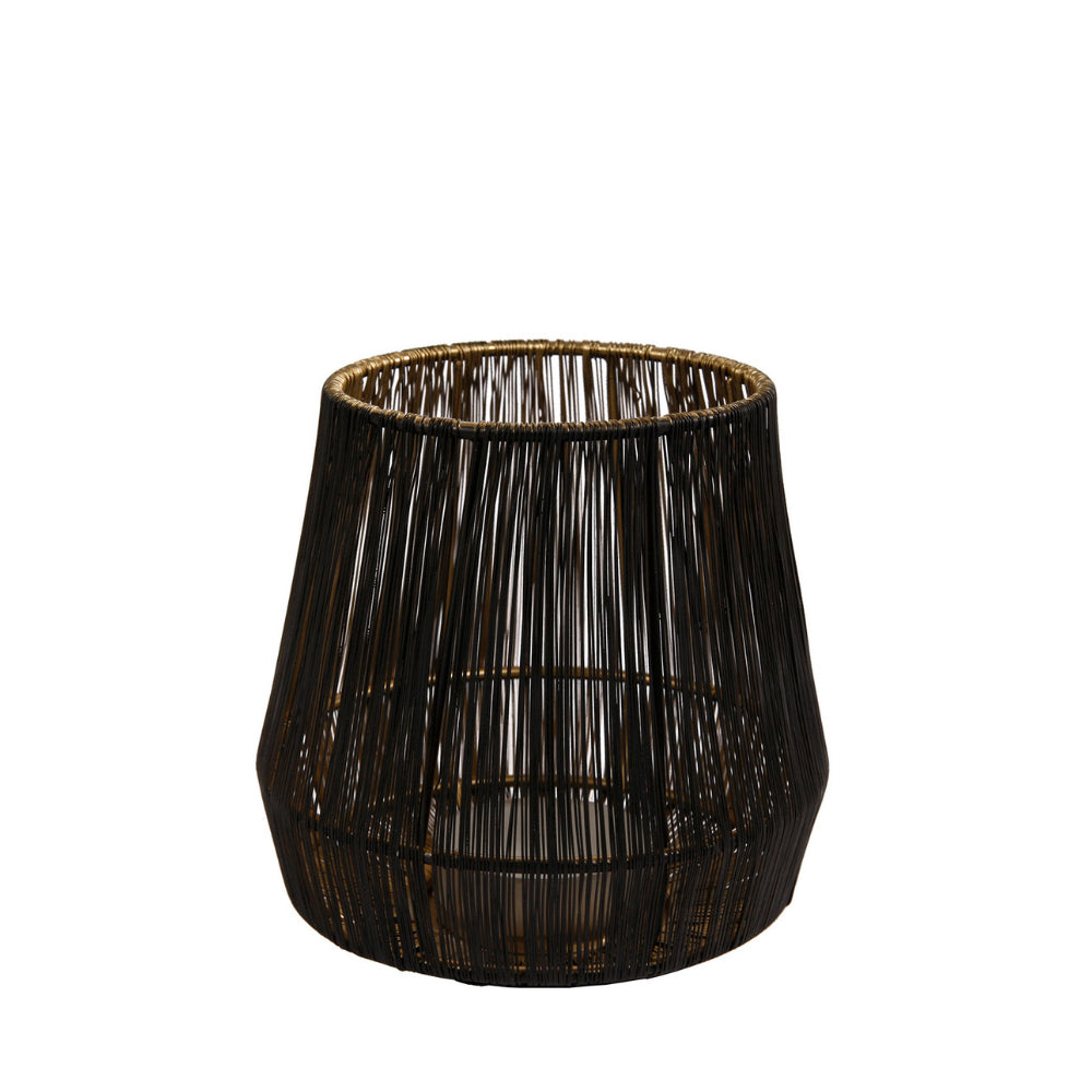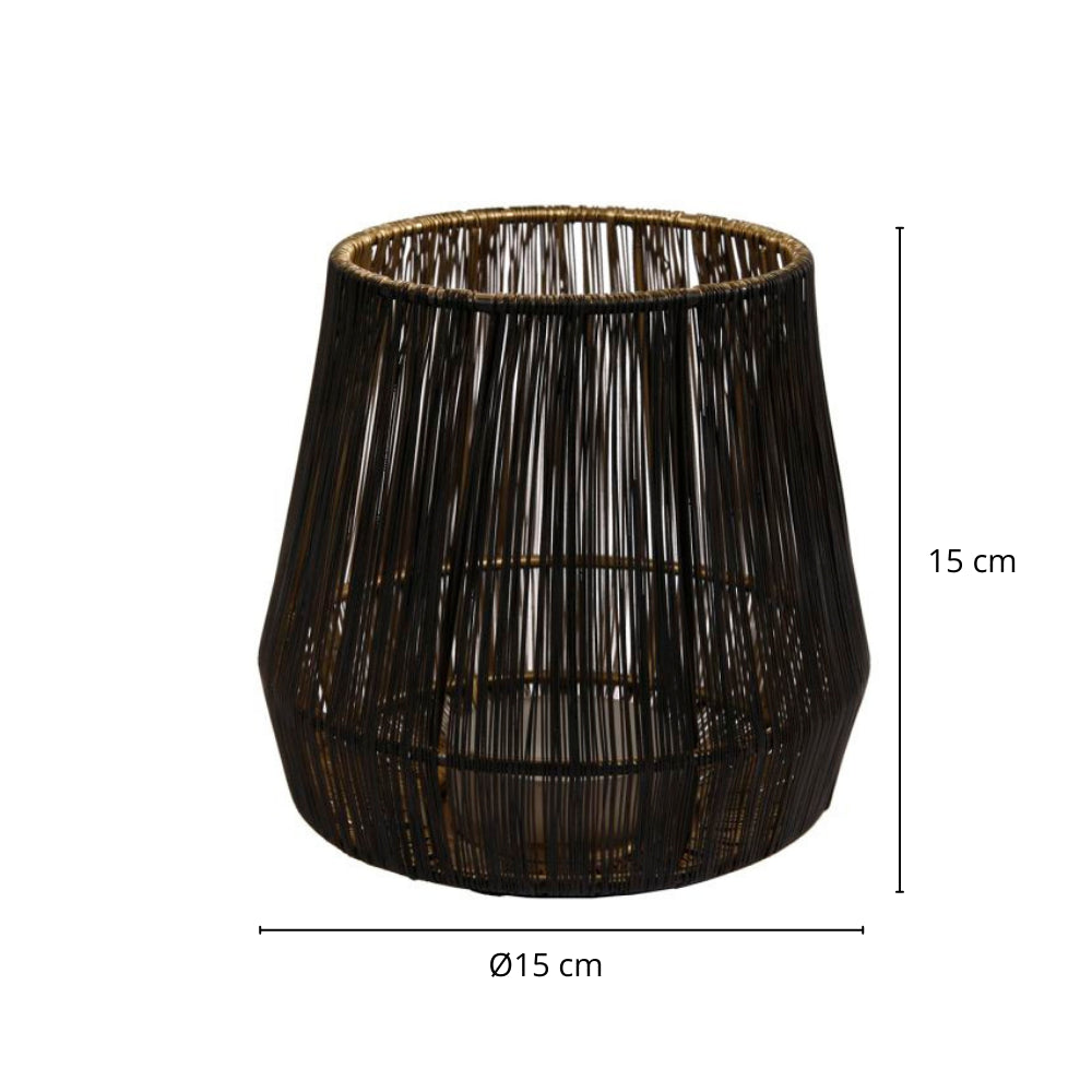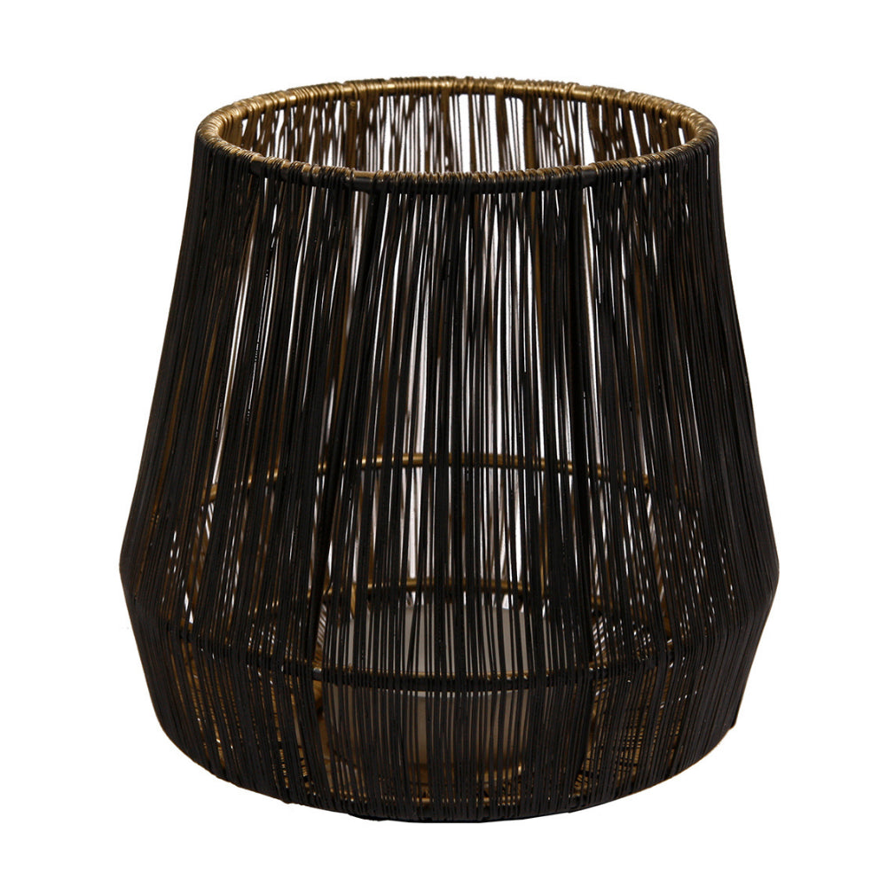 Dit windlicht heeft een goud metalen frame en is ingewikkeld met zwarte draad. Een bijzonder vormgegeven product en ook brandveilig. De draad is namelijk gemaakt van metaal. Hij is geschikt voor zowel stompkaarsen als waxinelichtjes. Het windlicht weegt 1.1 kilogram en staat verder stabiel op zijn plek. Tot slot is de onderkant voorzien van vilt, om krassen en schuiven te voorkomen. Unieke productkenmerken