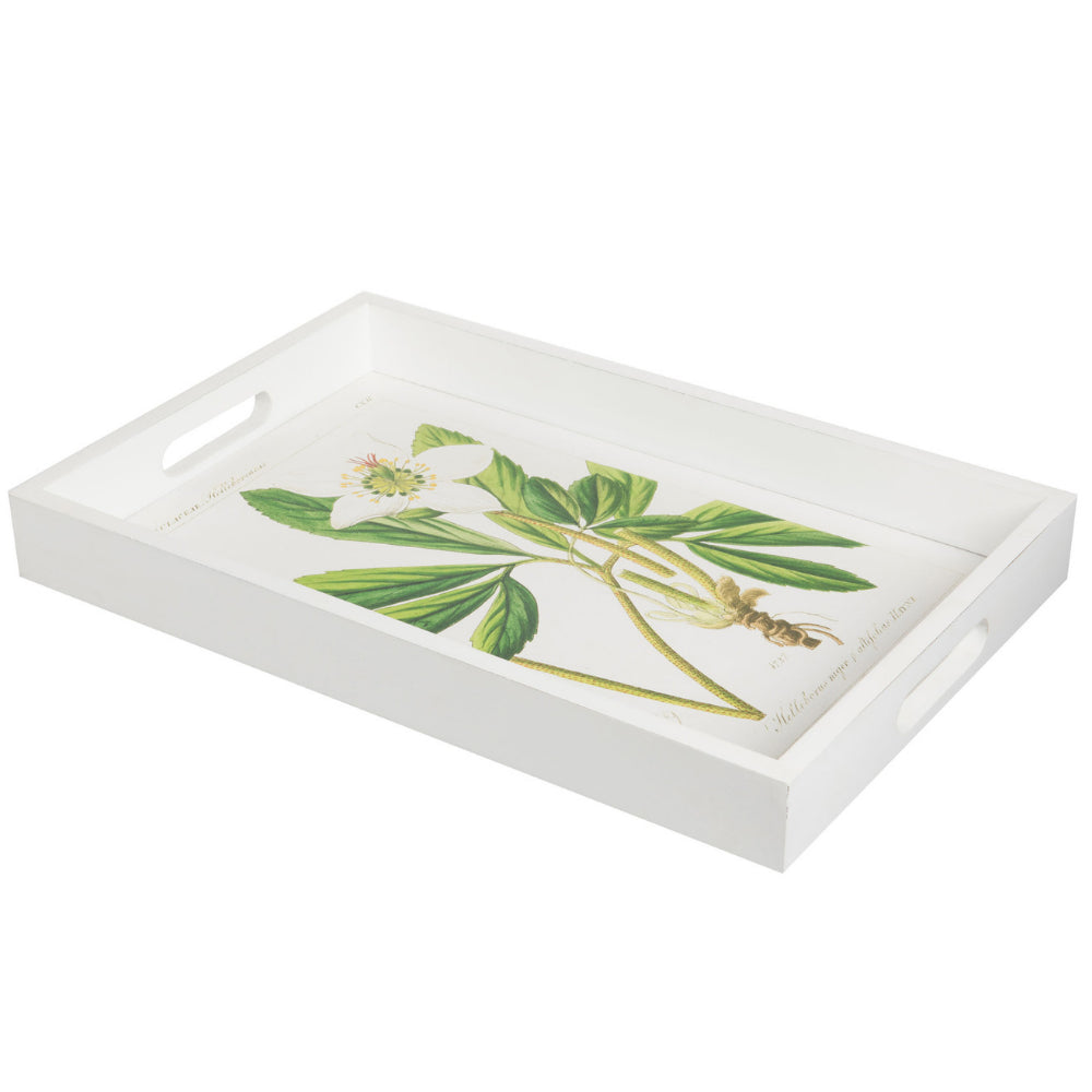 Mooi en vooral ook een handig rechthoekig dienblad. Hij heeft een witte kleur en is gemaakt van MDF hout. Het dienblad heeft een stijlvolle planten opdruk. Dit maakt hem erg decoratief. Ook kan het dienblad tegen vocht, de sterke laklaag geeft namelijk voldoende bescherming. Daarnaast is hij daarmee ook eenvoudig schoon te houden. Verder kun je met de 2 fijne handvaten ook praktisch dingen serveren. Het dienblad weegt 1 kilogram. Unieke productkenmerken