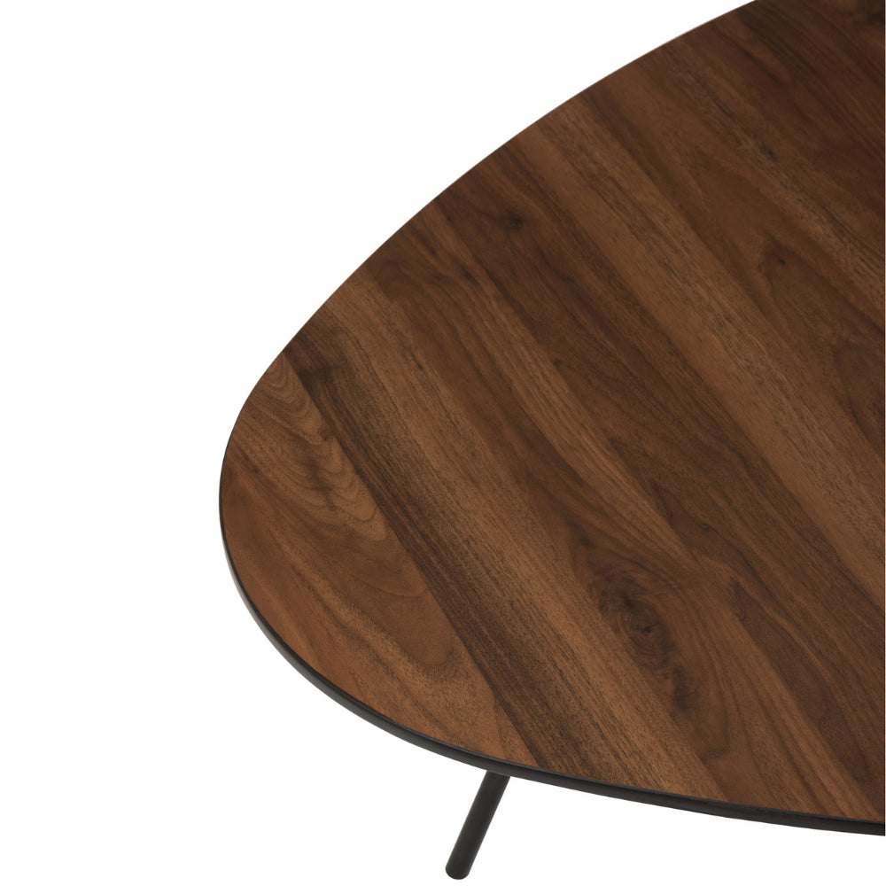 Het blad van deze salontafel is bruin van kleur en gemaakt van mdf hout met een sterke laag fineer. Het onderstel is verder gemaakt van metaal. Hij is goed bestand tegen vuil, vocht en krassen. De tafel weegt 11 kilogram en blijft daardoor goed op zijn plek staan. Hij is driehoekig van vorm, waarbij de hoeken afgerond zijn. De salontafel is vrij laag, waardoor een glas of bakje fruit gemakkelijk vanaf de bank weggezet kan worden. Unieke productkenmerken