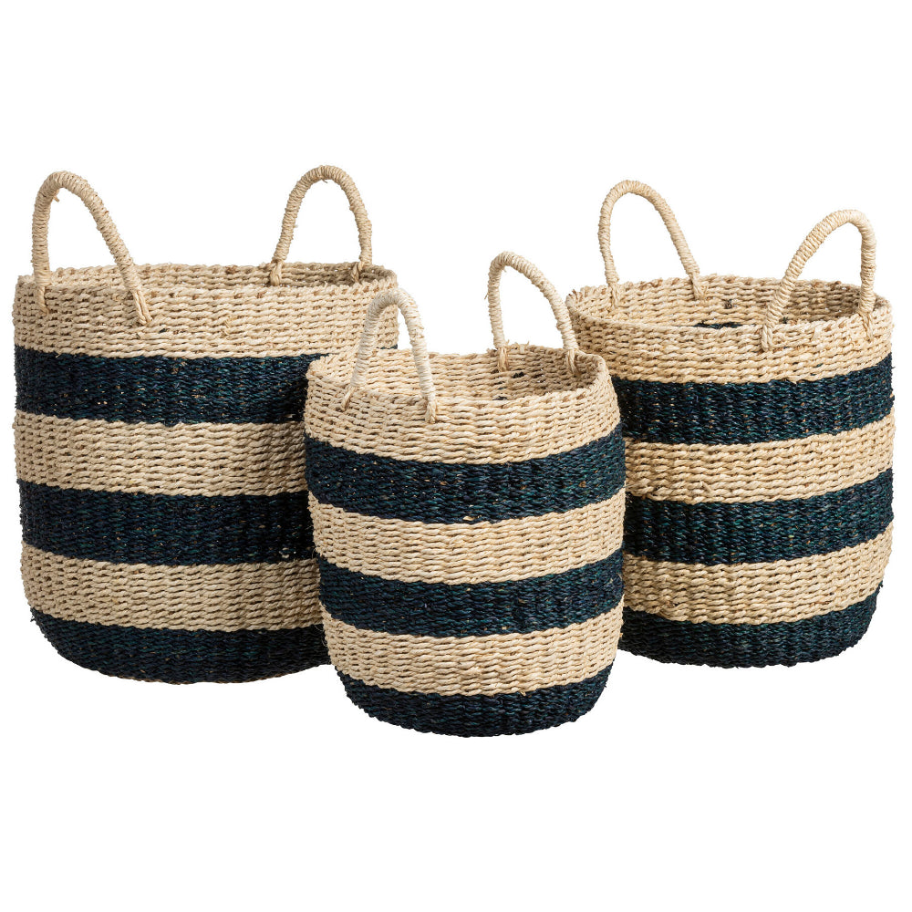 Leuke handige zeegras mand met strepen. De strepen zijn blauw van kleur. Het is een set van 3 manden die ook in elkaar passen als je ze wilt opbergen. Alle 3 de manden hebben fijne handvaten waarmee je ze eenvoudig kunt verplaatsen. Elke opbergmand is met de handgemaakt, dit betekent dat ze met de hand zijn gevlochten door vakbekwame handwerklieden. Het materiaal waarmee ze zijn gemaakt is zeegras. Een mooi natuurlijk en sterk materiaal dat een lange levensduur kent. Samen wegen de manden maar liefst 3 kilogram. Kortom: een praktische opberger voor kleine en grote rondslingerende spullen. Uniek aan dit product
