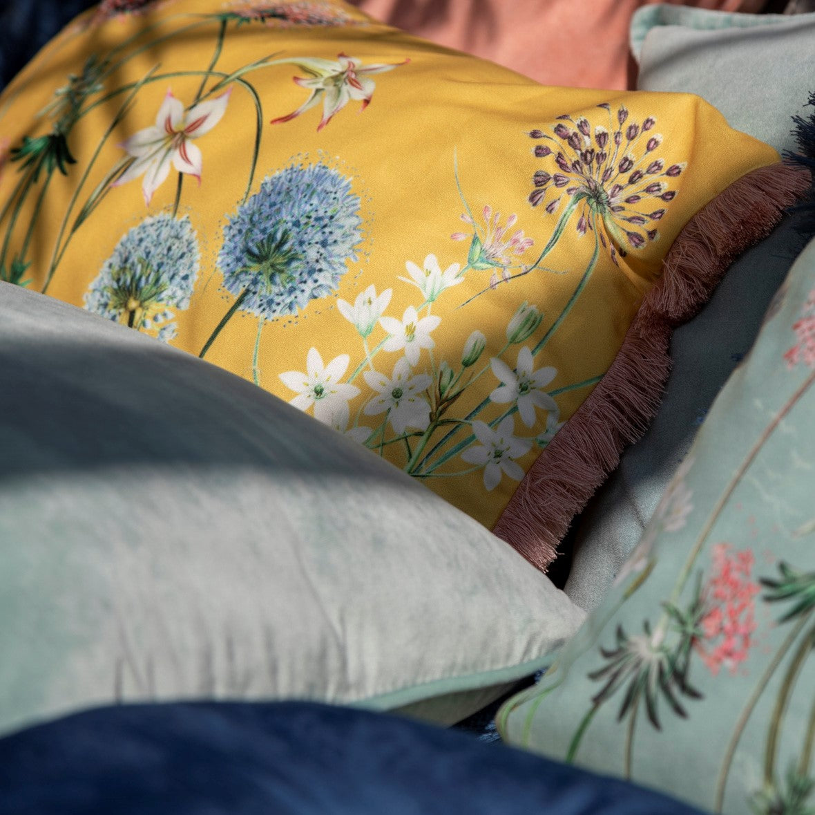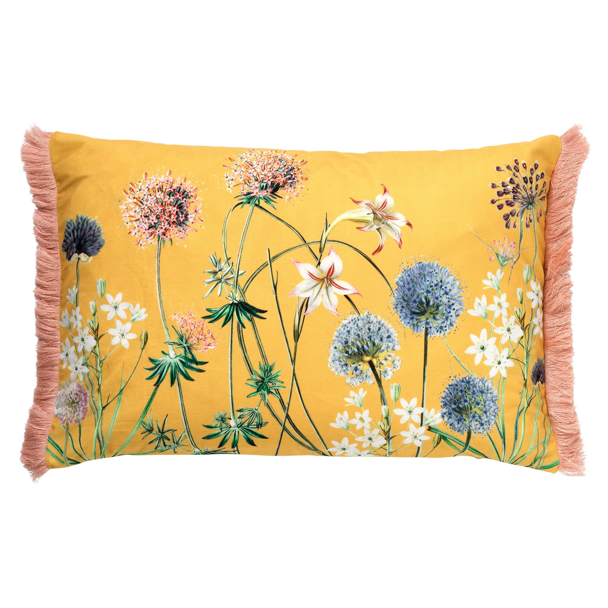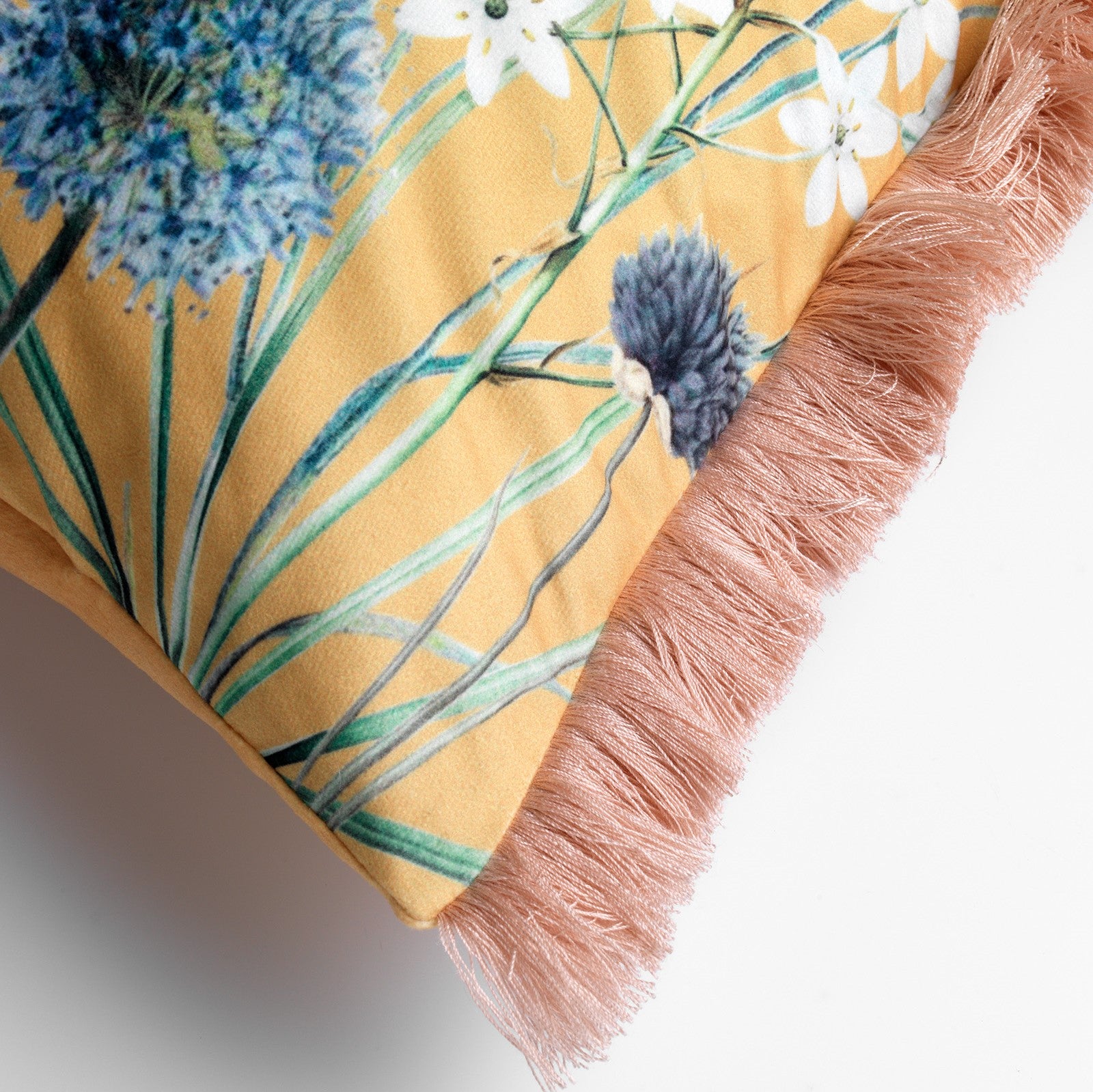 - Het kussen heeft een bloemenprint en franjes aan de zijkant