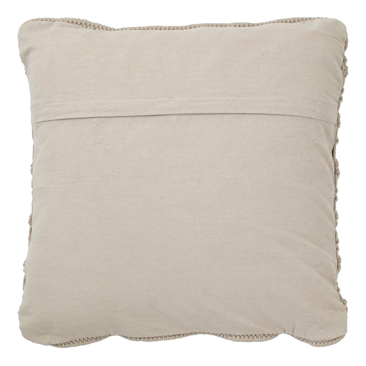 - Het kussen heeft op de voorkant een geknoopt motief van een wat stugger materiaal