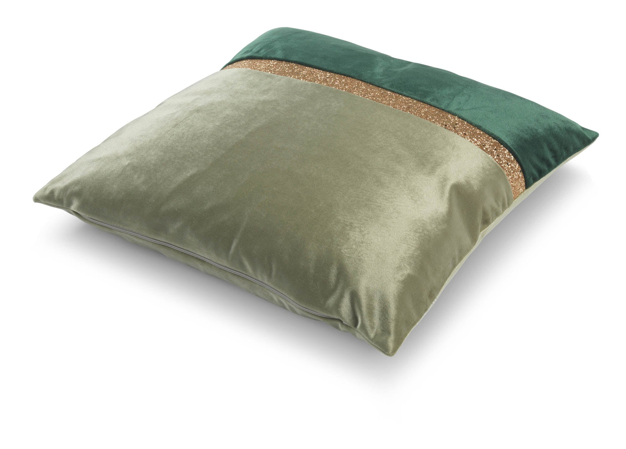 - Het kussen bestaat uit twee verschillende kleurvlakken die worden gescheiden door een glitter band