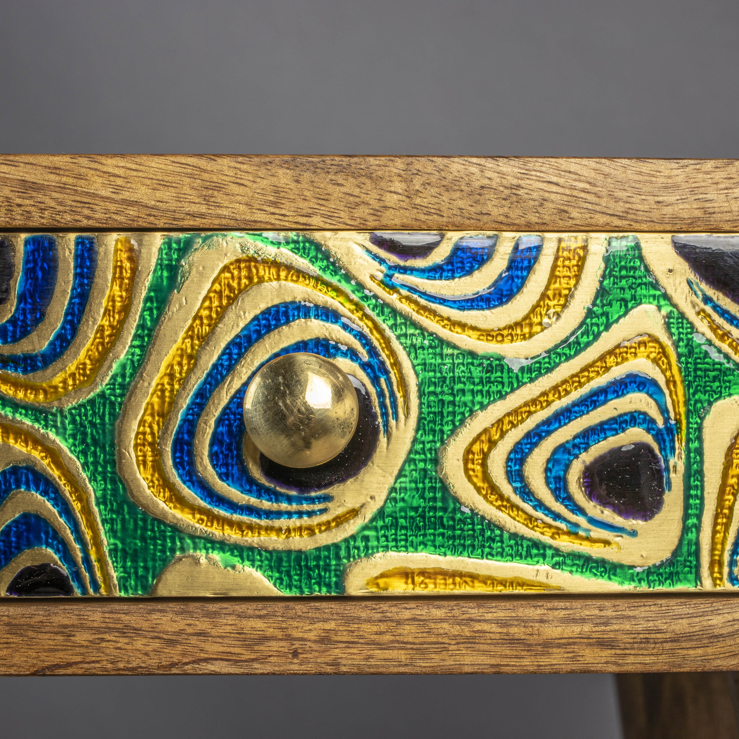 - Hij is gemaakt van gelakt mangohout met een ingelegd patroon van messing