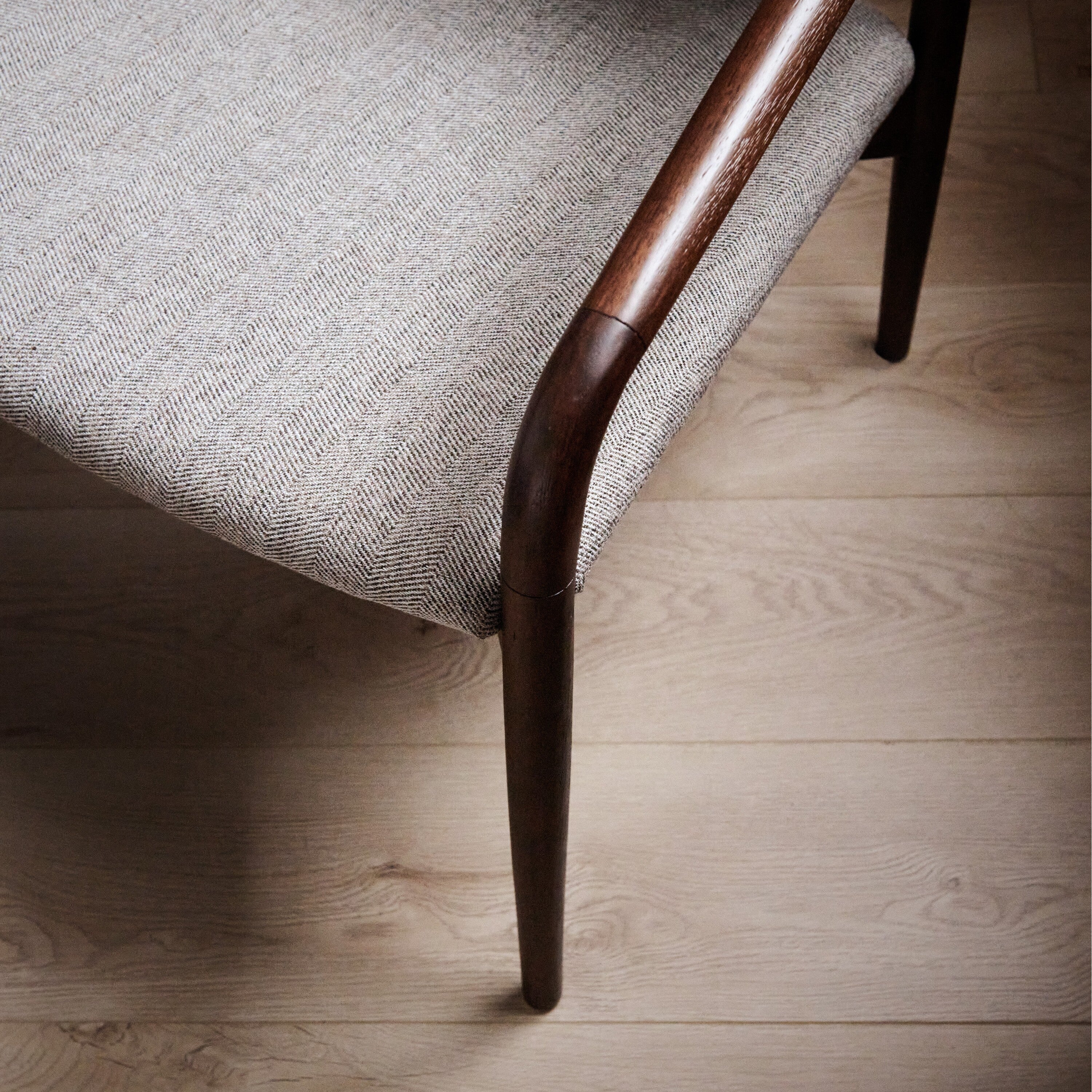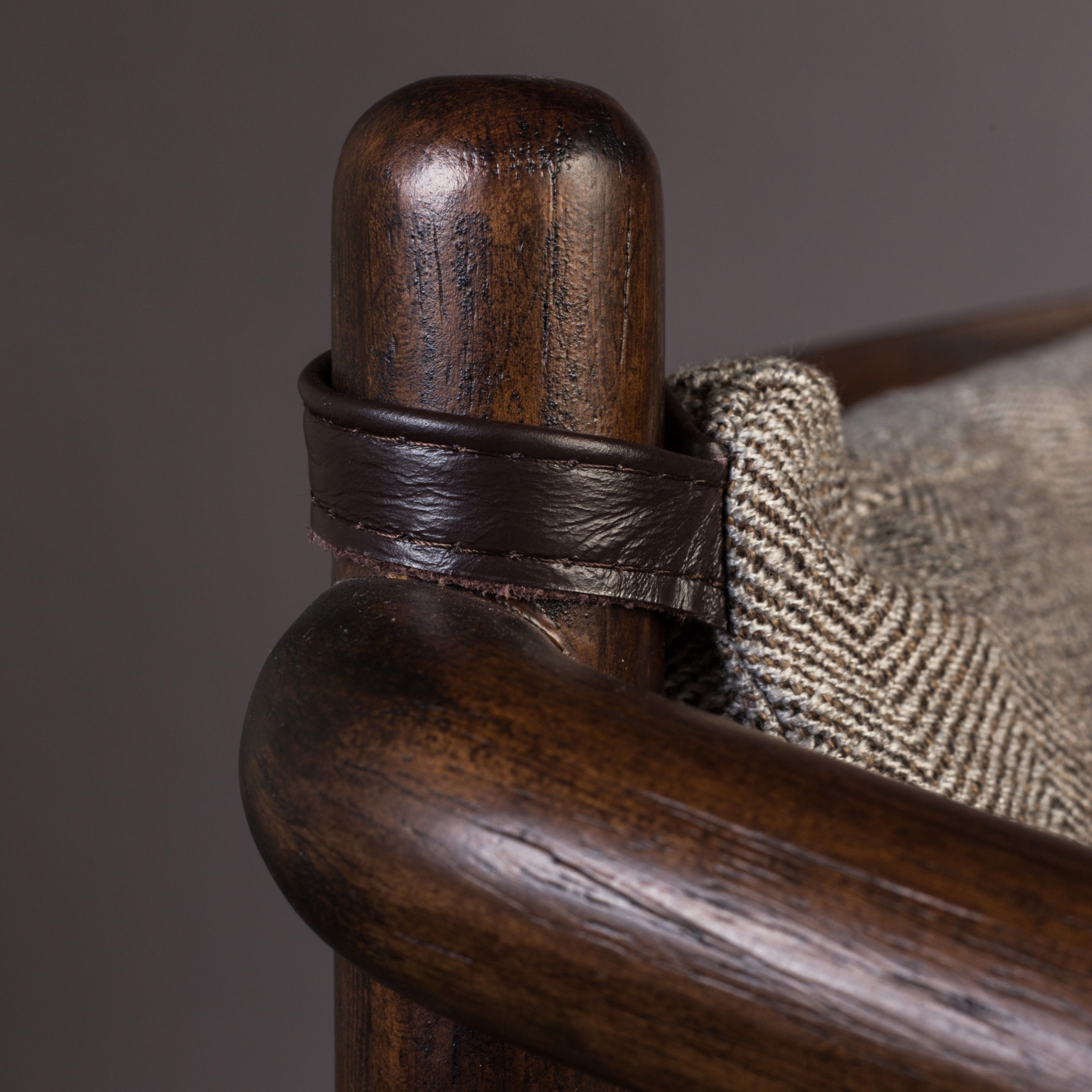 Retro modern design Het mooie donkere frame is gemaakt van gelakt rubberhout. De laklaag zorgt ervoor dat het hout lang mooi blijft. De zitting is gemaakt van polyestertextiel met het herkenbare herringbone patroon. De stoel zit lekker zacht dankzij de vulling van polyesterfoam. Het rugkussen heeft ook een textielen hoes, is gevuld met polyestervezels én is ook nog eens afneembaar. Zo kun je zelf kiezen voor welke look je gaat! De lage zithoogte (37,5 cm) zorgt ervoor dat je vanzelf een ontspannen houding aanneemt, terwijl je je armen laat rusten op de armleuningen (59,5 cm). Boek erbij en genieten maar!