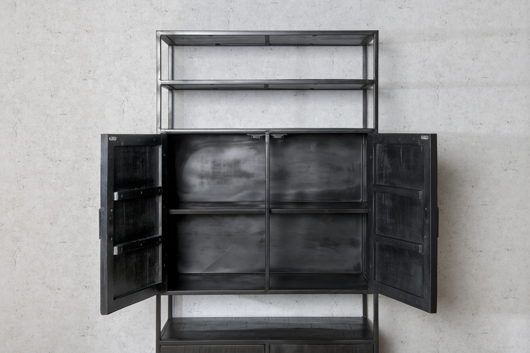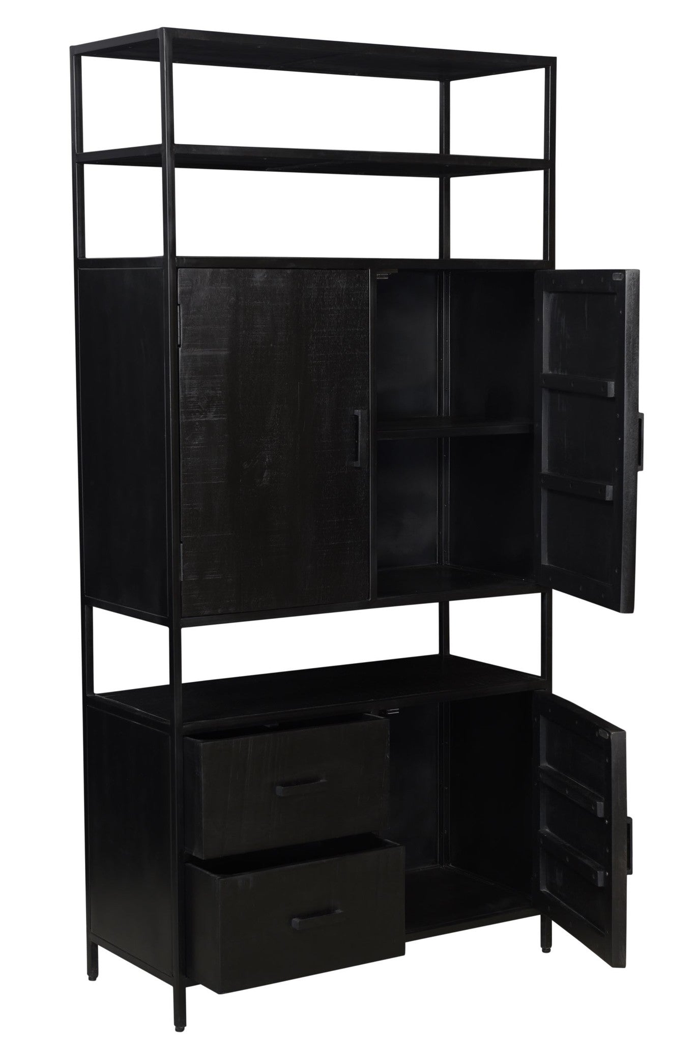 Black Omerta - Buffetkast - mango - zwart - 3 deuren - 2 lades - stalen frame - zwart gecoat Black Omerta buffetkast vervaardigd in zwart mangohout met 3 deuren en 2 lades, ondersteund door een zwart gecoat stalen frame . De Black Omerta reeks meubelen geeft je interieur een zeer eigen industriële look waar je zelfs een beetje stil van wordt.