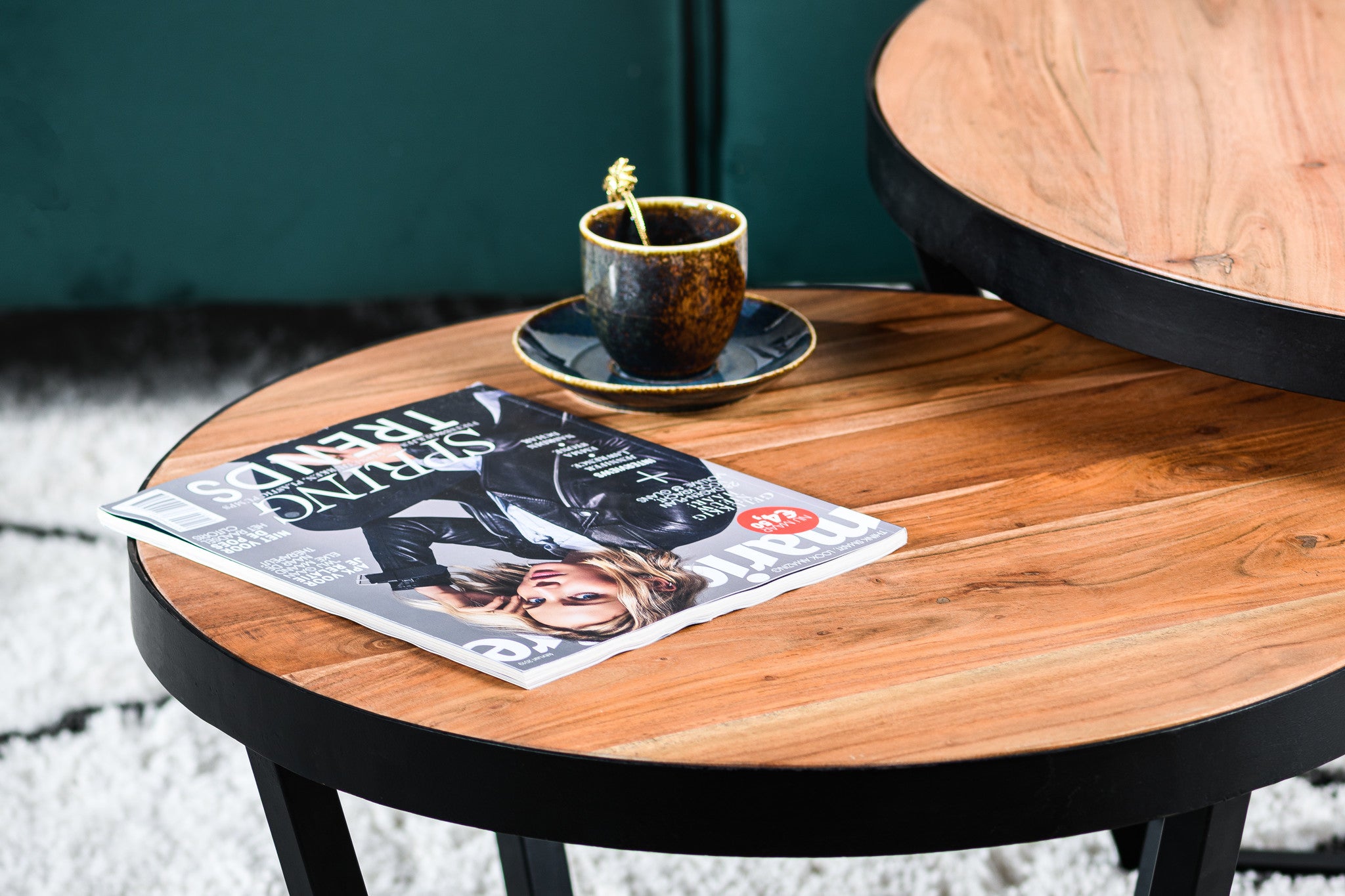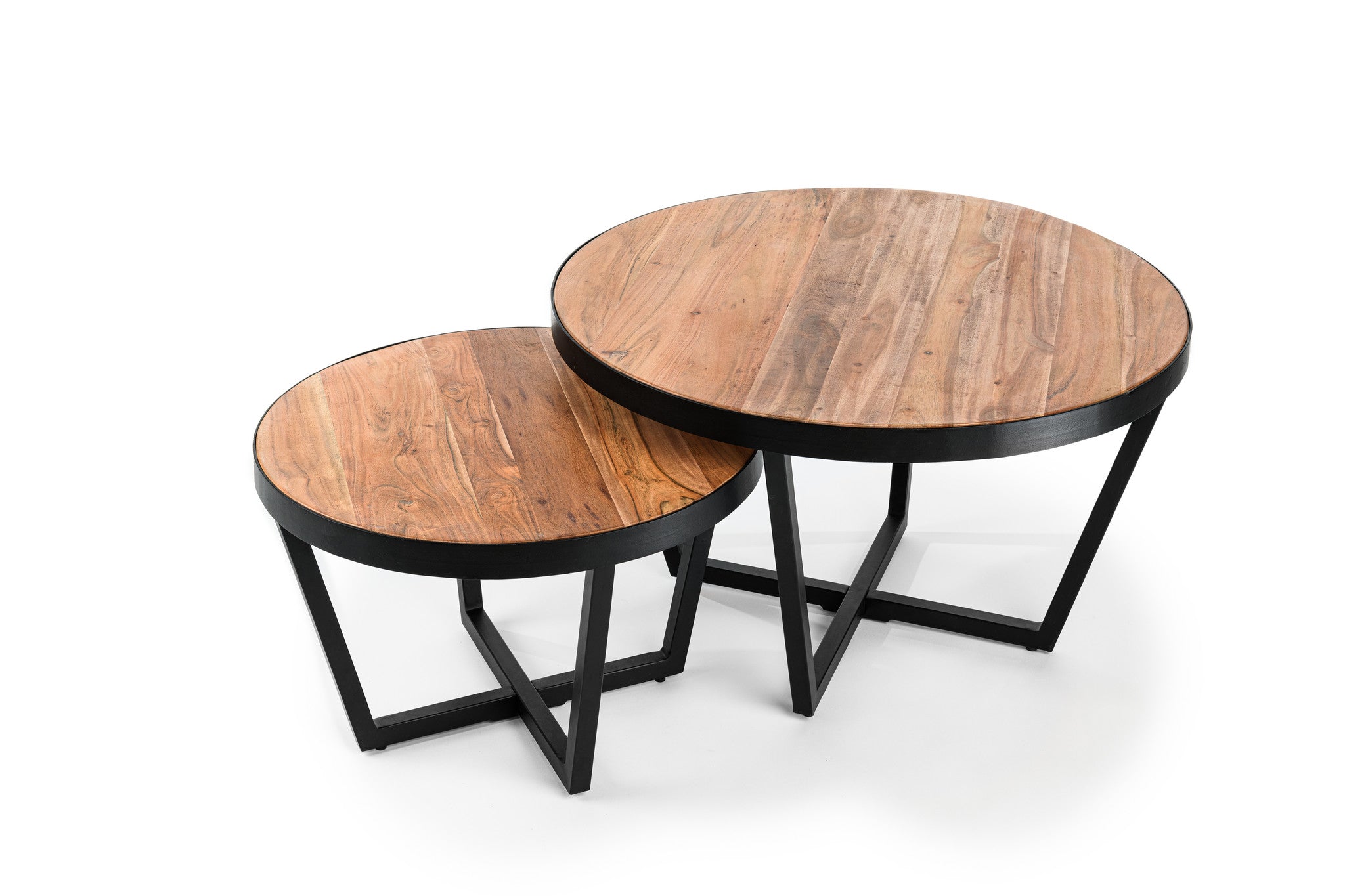 Cross Scandinavian - Salontafels - set van 2 - rond - acacia - naturel - stalen poten - gekruist Set van 2 Cross Scandinavische ronde salontafels met naturel acacia blad afgewerkt met stalen rand en gekruiste stalen poten