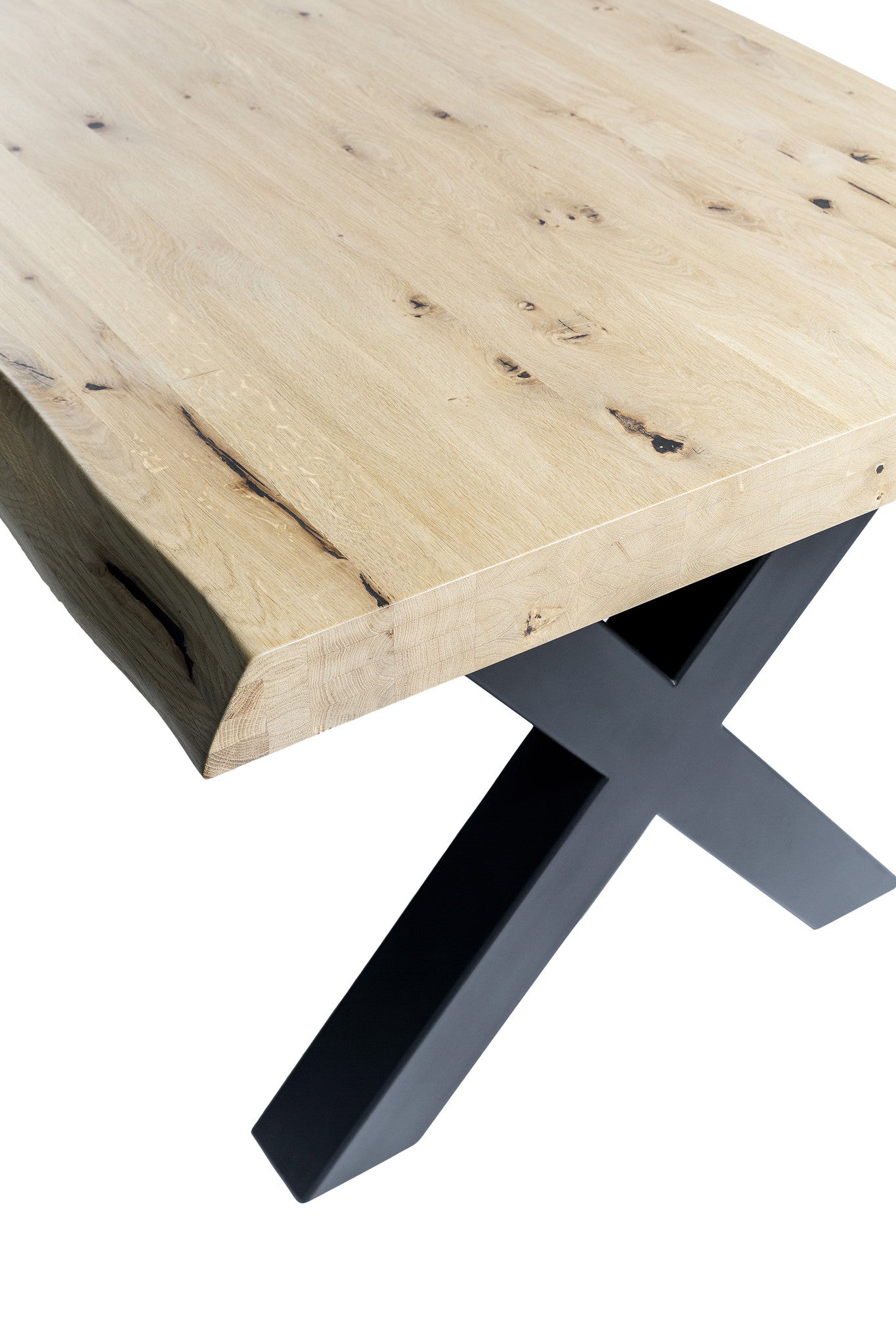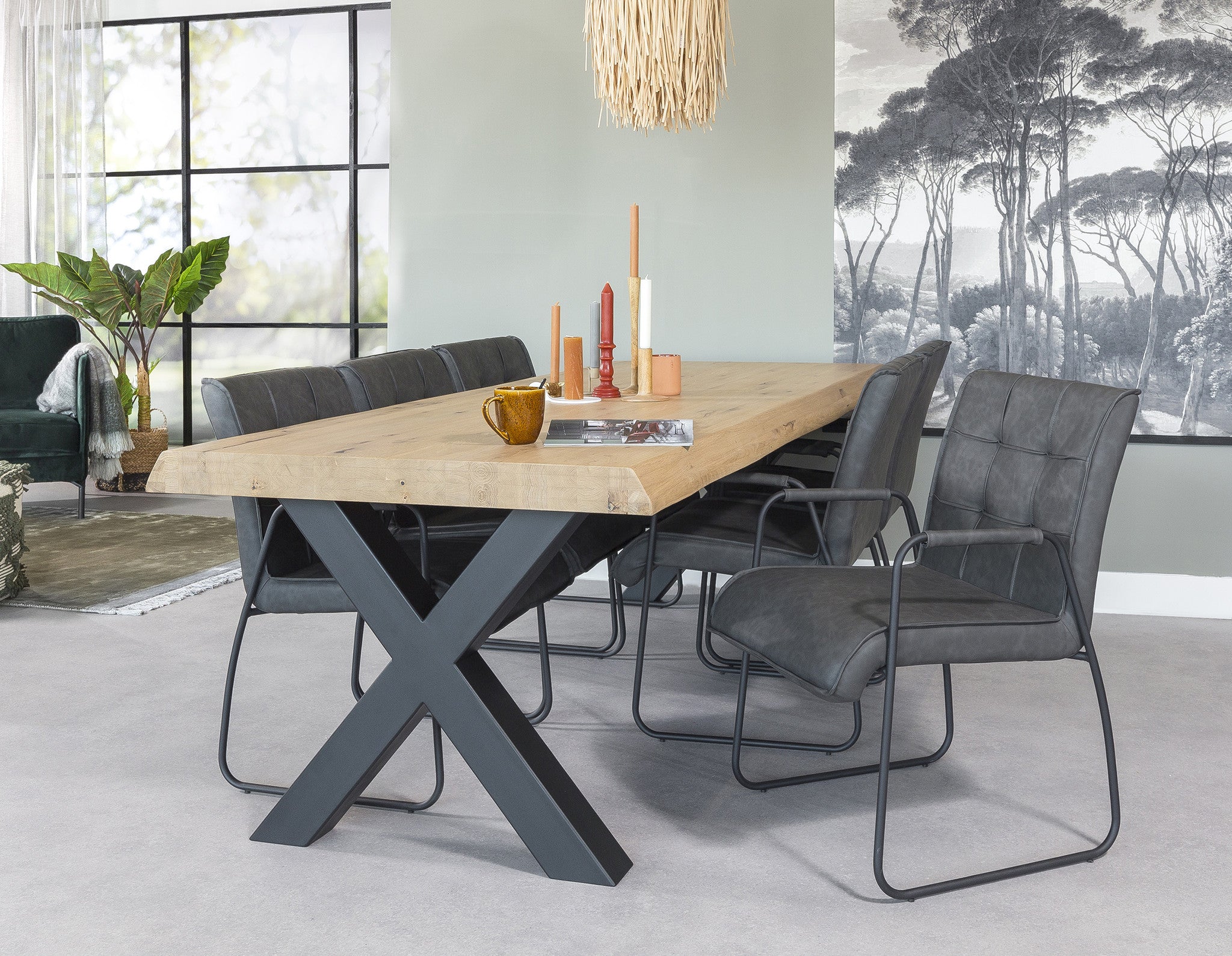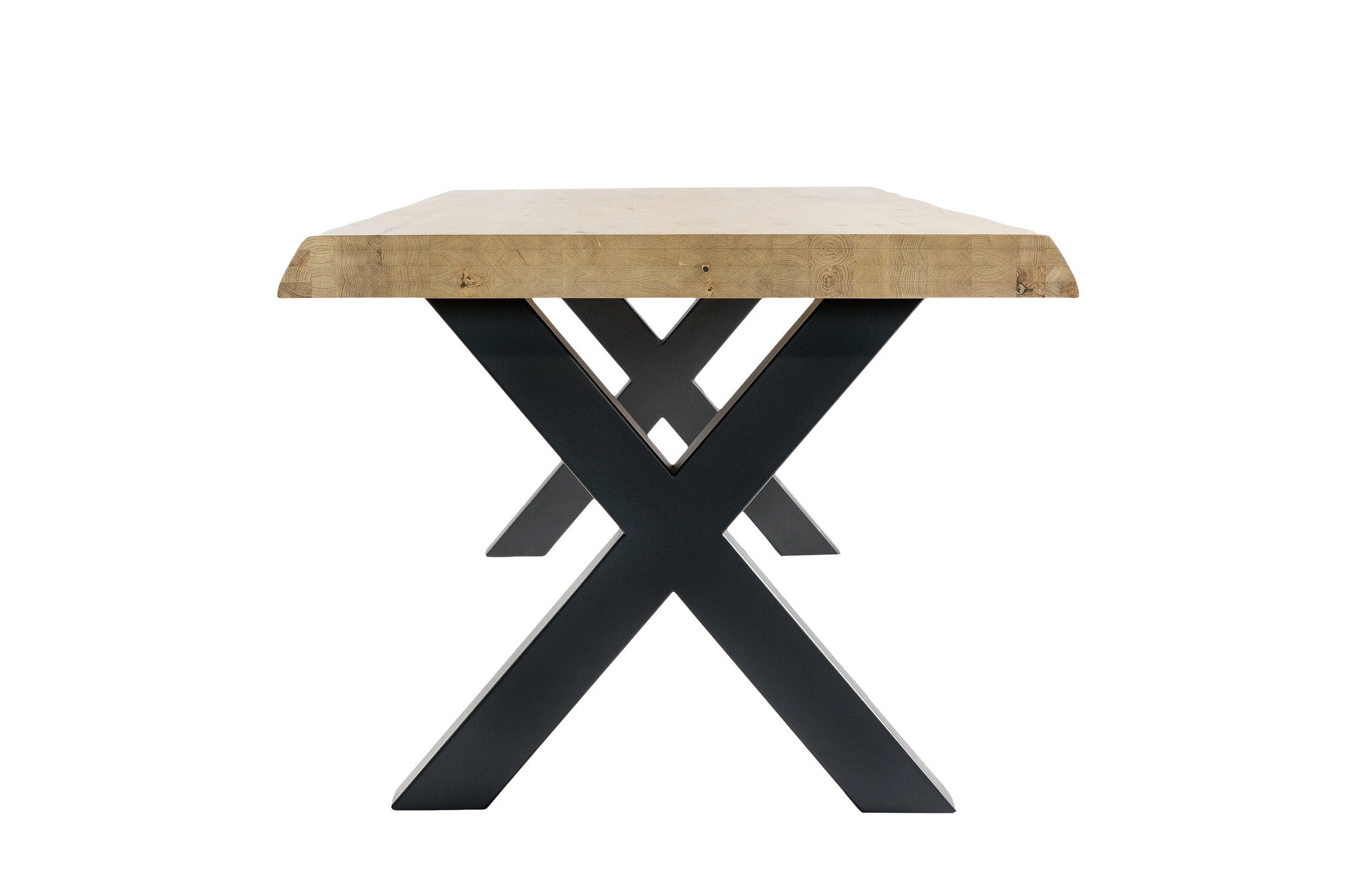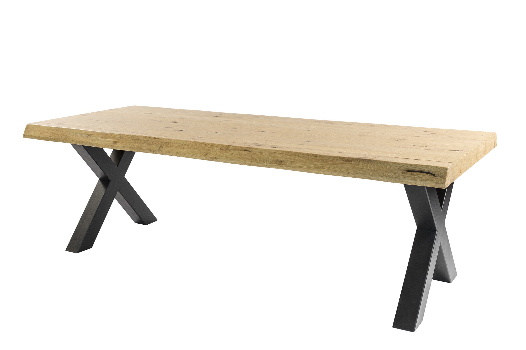 Deze klassevolle rechthoekige eettafel met een naturel eiken boomstam blad en stalen X-poten is een echte eyecatcher in je interieur. De tafel heeft een stoere design look en is perfect voor in je eetkamer, eethoek of woonkamer. De tafel is gemaakt van duurzaam materiaal en is daardoor geschikt voor dagelijks gebruik. De afmetingen van de tafel zijn 240x100, waardoor deze in veel verschillende ruimtes past. Sfeervol wonen
