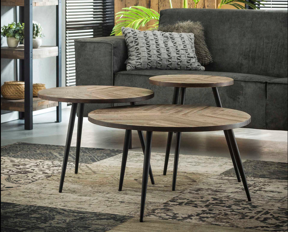 Deze salontafel set bestaande uit drie tafeltjes is gemaakt met ingelegd verweerd teakhout.