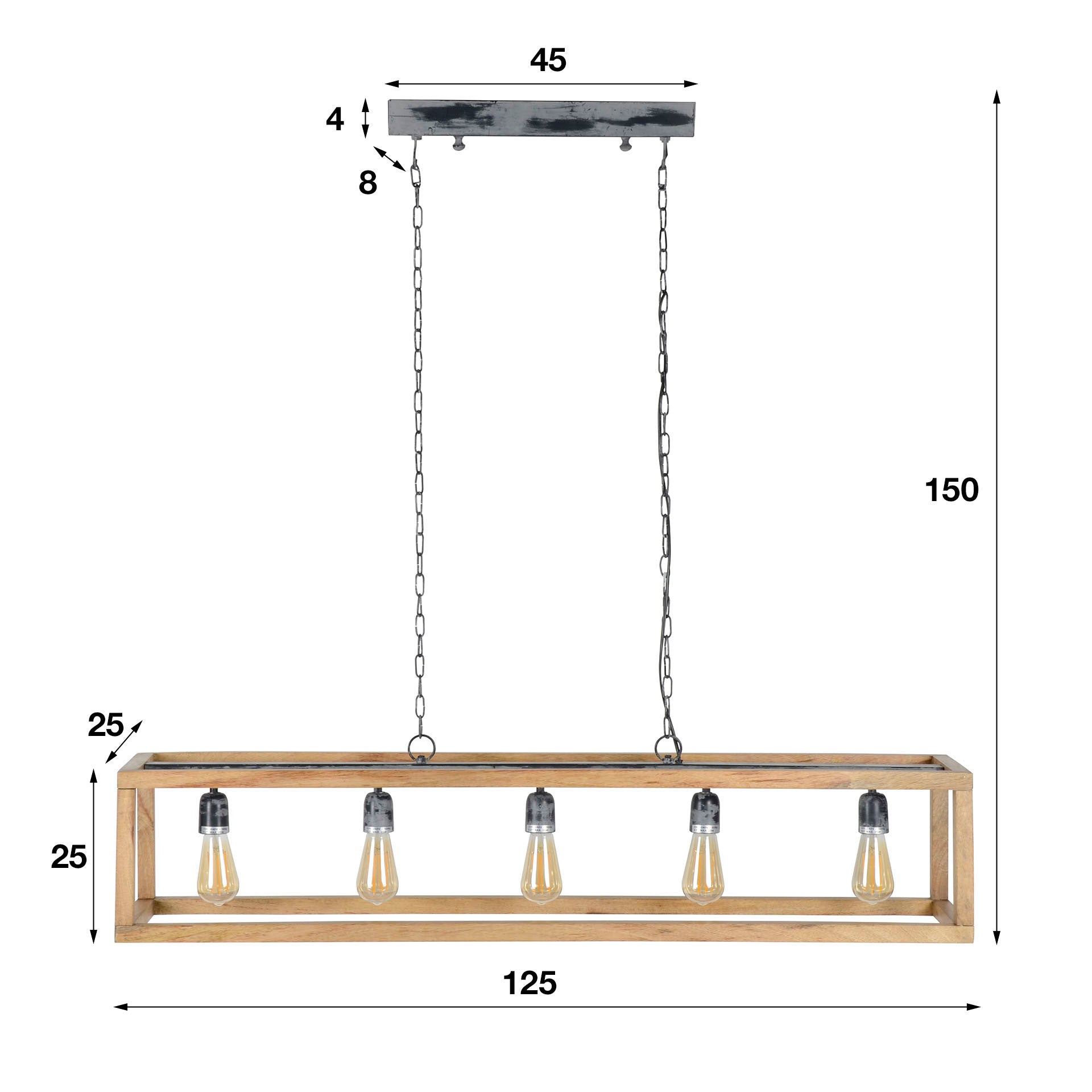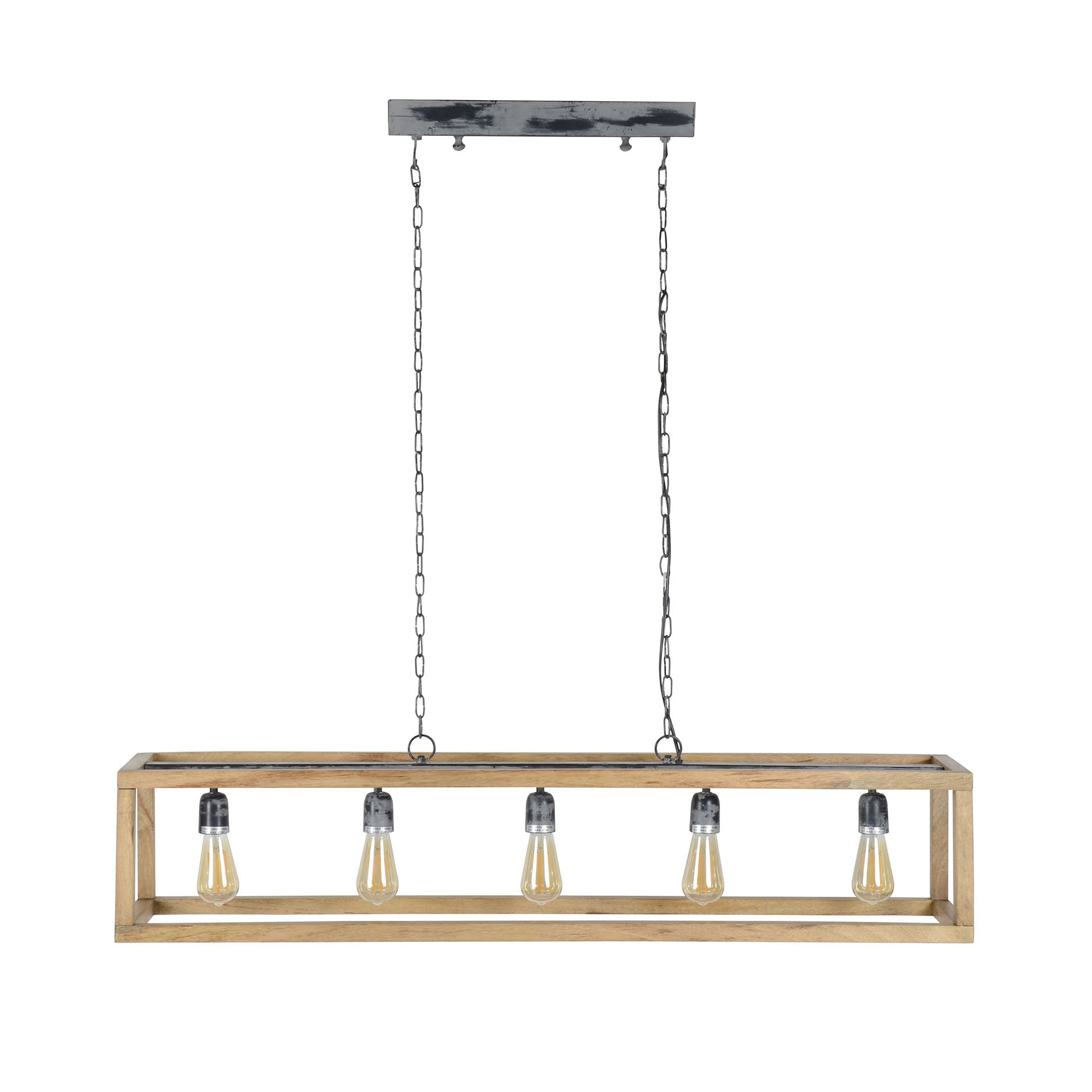 Massive Mango - Hanglamp - houten frame - rechthoekig - 5 lichtpunten Deze rechthoekige hanglamp is uitgevoerd in massief mangohout in een breed houten frame. Hierdoor biedt de lamp voldoende licht en is deze zeer geschikt voor een lange tafel. Dit model is ook beschikbaar met 7 lichtpunten. Lichtbron niet meegeleverd.