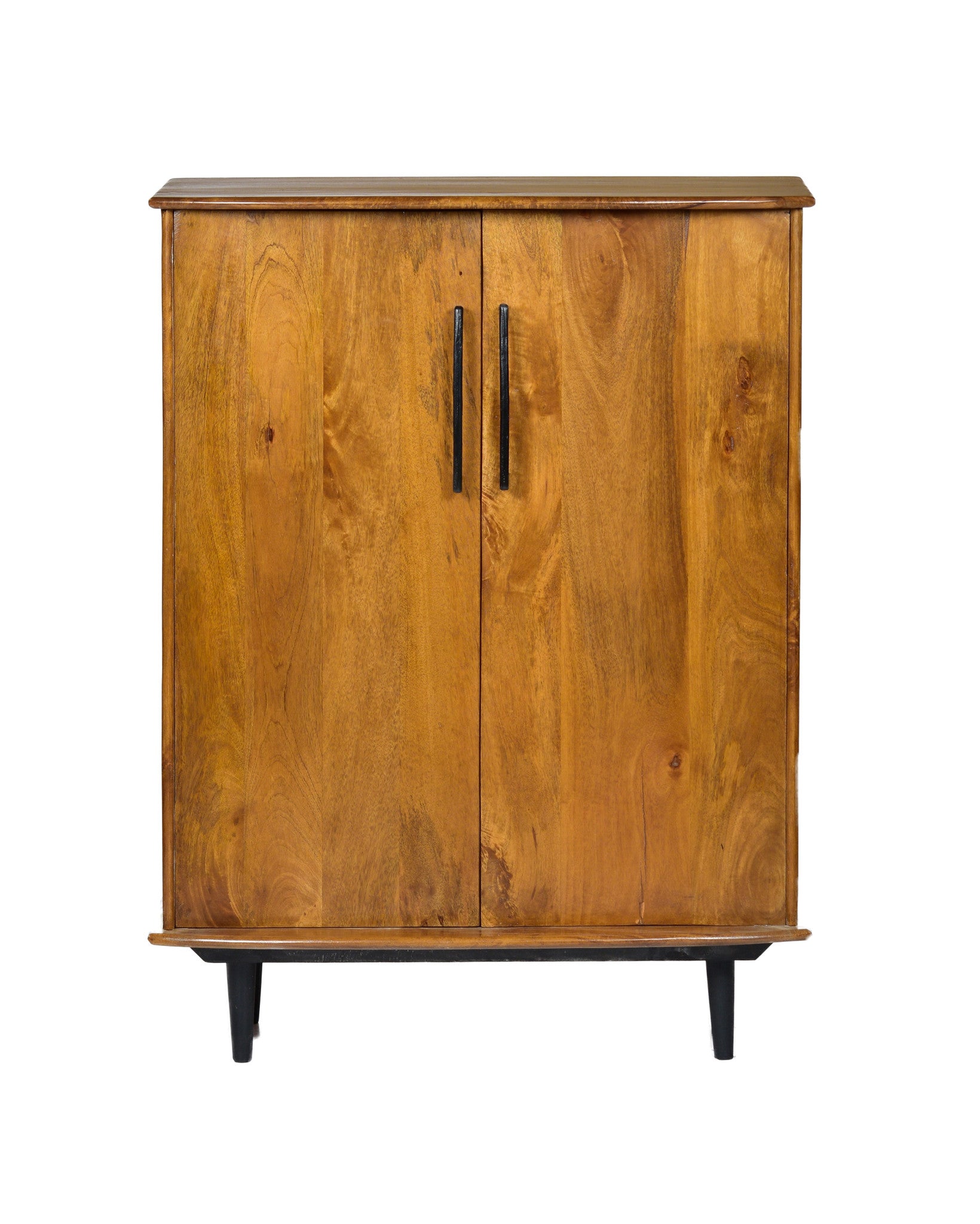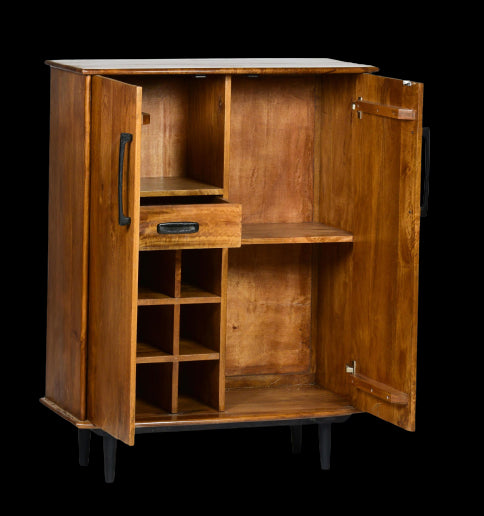 Nostalgic retro - Barkast - mangohout - bruin - 2 deuren - lade - flessenrek Nostalgisch retro barkast in naturel bruin massief mangohout en voorzien van 2 deuren, lade en flessenrek De Nostalgic retro lijn geeft je interieur een smaakvolle vintage look. Afwerking: Afgelakt Onderhoud: Zachte vochtige doek