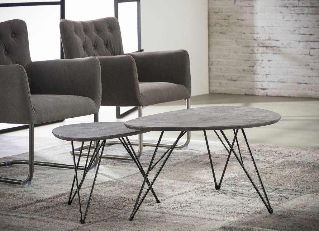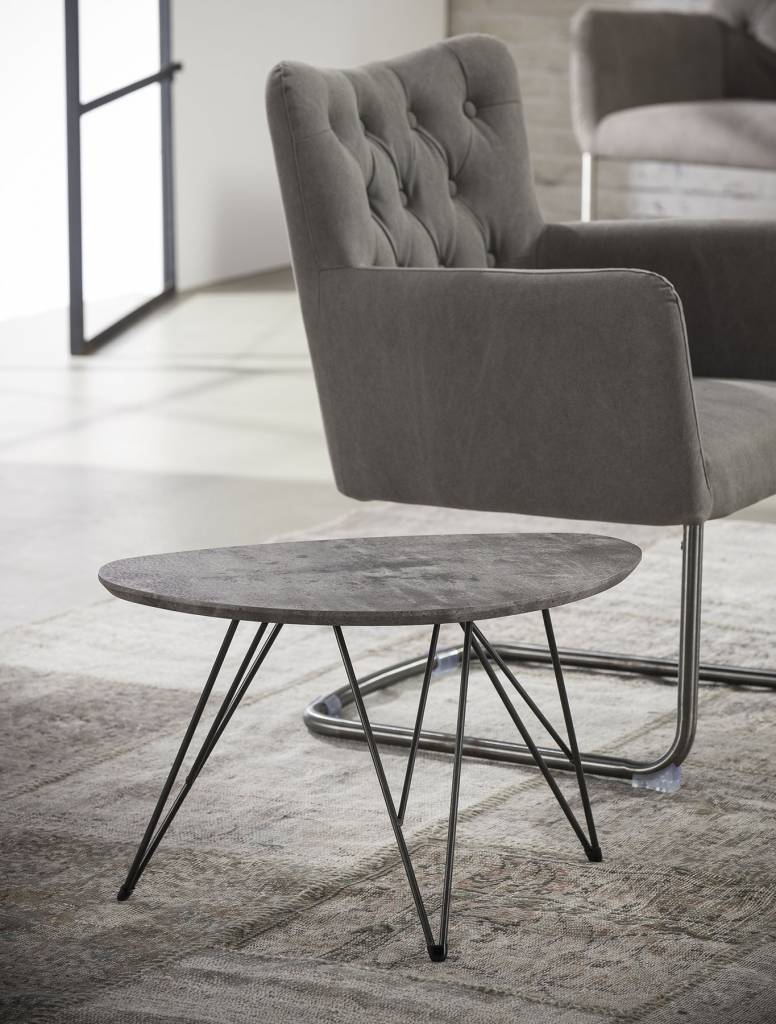 Salontafel is uitgevoerd in een MDF-blad, in een grijze betonlook 3D texture. Het blad is niervormig en heeft speelse pootjes in zwart gepoedercoat metaal.