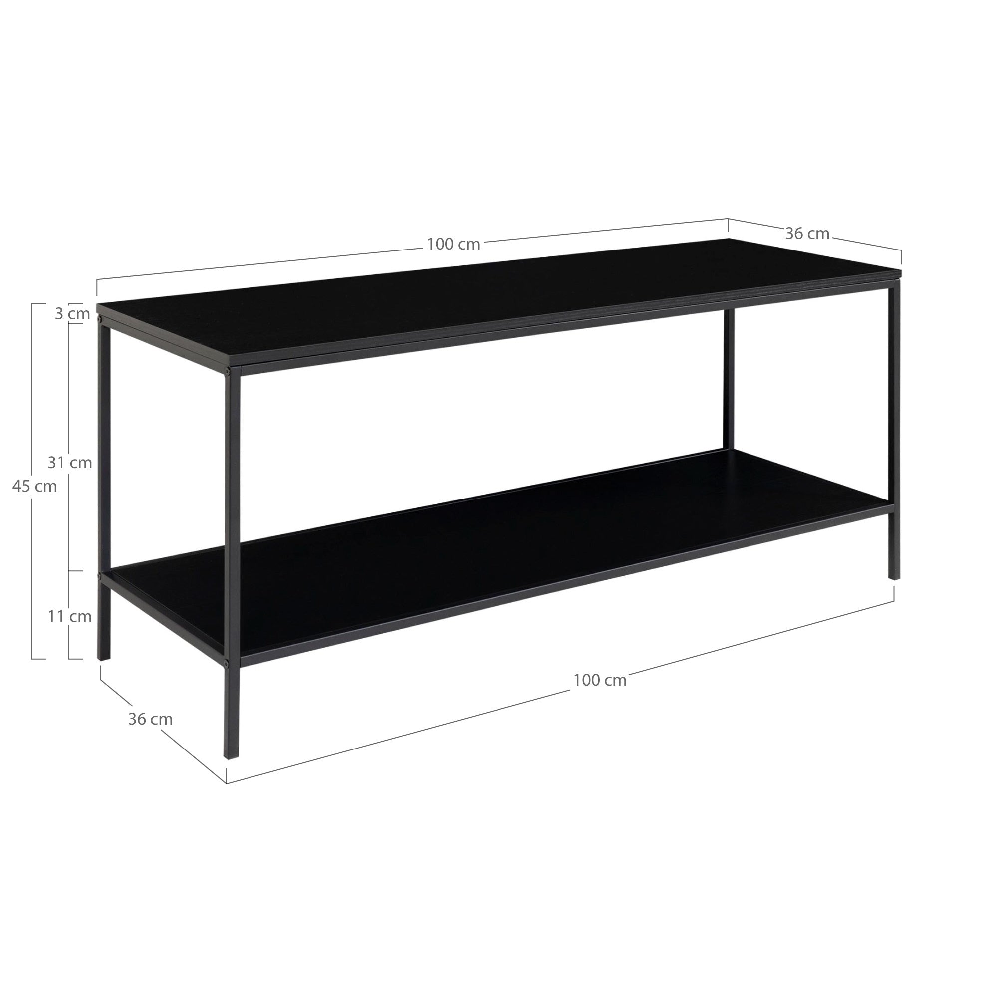 Scandibasic - TV-meubel - zwart - melamine spaanplaat - 2 leggers - staal frame - zwart - 100x45x36cm Scandinight TV-meubel in zwart melamine spaanplaat met 2 leggers ondersteund door een zwart stalen frame. Puur Scandinavisch design in al zijn eenvoud