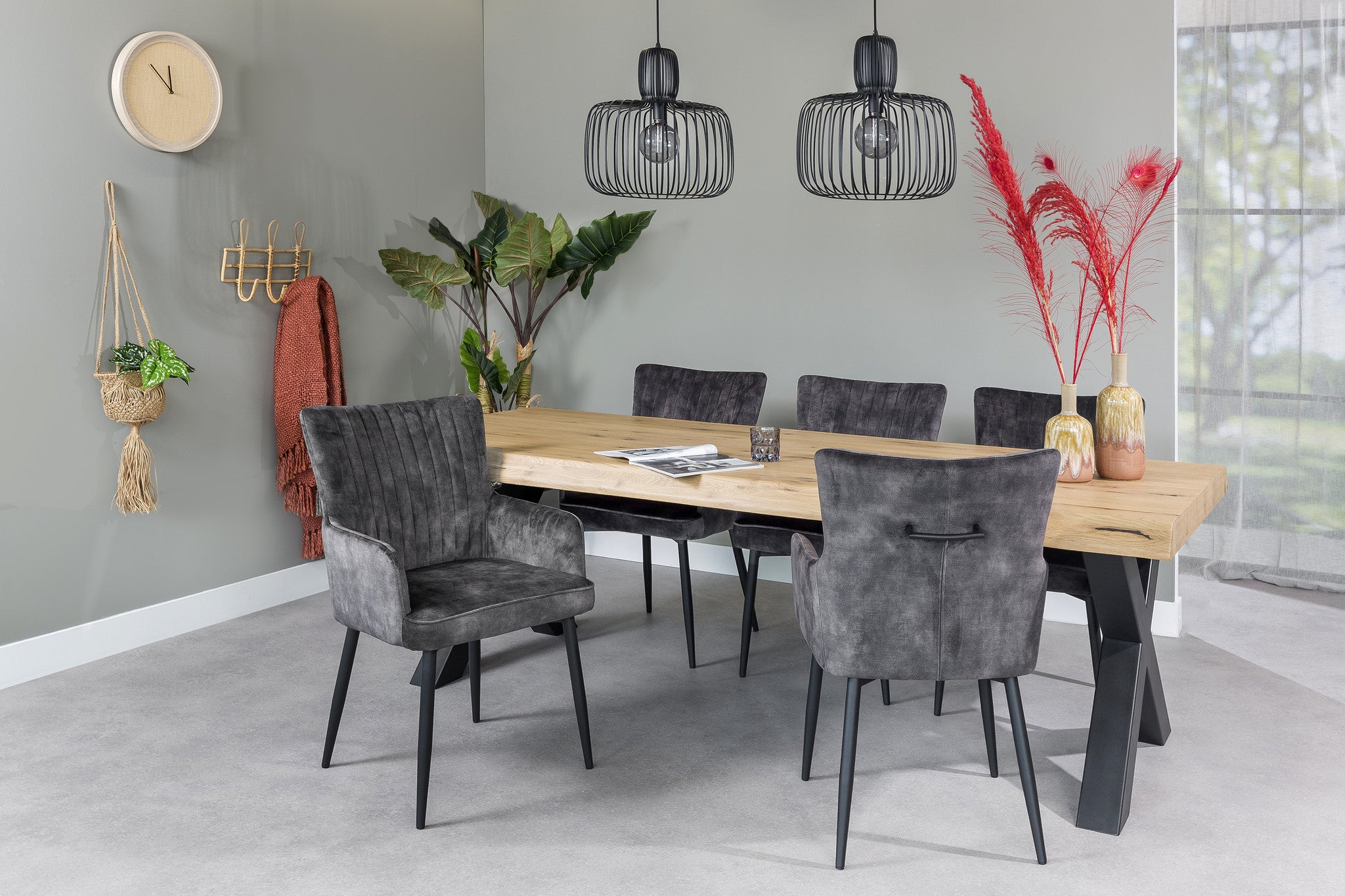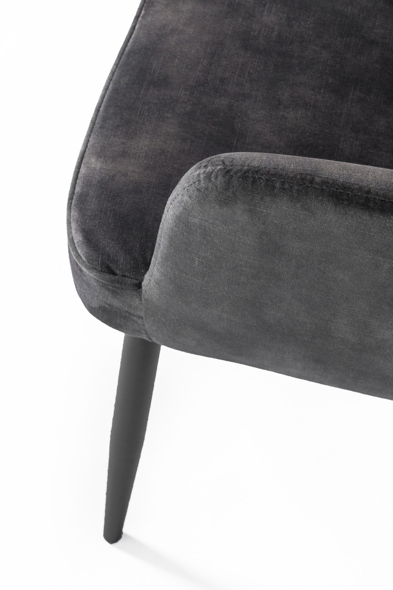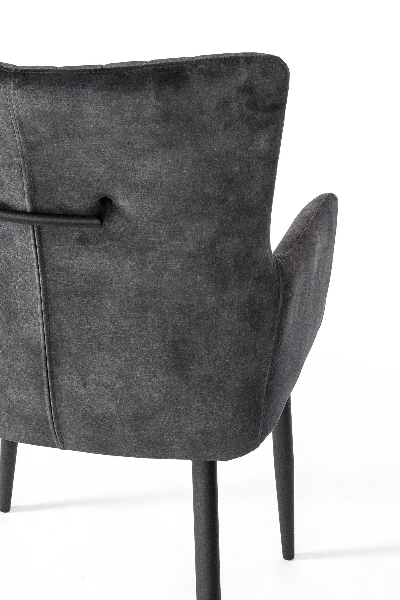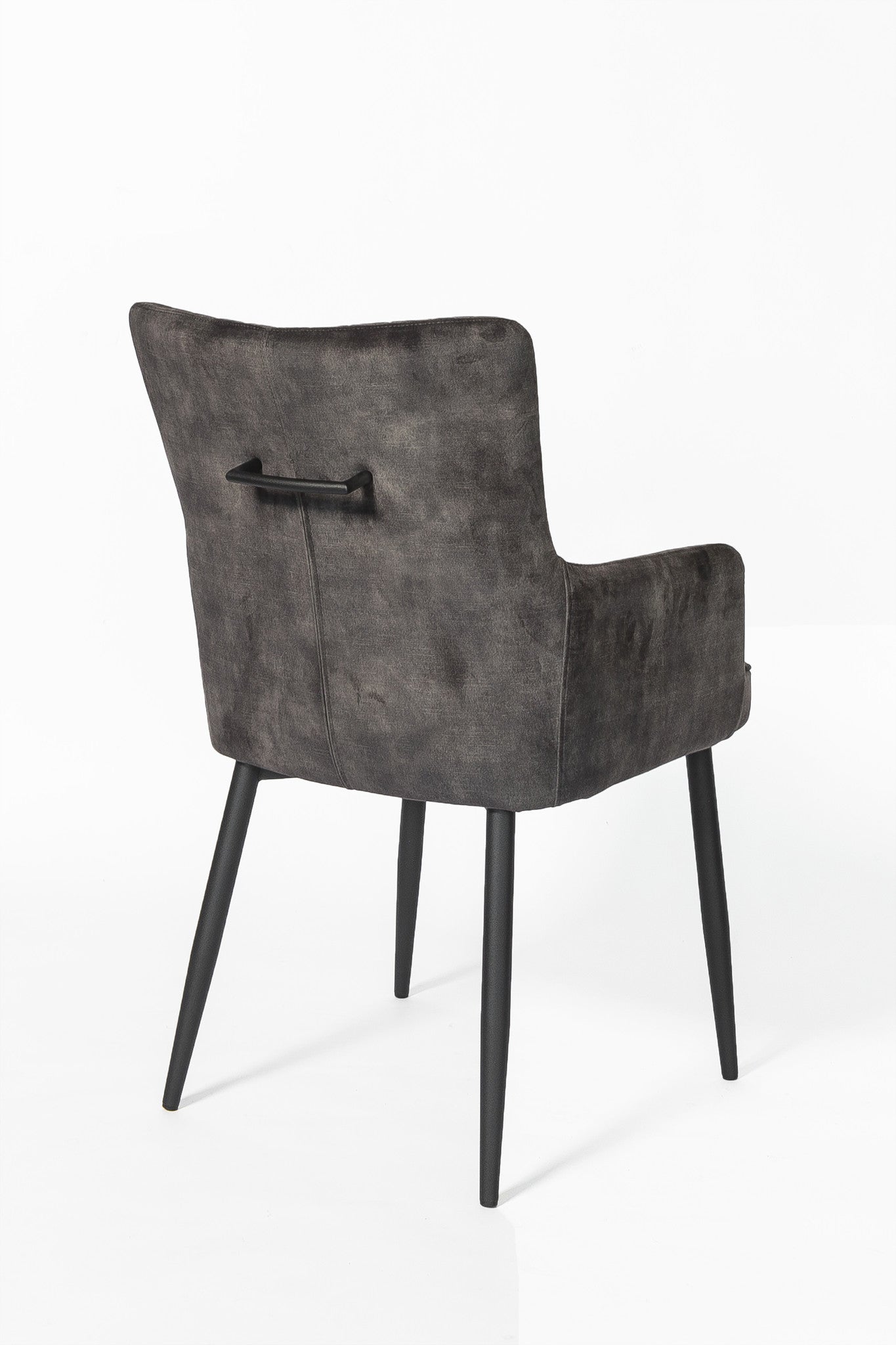 Stripes Velvet - Eetkamerstoelen - set van 2 - armleuningen - fluweel - antraciet - gestreept rugstiksel - handvat Set van 2 Stripes Velvet eetkamerstoelen met armleuningen in fluweel antraciet, mooi afgewerkte rugleuning met gestreept stiksel en voorzien van een handvat op de achterzijde. Zwart stalen poten