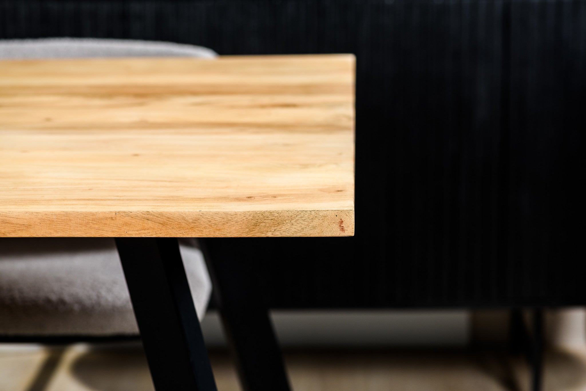 Deze eetkamertafel is gemaakt van hoogwaardig acaciahout en is voorzien van 4 schuine stalen poten. Deze combinatie zorgt ervoor dat de tafel een stevige basis heeft en tegelijkertijd een stijlvolle uitstraling heeft. De tafel is afgewerkt met een naturel kleur en de poten zijn zwart van kleur. Hierdoor krijgt de tafel een ruige, doch rustgevende Scandinavische look. Deze eetkamertafel is een echte must-have voor je interieur. eettafel - interieur - interieurinspiratie - eetkamer - interior - meubels - tafel - wooninspiratie - wonen - interieurstyling - interiordesign - eethoek - woonkamer - eetkamerstoelen - interieurdesign - diningtable - eetkamertafel - sfeervolwonen - stoerwonen - inspiratie - home - eetkamerinspiratie - meubelen - hout