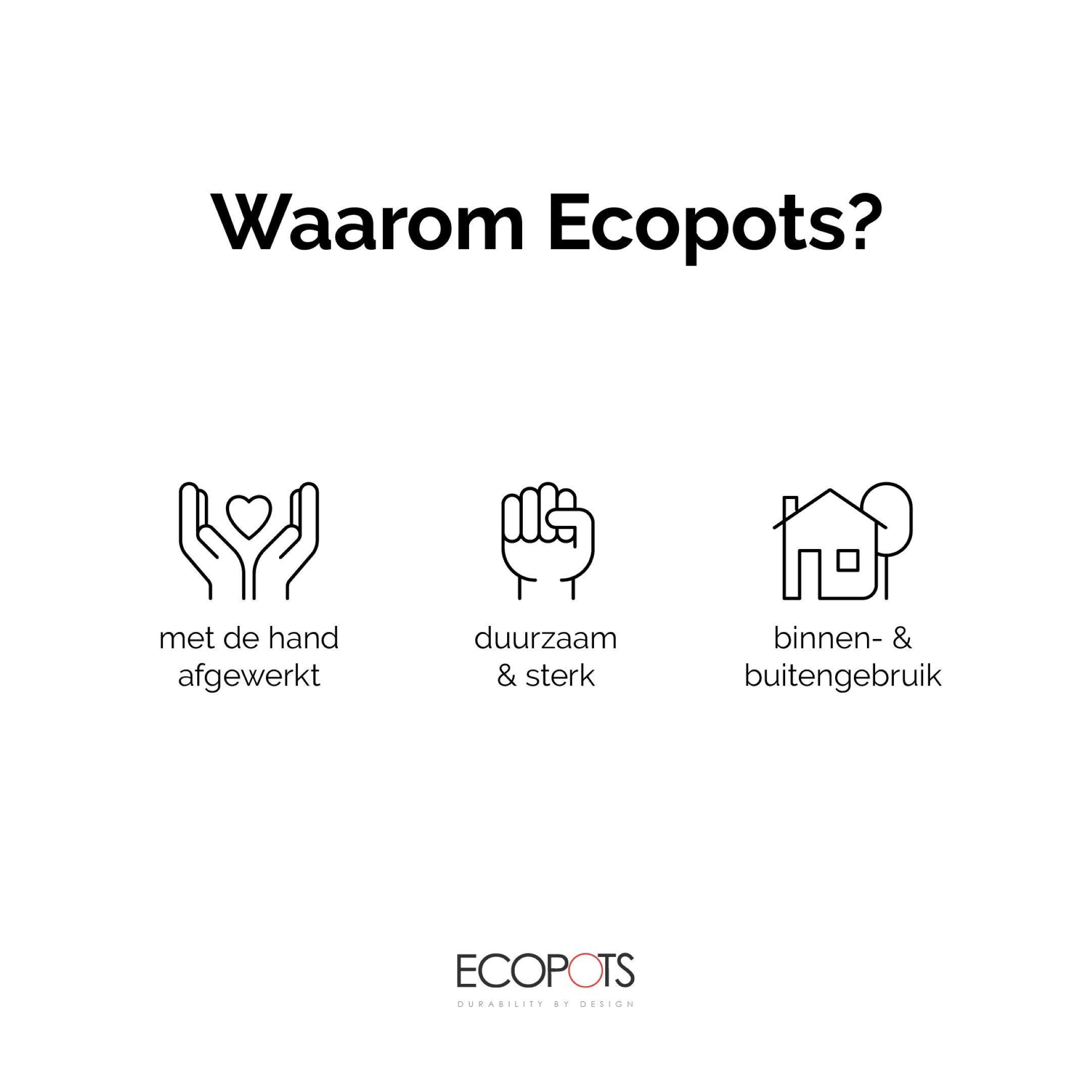 Ecopots is een stijlvolle Belgische bloempottenlijn. De Ecopots bloempotten zijn vervaardigd uit recyclebaar kunststof waardoor de potten echt groen zijn. Dit materiaal is bovendien van uitstekende kwaliteit waardoor je op alle Ecopots wel 10 jaar garantie krijgt. Een prachtige toevoeging aan ieder (tuin)interieur!
