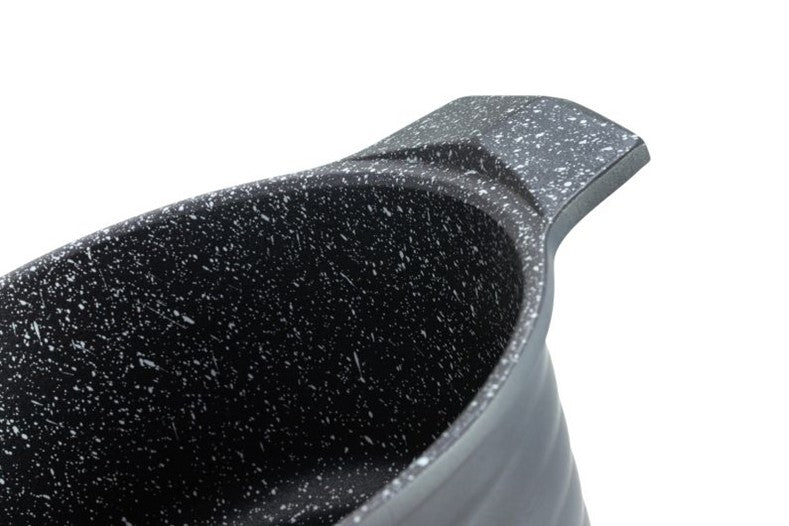 Deze prachtige pannenset van Edënbërg wordt geproduceerd onder de strengste Duitse normen en met het beste aluminium. De bodem is bedekt met maar liefst 3 lagen marmer met een mooie zwarte binnenkant die niet verkleurd. Dankzij de dikke bodem zijn de pannen zeer duurzaam en wordt het eten gelijkmatig verwarmd. De 3 lagen marmer bodem is de beste anti-aanbaklaag die je je kunt wensen. Het materiaal is tot wel 7 x sterker dan een traditionele anti-aanbaklaag en eten kan niet aankoeken. Je kunt daardoor zonder of met een klein beetje olie of boter gezonde maar ook lekkere gerechten op tafel zetten. Darnaast zijn de pannen door de marmeren lagen veel makkelijker met de hand of in de vaatwasser schoon te maken. De marmeren lagen behouden hun klaar, zijn minder kwetsbaar, distribueren warmte perfect en bevatten absoluut GÉÉN gifitige stoffen. Wat wilt de professionele of hobby kok nog meer? De uitgebreide set is ideaal voor de starter maar ook voor de ervaren kok ter vervanging of aanvulling van de huidige pannen. Of je nu voor iedereen een visje wilt grillen op de plaat, een stukje vlees wilt bakken in de pannen, een verse saus bereiden of de groenten koken: het kan allemaal op een gemakkelijk wijze zonder aankoeken en moeilijk schoonmaken. Belangrijkste kenmerken :
