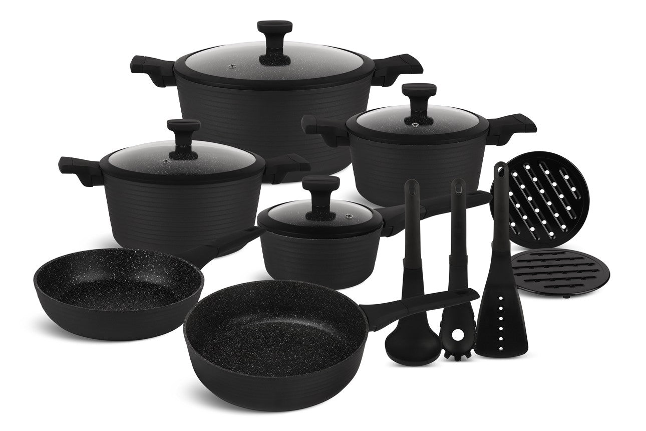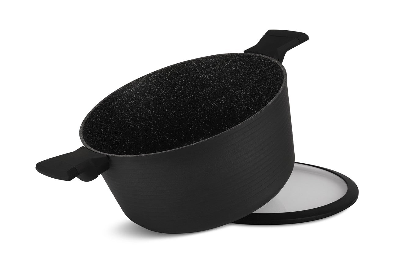 Deze prachtige pannenset van Edënbërg wordt geproduceerd onder de strengste Duitse normen en met het beste aluminium. De bodem is bedekt met maar liefst 3 lagen marmer met een mooie zwarte binnenkant die niet verkleurd. Dankzij de dikke bodem zijn de pannen zeer duurzaam en wordt het eten gelijkmatig verwarmd. De 3 lagen marmer bodem is de beste anti-aanbaklaag die je je kunt wensen. Het materiaal is tot wel 7 x sterker dan een traditionele anti-aanbaklaag en eten kan niet aankoeken. Je kunt daardoor zonder of met een klein beetje olie of boter gezonde maar ook lekkere gerechten op tafel zetten. Darnaast zijn de pannen door de marmeren lagen veel makkelijker met de hand of in de vaatwasser schoon te maken. De marmeren lagen behouden hun klaar, zijn minder kwetsbaar, distribueren warmte perfect en bevatten absoluut GÉÉN gifitige stoffen. Wat wilt de professionele of hobby kok nog meer? De uitgebreide set is ideaal voor de starter maar ook voor de ervaren kok ter vervanging of aanvulling van de huidige pannen. Of je nu voor iedereen een visje wilt grillen op de plaat, een stukje vlees wilt bakken in de pannen, een verse saus bereiden of de groenten koken: het kan allemaal op een gemakkelijk wijze zonder aankoeken en moeilijk schoonmaken. Belangrijkste kenmerken :