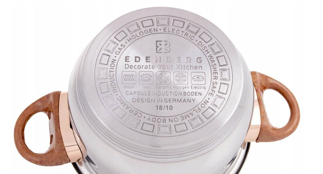 Prachtige 12-delige pannenset van hoge kwaliteit. Een set gemaakt van hoogwaardig roestvrij staal. Product gerenommeerde merk EDËNBËRG. De bodem is 5 laags voor behoud van warmte. In de pan zit een praktische maataanduiding voor gebruiksgemak.